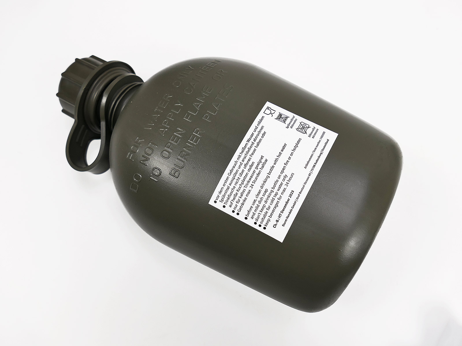 Set wie abgebildet, bestehend aus Feldflasche, Becher und Feldflaschenbezug.