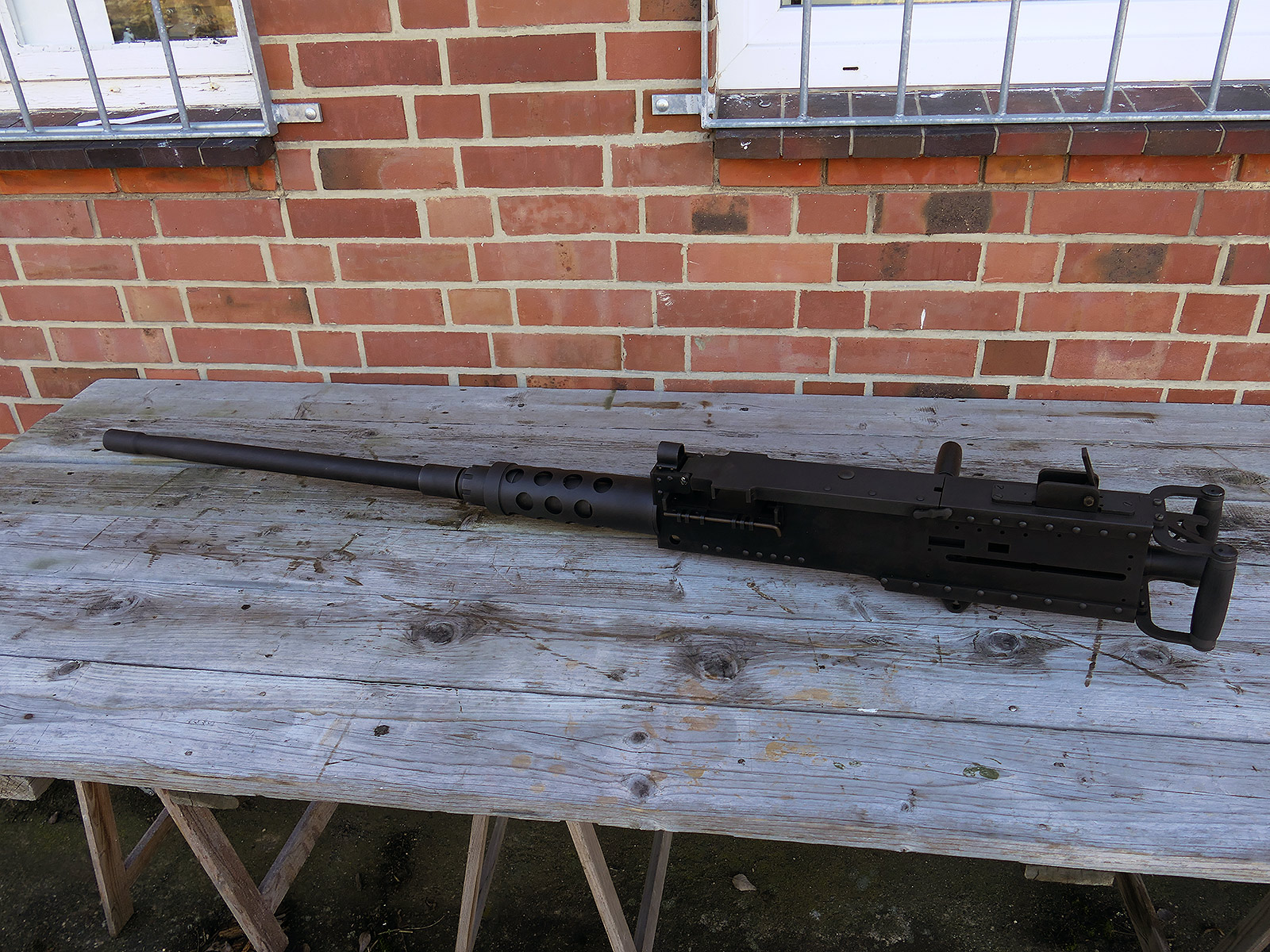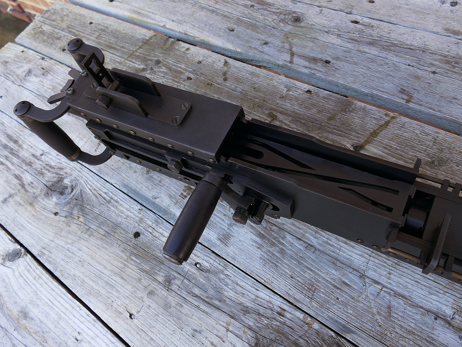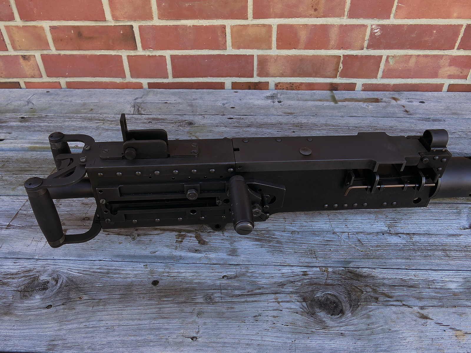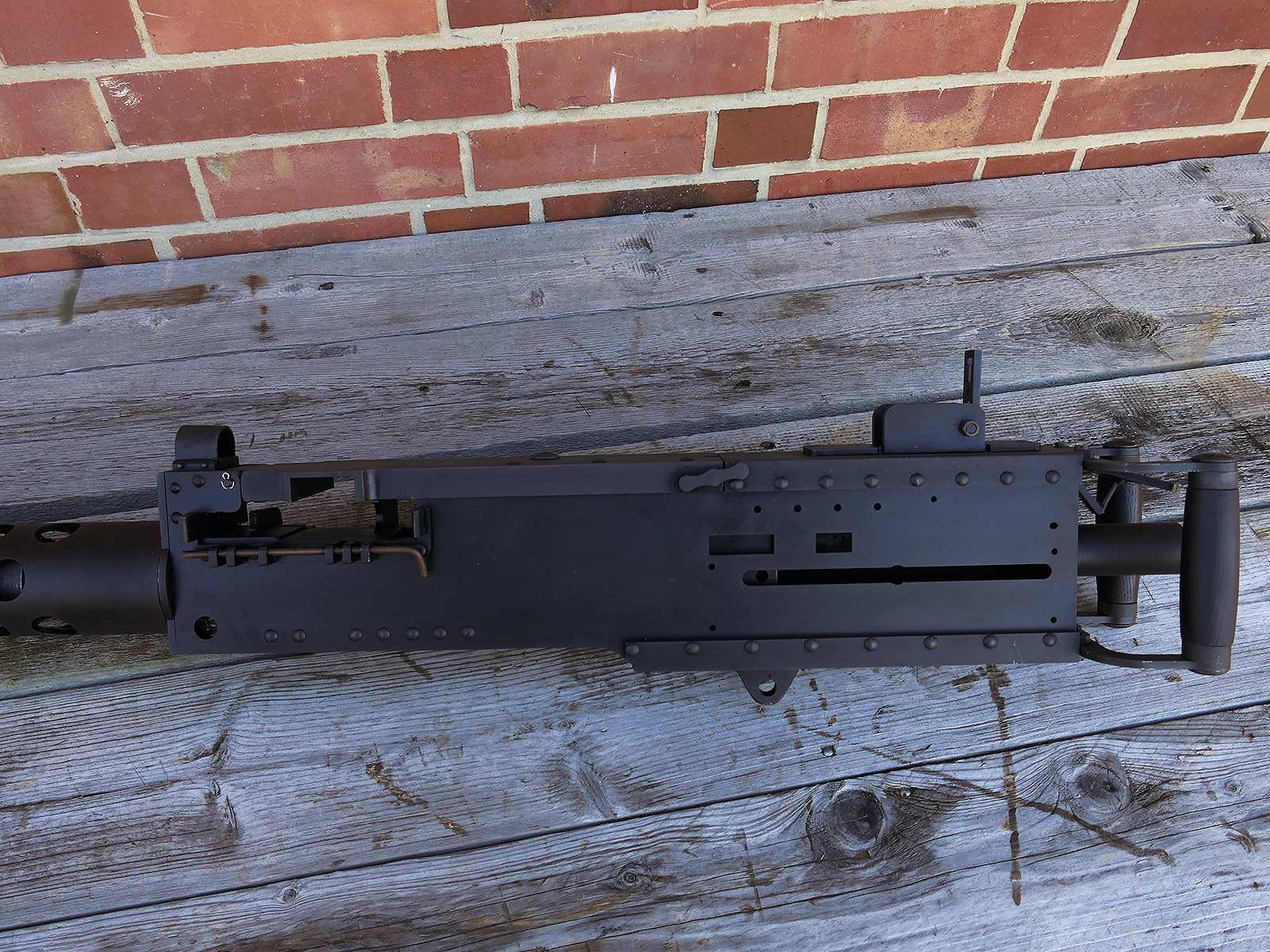 Der Spannhebel ist beweglich und zieht den angedeuteten "Verschluss" zurück. Der Verschluss rastet aber nicht ein in der hinteren Position. Der Handgriff zum Spannen ist für den Transport abschraubbar. Das Modell wiegt mit dem Lauf ca. 31 KG. Der Einzelfeuer und Dauerfeuerabzug ist beweglich . Der Lauf ist massiv und die Mündungsöffnung mit einer Bohrung angedeutet, der Lauf lässt sich wie beim Original entnehmen und ist zerlegbar, somit teilbar für den Transport. Der Lauf wurde von einer Werkzeugfirma hergestellt. Die MG's waren für ein Museum für US Army M113 Panzer bestimmt.