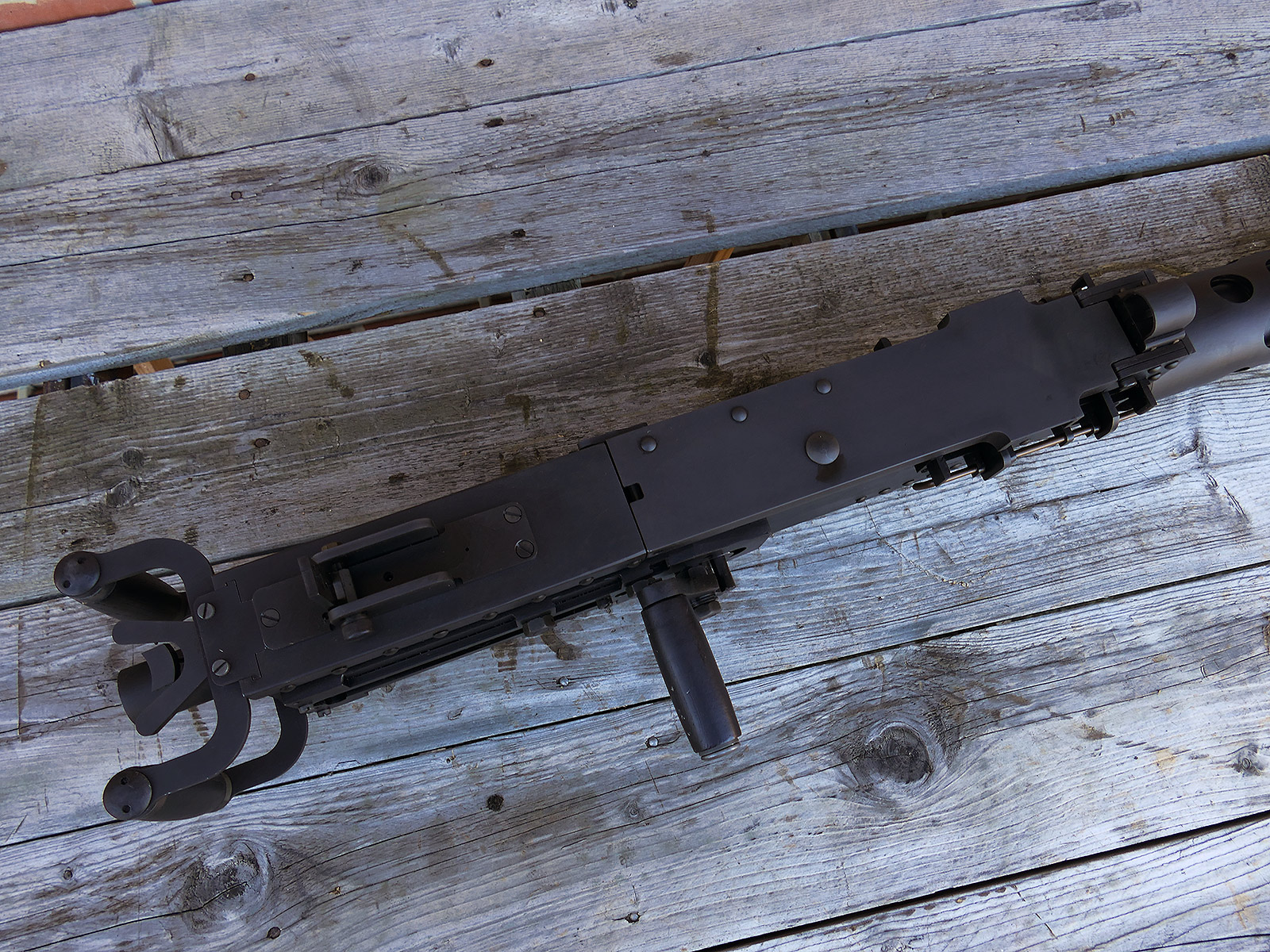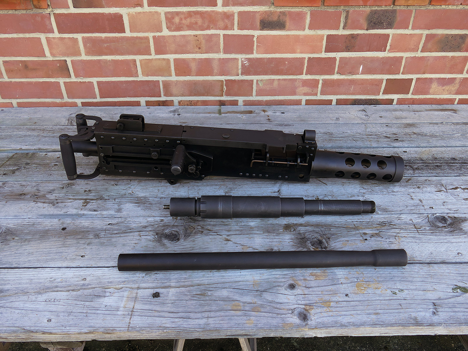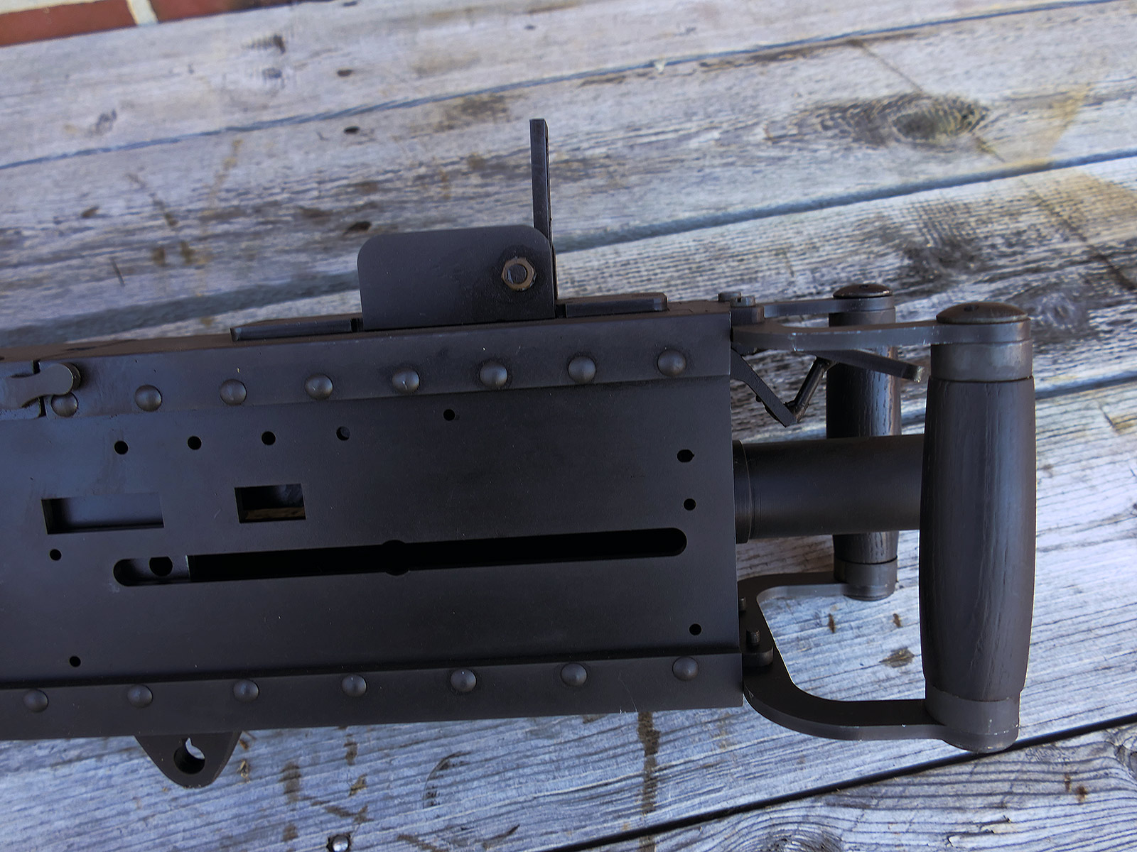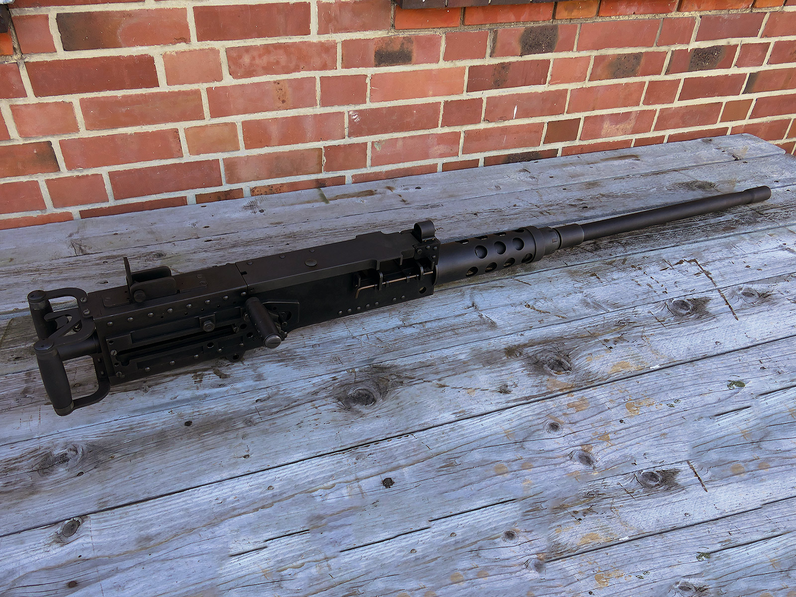 Der Spannhebel ist beweglich und zieht den angedeuteten "Verschluss" zurück. Der Verschluss rastet aber nicht ein in der hinteren Position. Der Handgriff zum Spannen ist für den Transport abschraubbar. Das Modell wiegt mit dem Lauf ca. 31 KG. Der Einzelfeuer und Dauerfeuerabzug ist beweglich . Der Lauf ist massiv und die Mündungsöffnung mit einer Bohrung angedeutet, der Lauf lässt sich wie beim Original entnehmen und ist zerlegbar, somit teilbar für den Transport. Der Lauf wurde von einer Werkzeugfirma hergestellt. Die MG's waren für ein Museum für US Army M113 Panzer bestimmt.