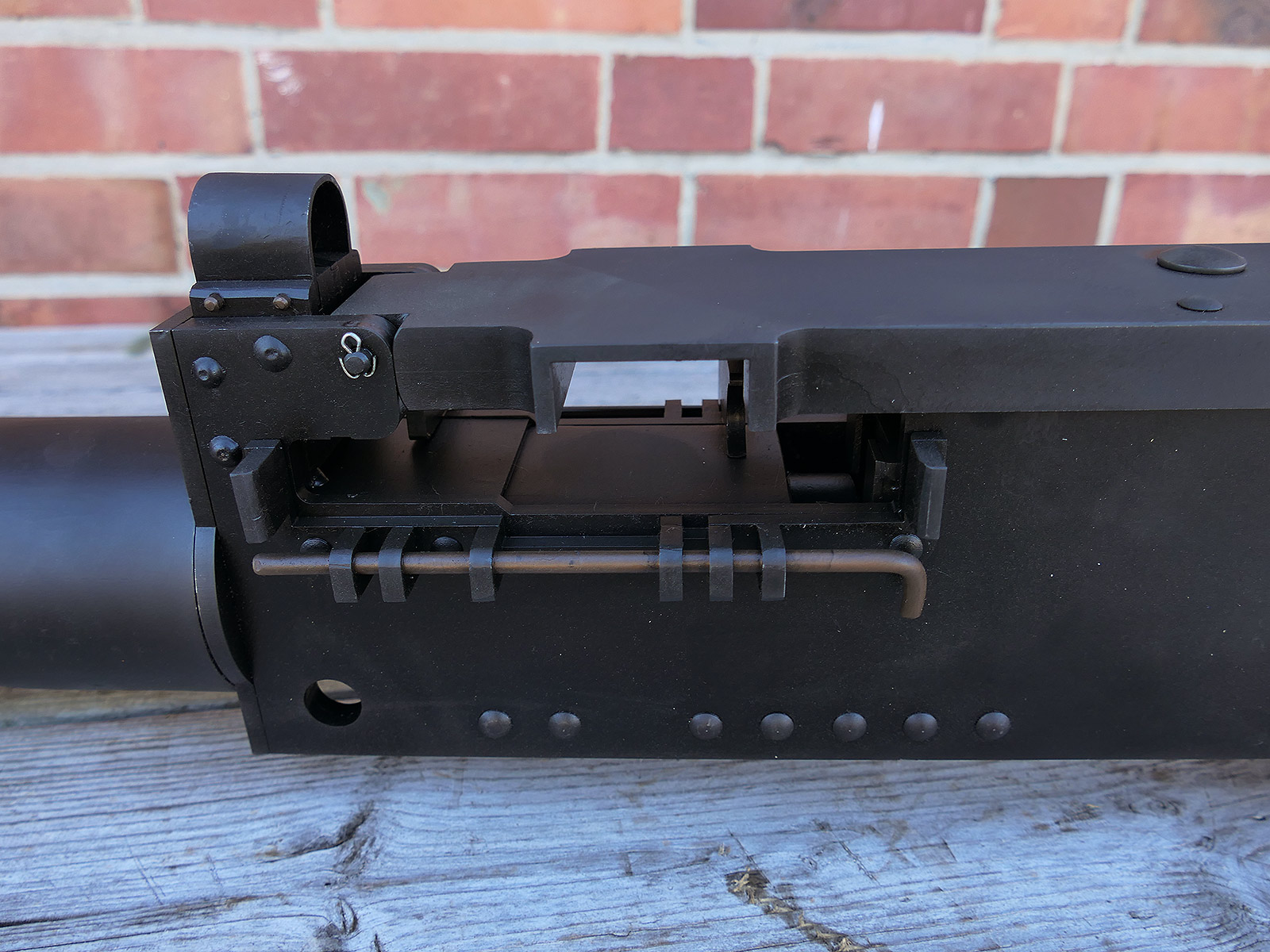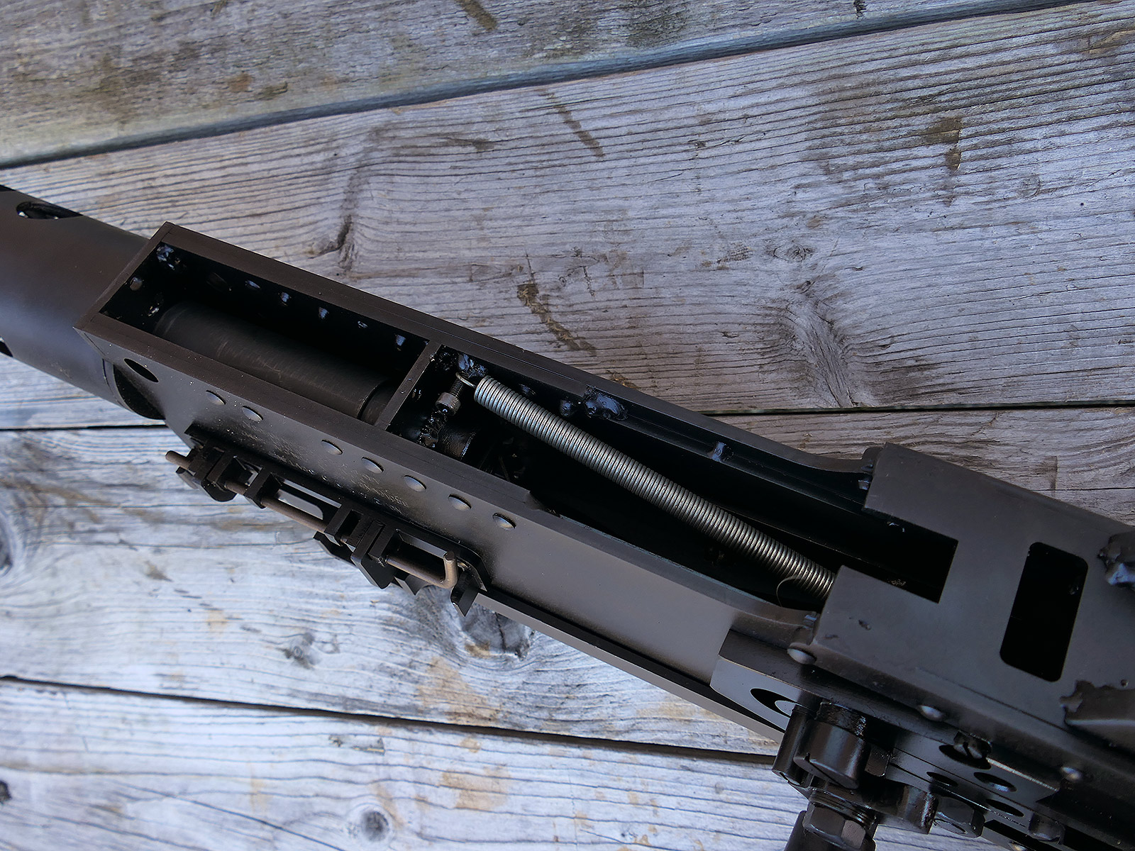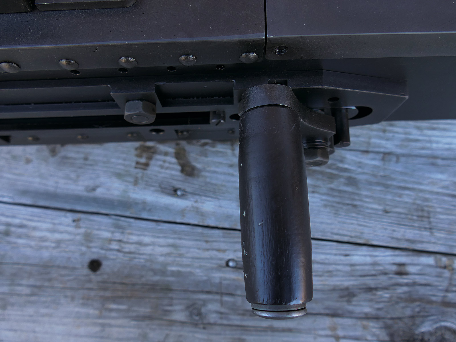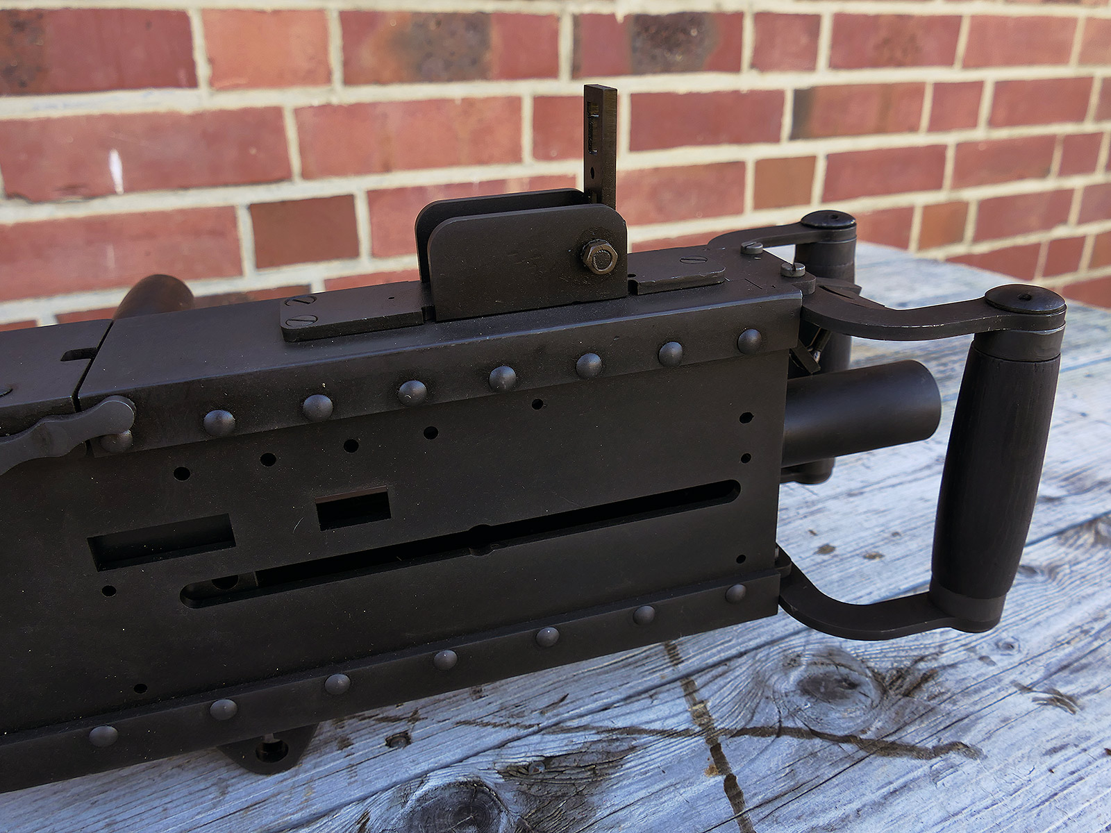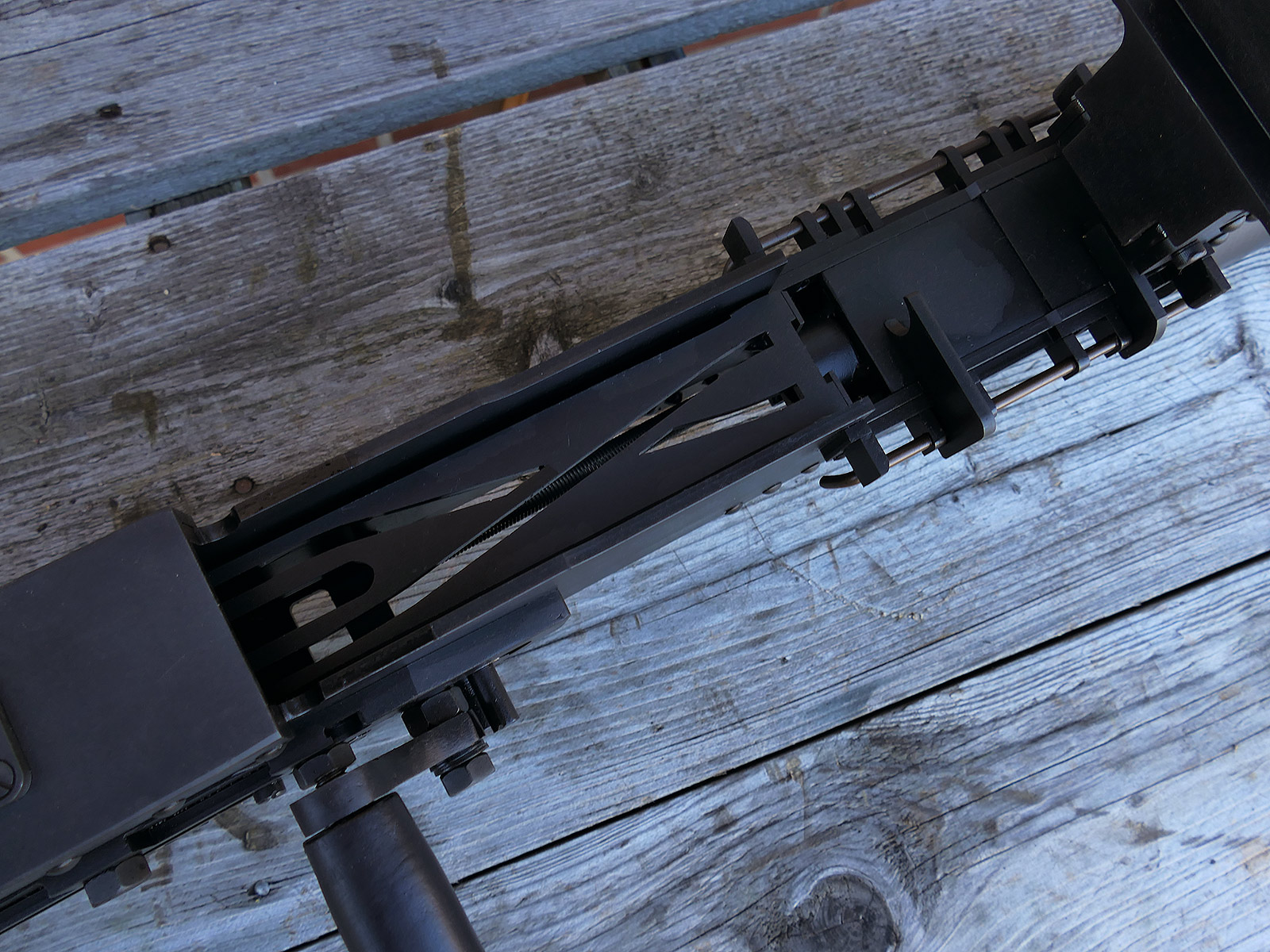 Der Spannhebel ist beweglich und zieht den angedeuteten "Verschluss" zurück. Der Verschluss rastet aber nicht ein in der hinteren Position. Der Handgriff zum Spannen ist für den Transport abschraubbar. Das Modell wiegt mit dem Lauf ca. 31 KG. Der Einzelfeuer und Dauerfeuerabzug ist beweglich . Der Lauf ist massiv und die Mündungsöffnung mit einer Bohrung angedeutet, der Lauf lässt sich wie beim Original entnehmen und ist zerlegbar, somit teilbar für den Transport. Der Lauf wurde von einer Werkzeugfirma hergestellt. Die MG's waren für ein Museum für US Army M113 Panzer bestimmt.