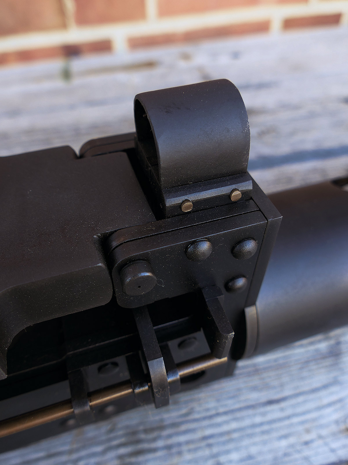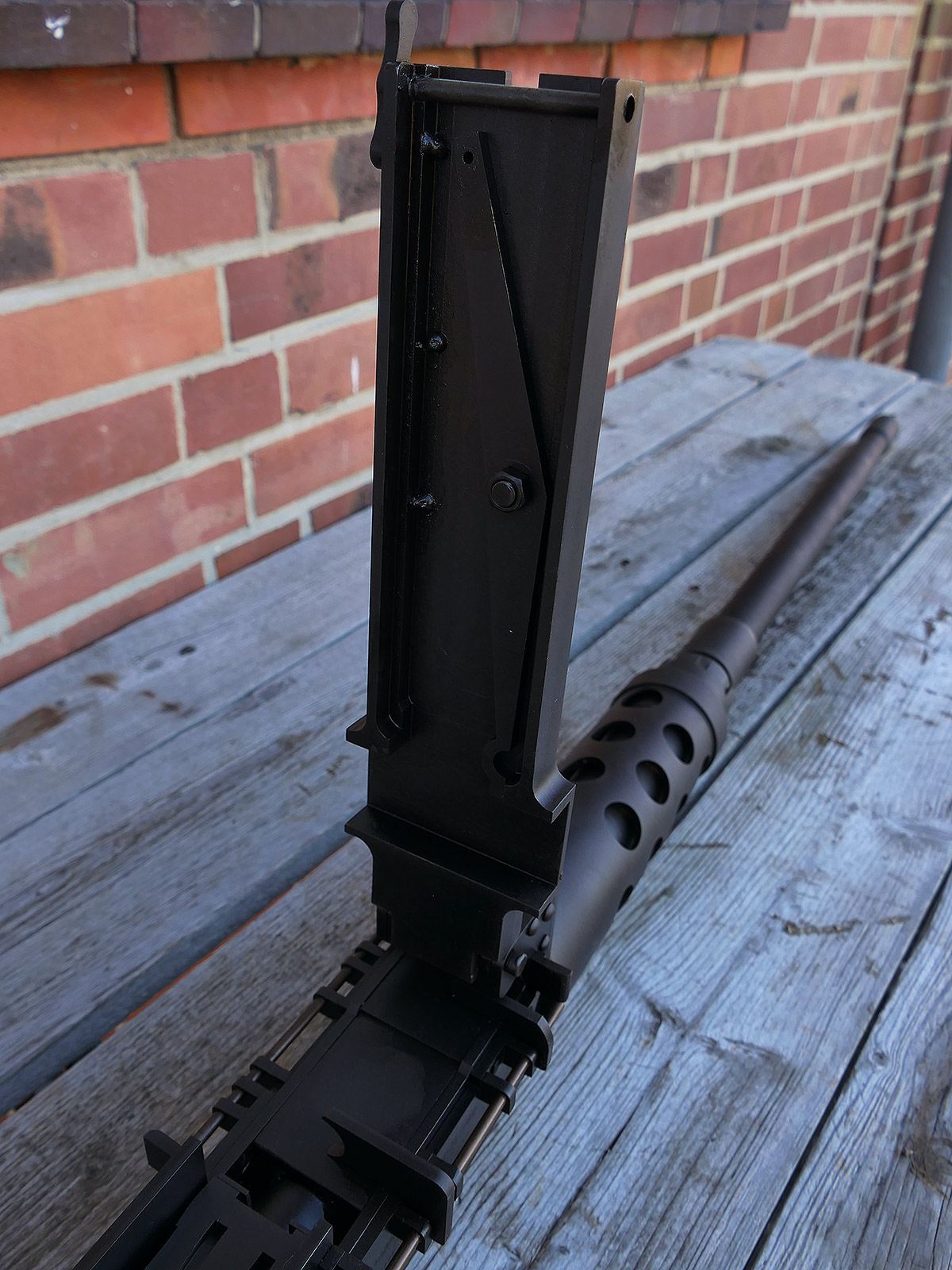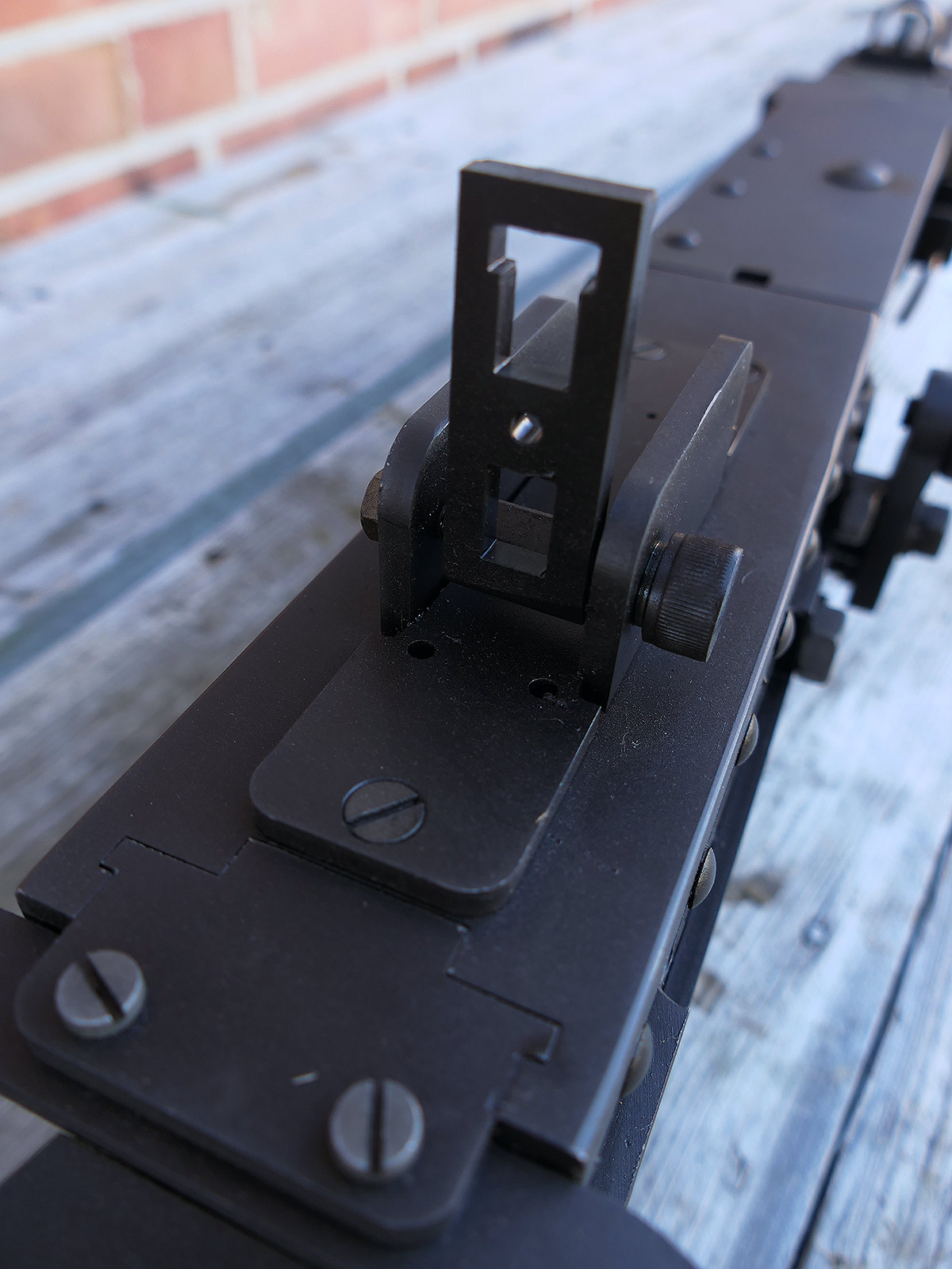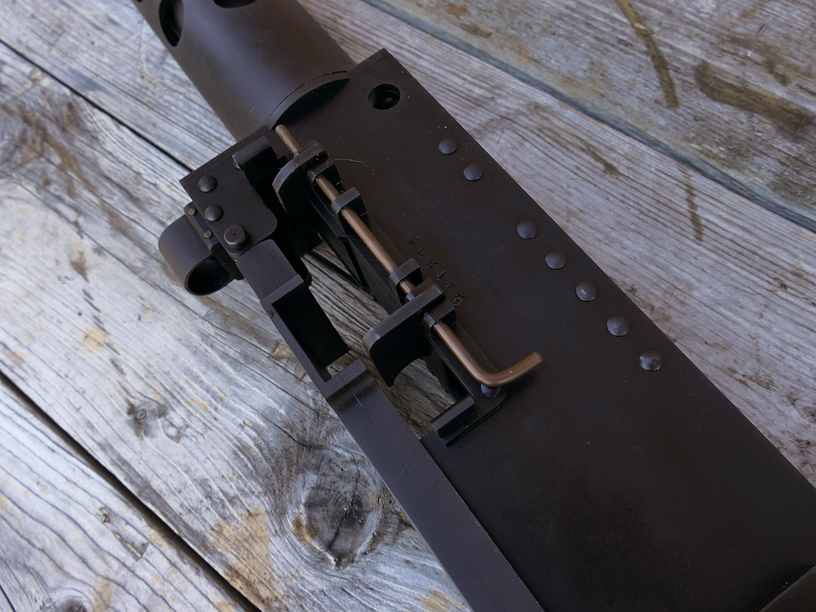 Der Deckel lässt sich öffnen, das Gehäuse ist komplett leer. Das hintere Visier lässt sich aufklappen. Links und rechts lässt sich eine Patronenkiste am Gehäuse befestigen. Diese neuen Modelle sind leider nur in sehr geringer Stückzahl und wohl auch nur einmalig verfügbar weil die Herstellungskosten einfach zu teuer sind, ebenso das Material. Das 50er passt in alle gängigen Mountings der US ARMY.