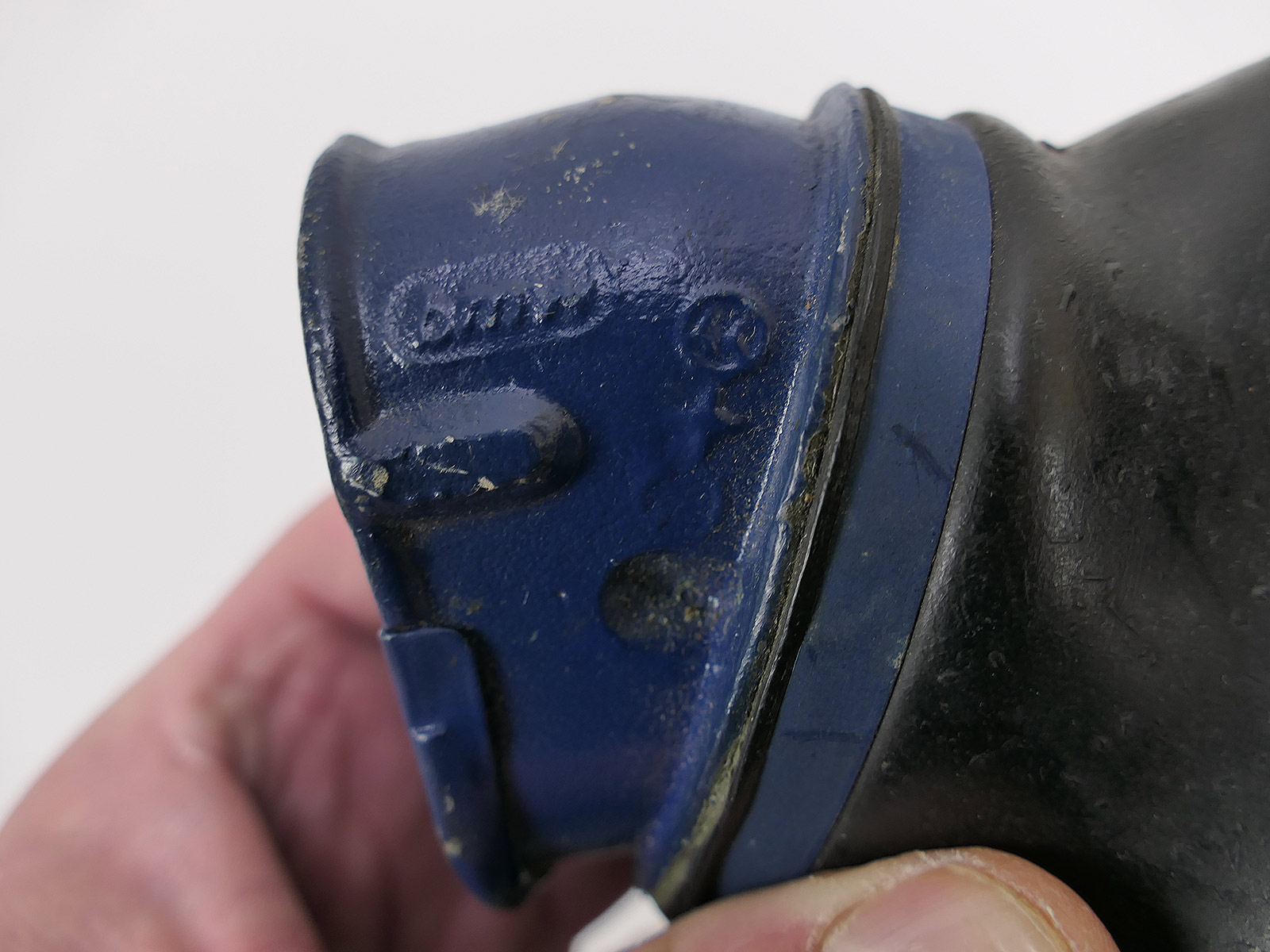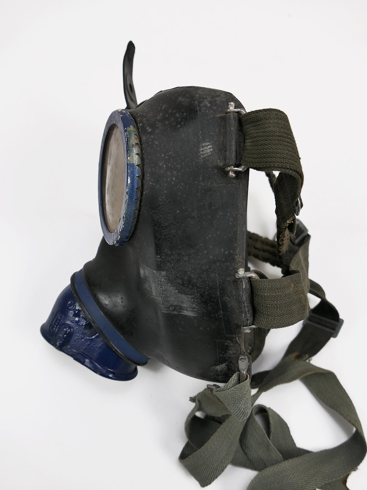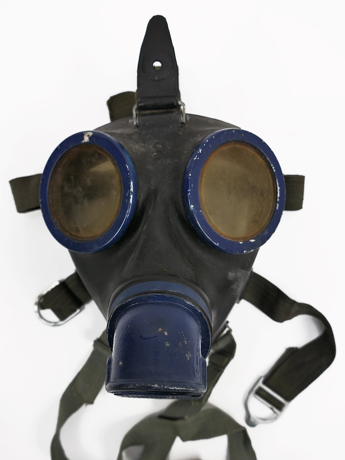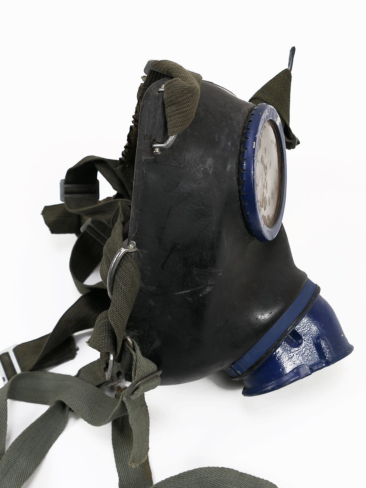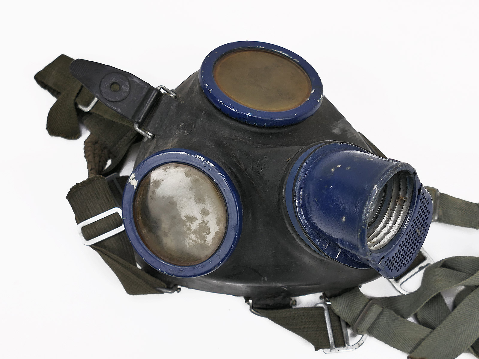 Original Wehrmachts Gasmaske, bmw44, Gummi, schwarz, mit blau lackierten Gläserrändern.