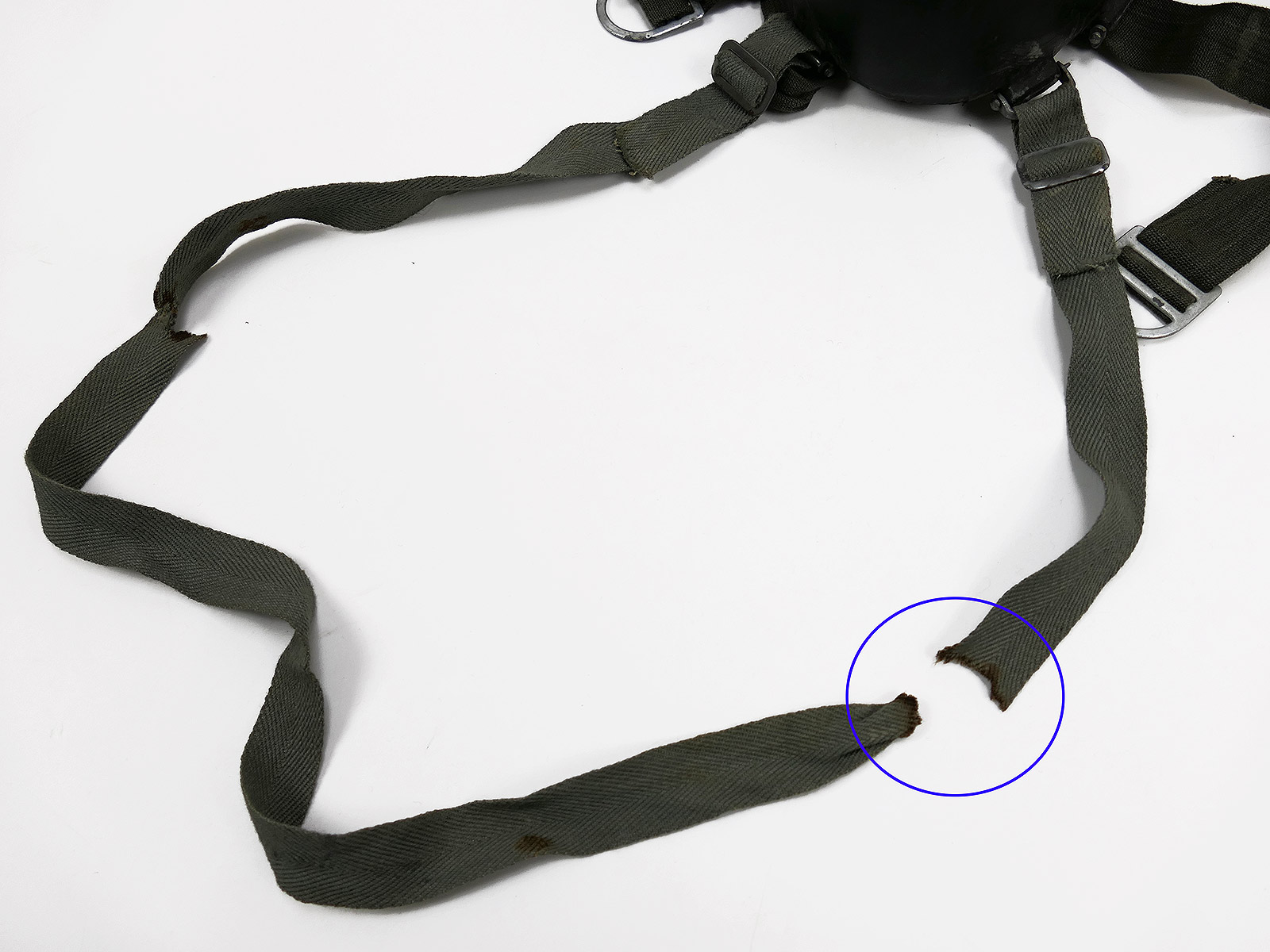 Der lange Umhängeriemen ist an einer Stelle durchgerissen, siehe Bilder.