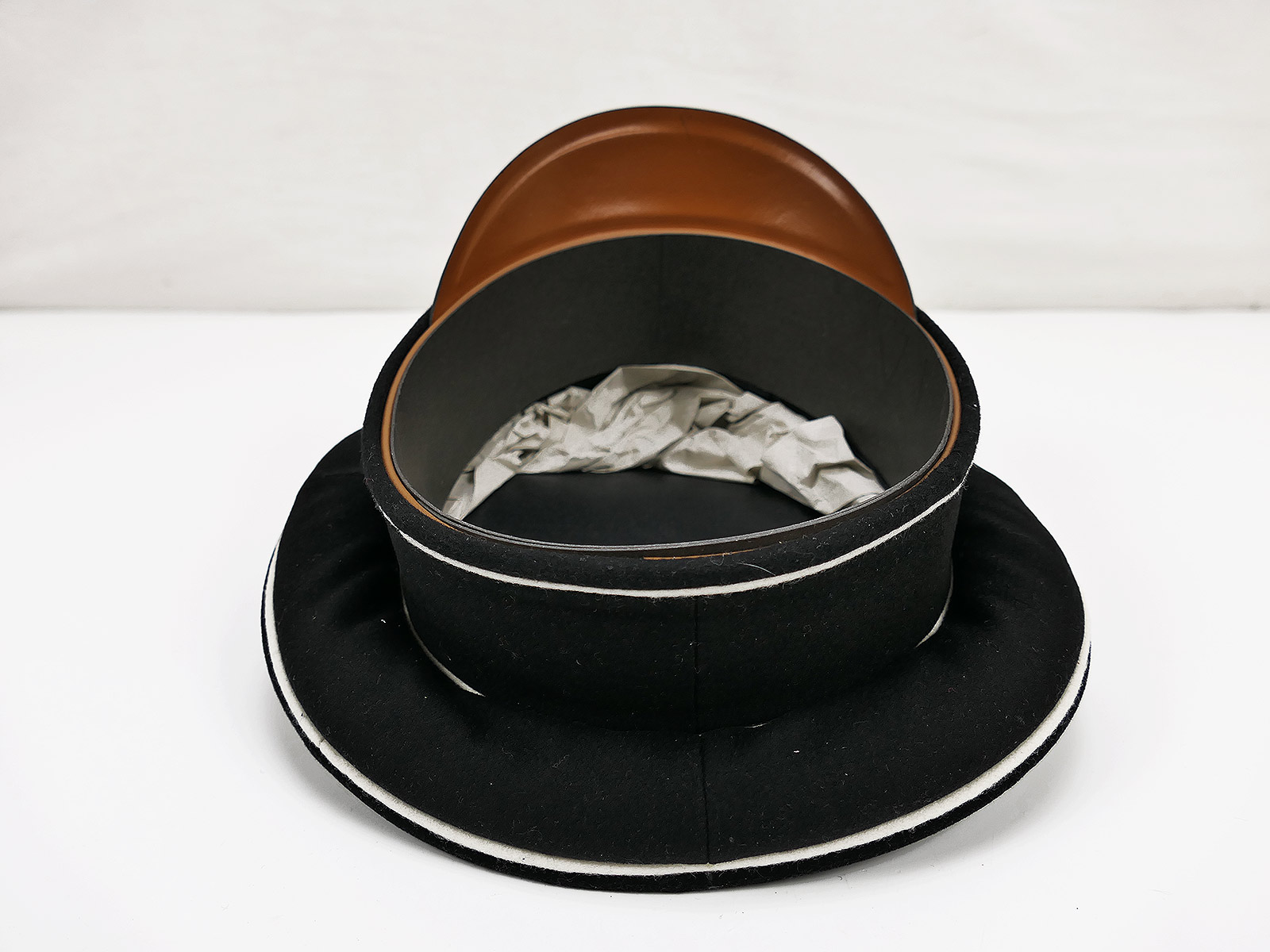 Desweiteren wurde ein originaler, zeitgenössischer VULKANFIBER MÜTZENSCHIRM mit Riffelrückseite verwendet.