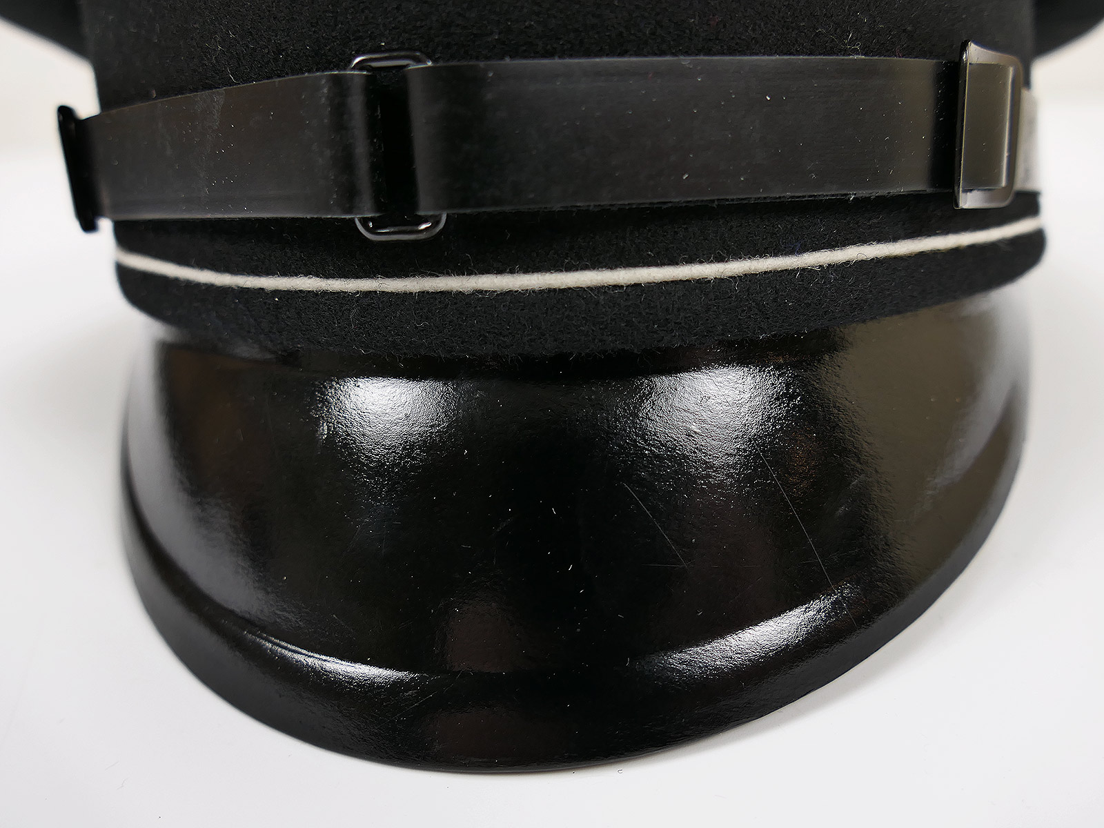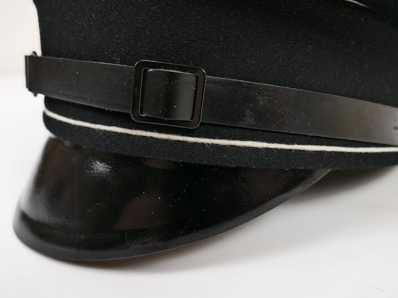 Der Mützenriemen ist aus altem Leder unter Verwendung von Original Beschlagteilen aus der Zeit gefertigt.