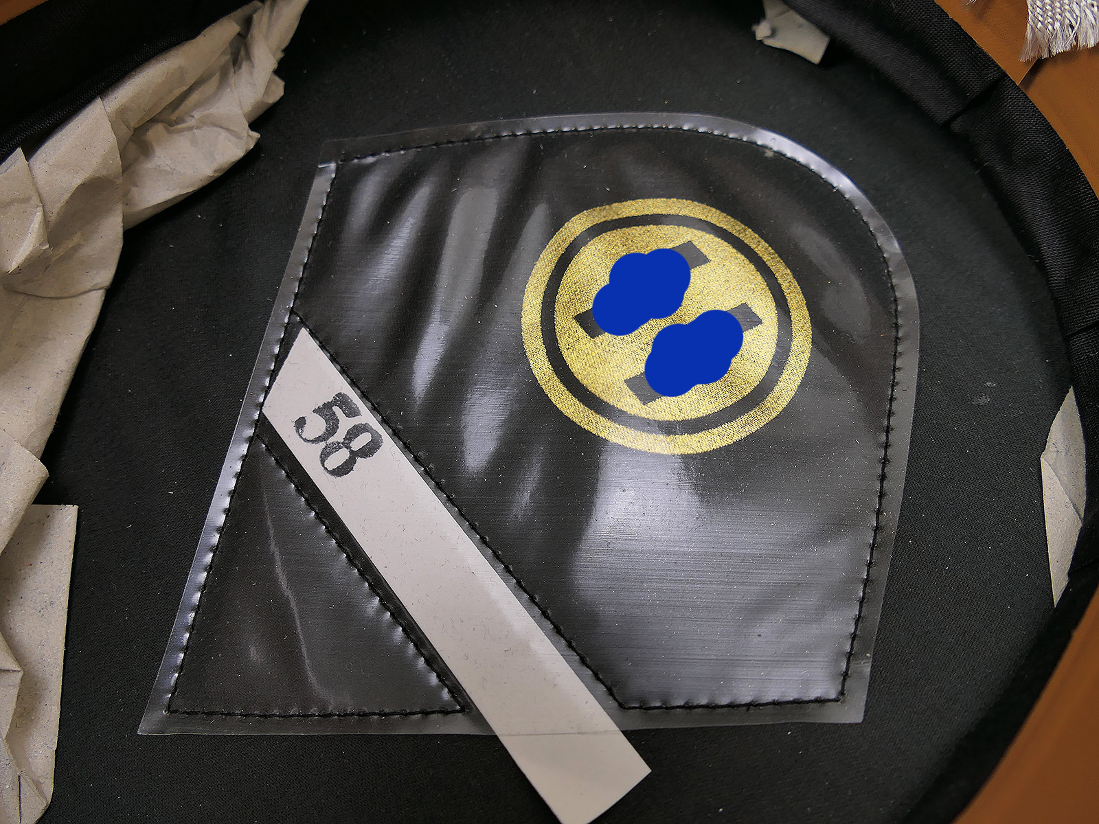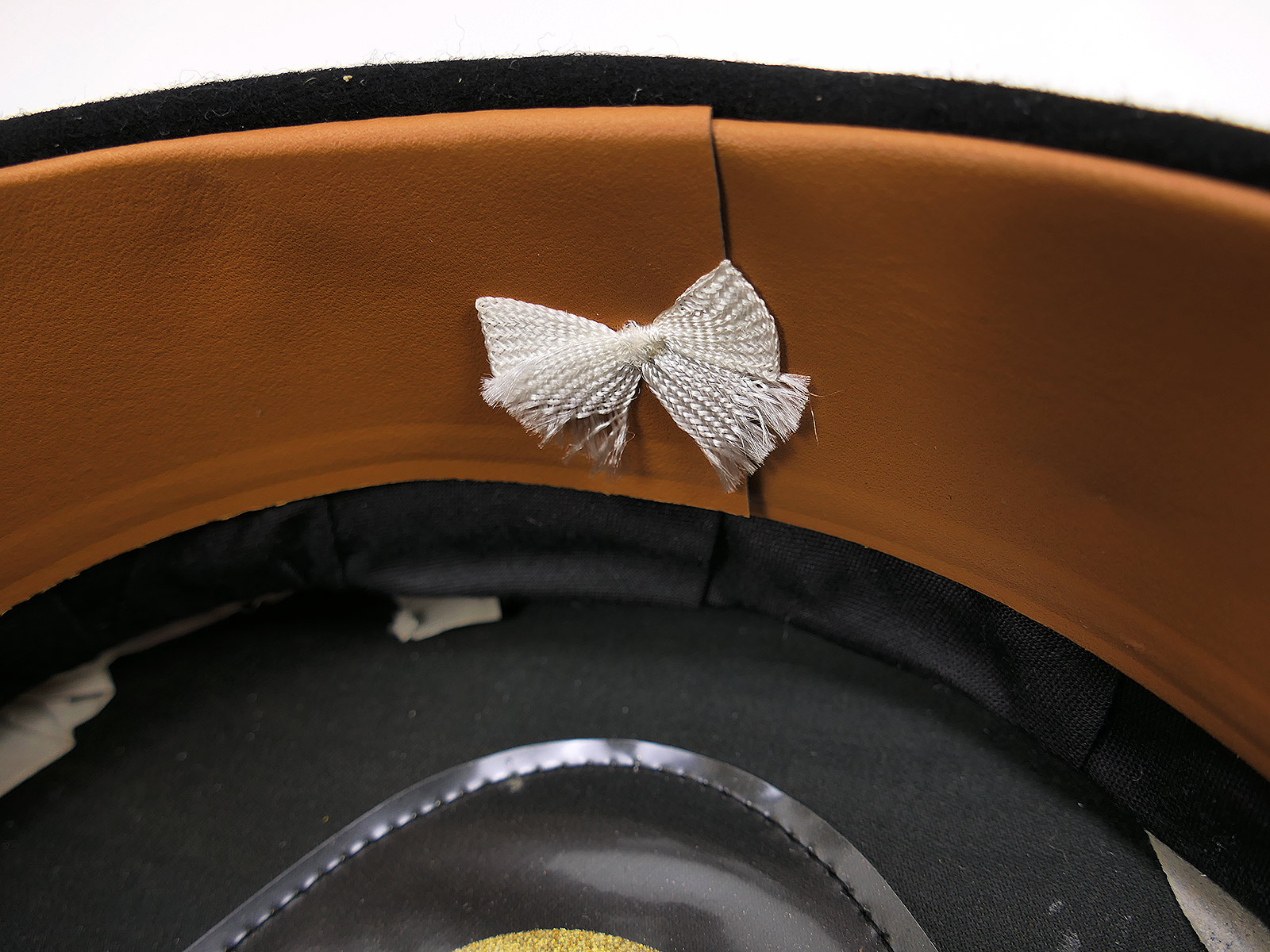 Innenfutter aus schwarzer Baumwolle, erzeugt in den 1930ern. Das Logo ist direkt auf das Futter geprägt.