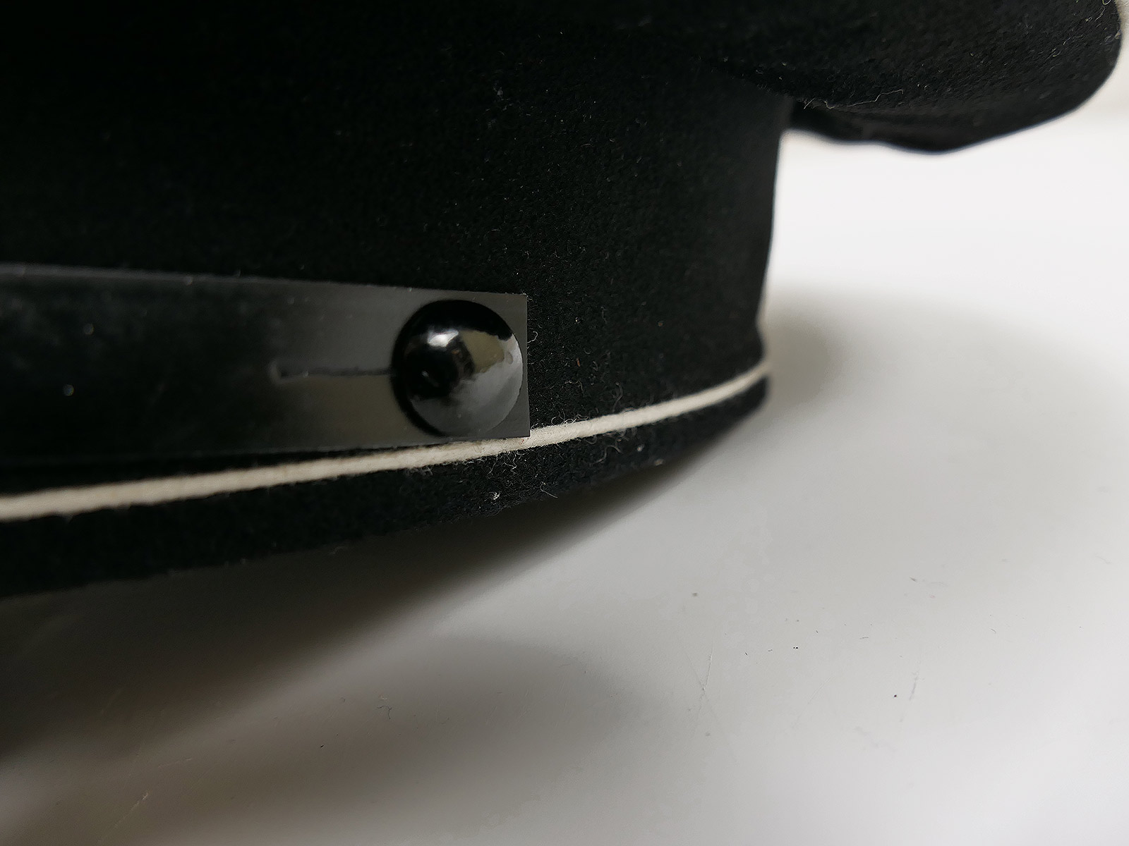 Darüber ein sauber vernähter Mützenspiegel aus ECHTEM CELLULOID (kein Weichplastik).