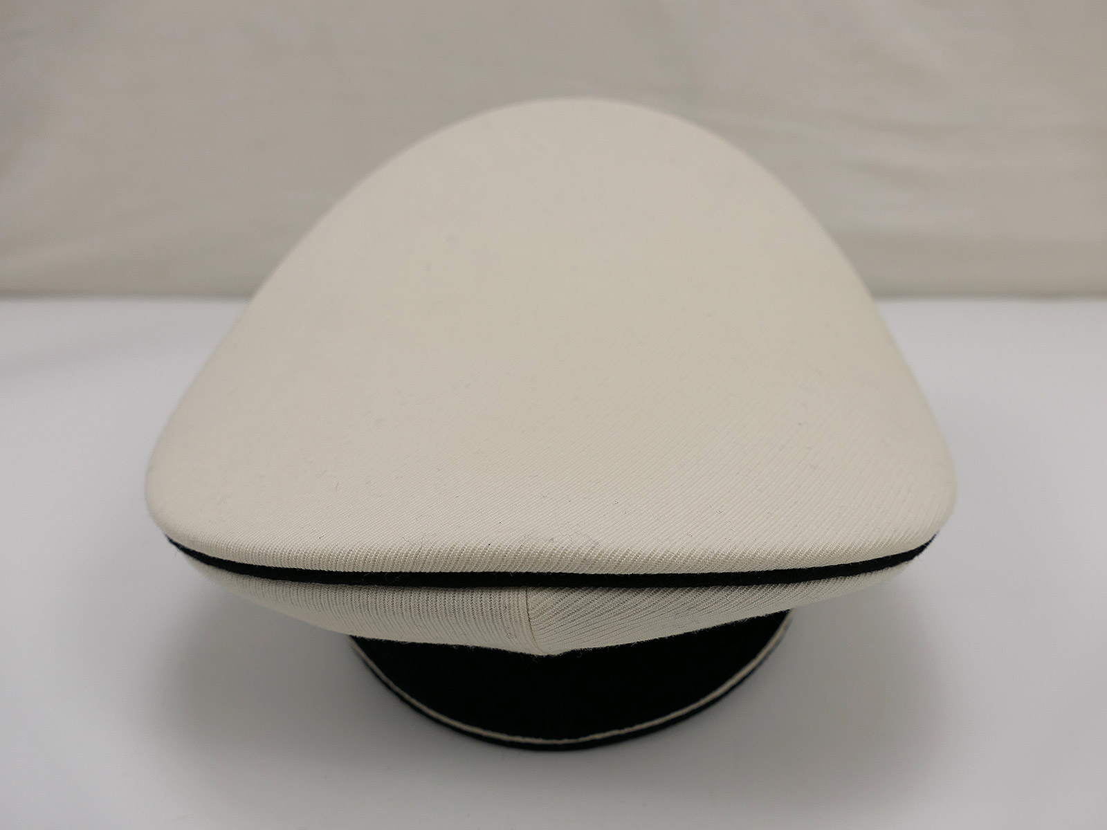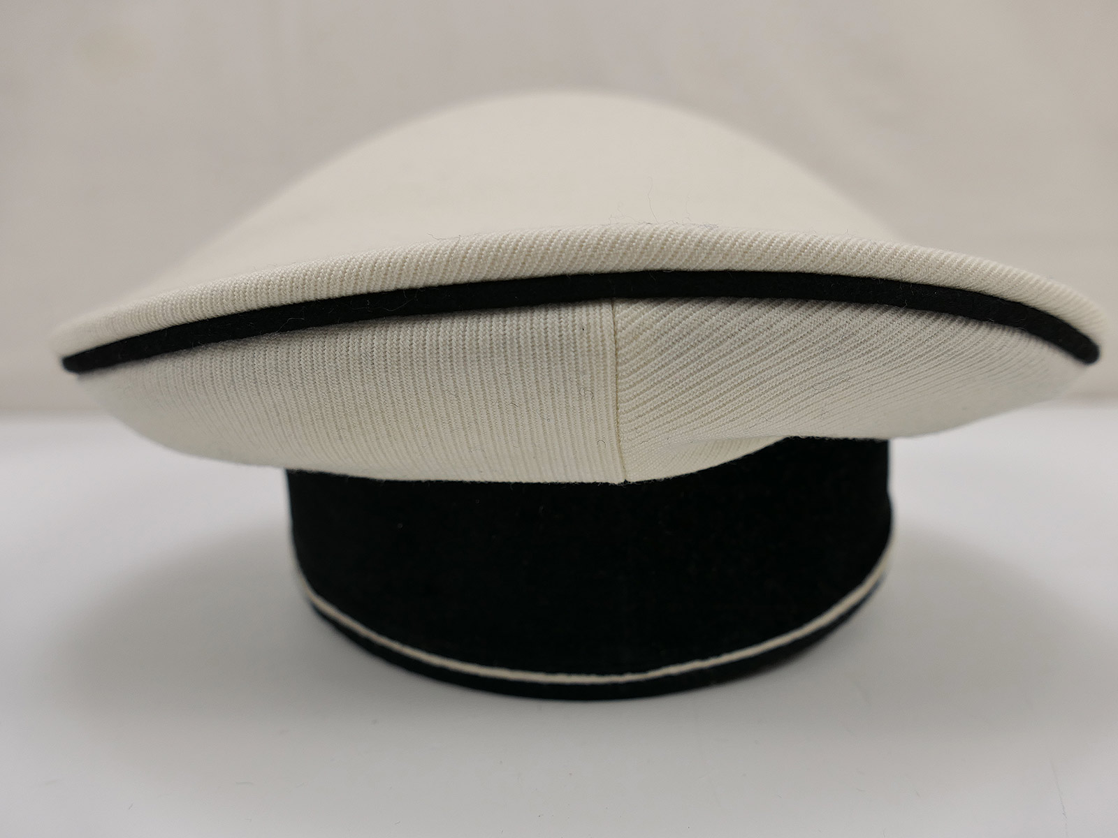 Gefertigt aus hochfeinem, weißen Wolltuch. Der Mützenbund ist aus feinem schwarzen Baumwollsamt gefertigt.