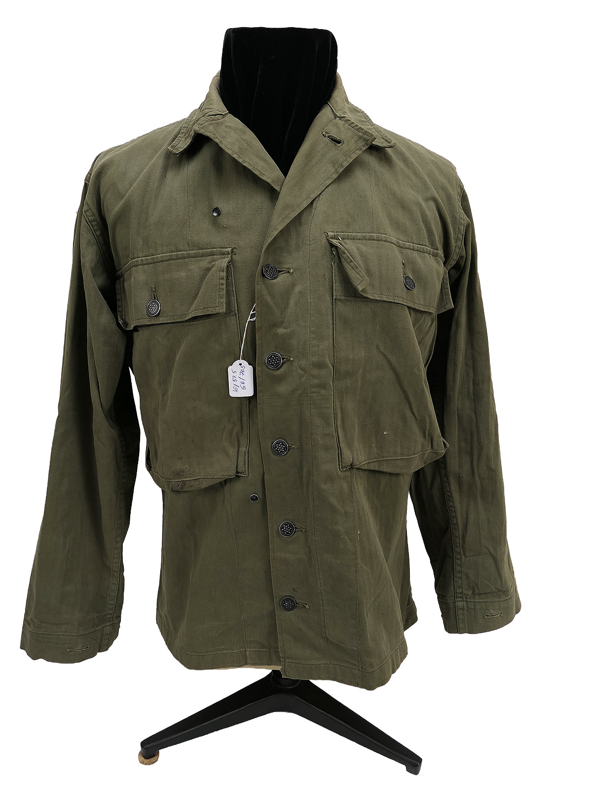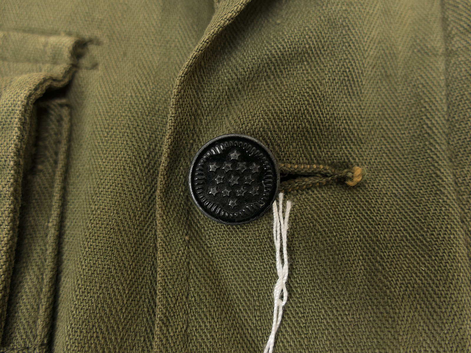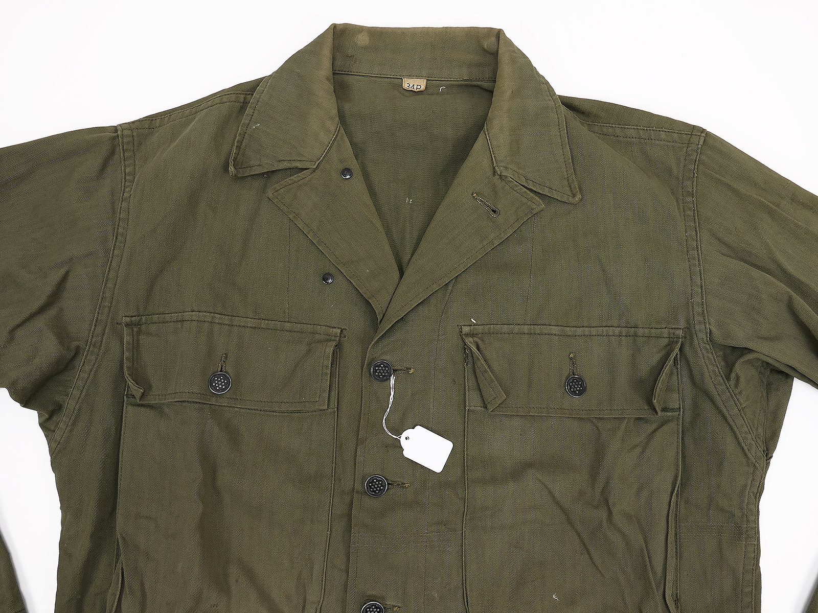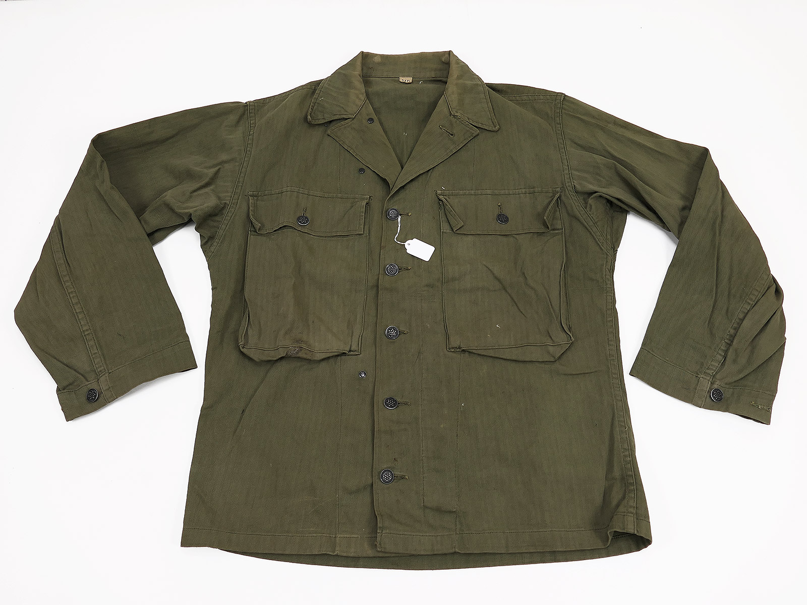 Aus U.S. SammlungsauflösungOriginal US ARMY WW2 HBT Jacket, O.D.7, 13 star buttons, datiert 1943.Größe: 36R = Small / R