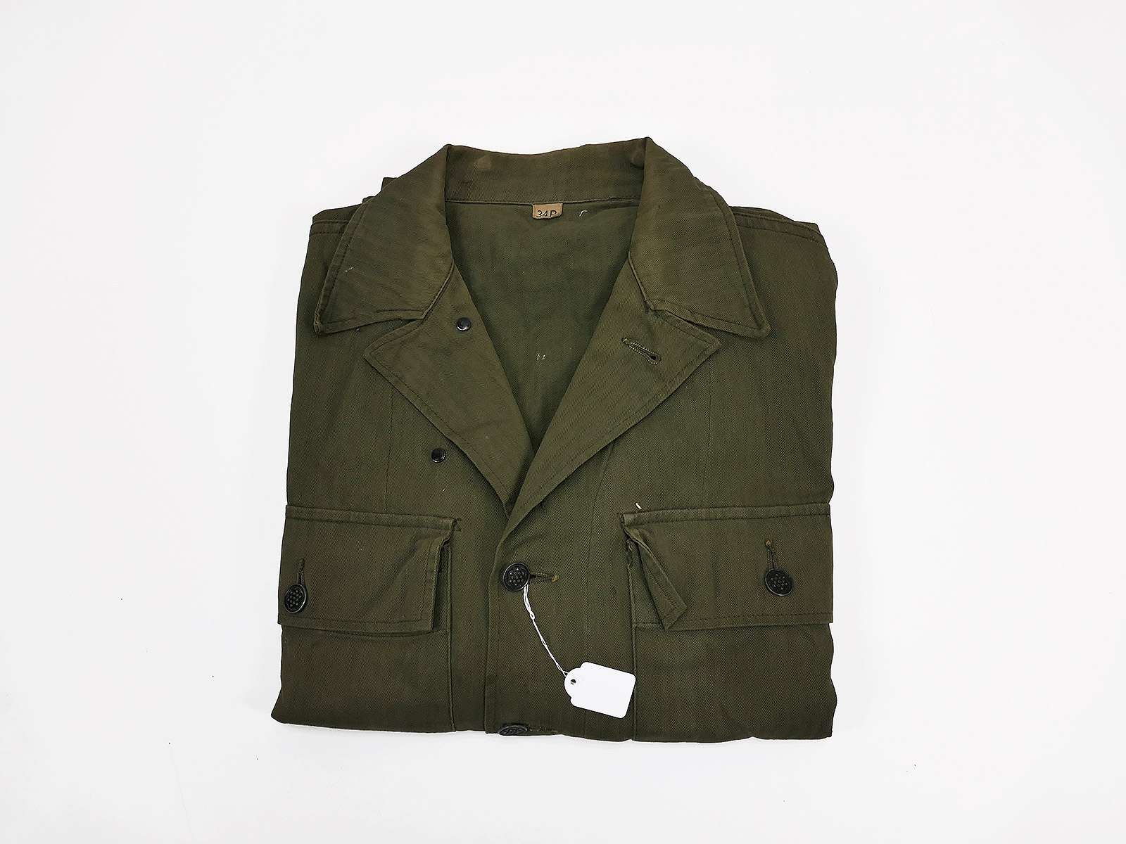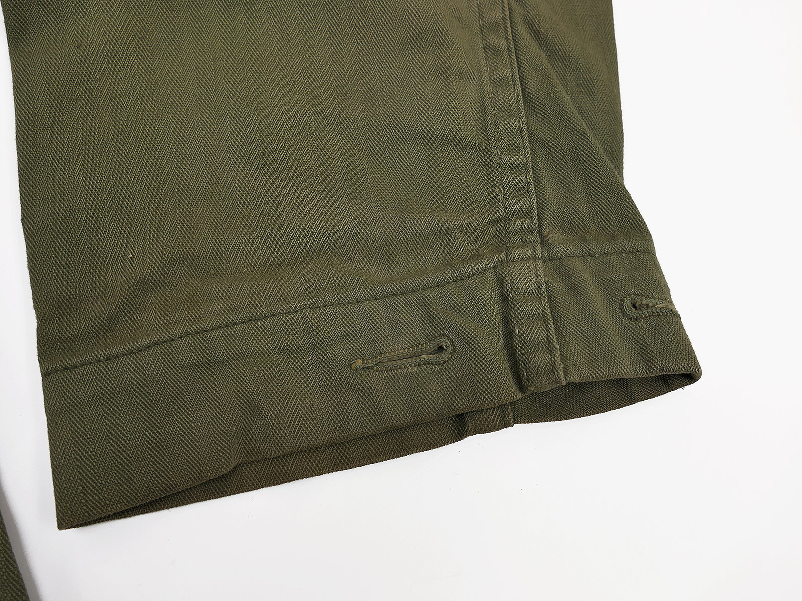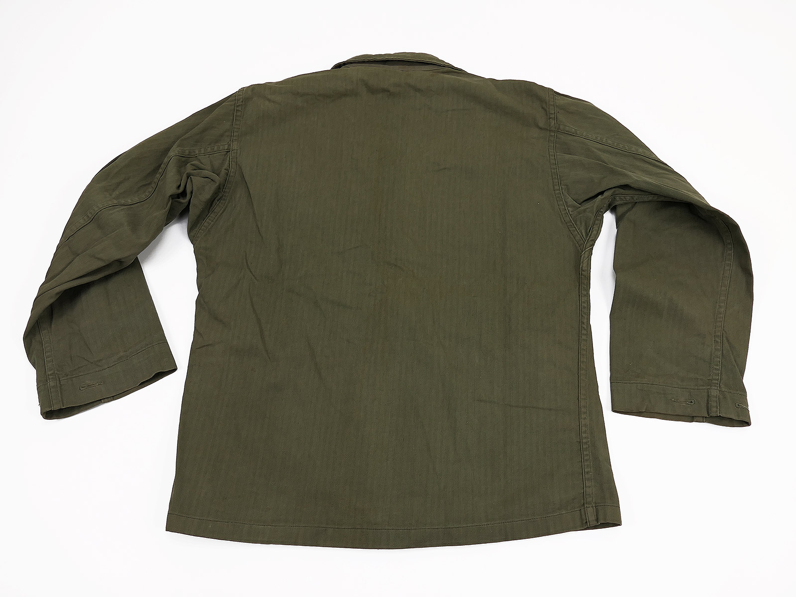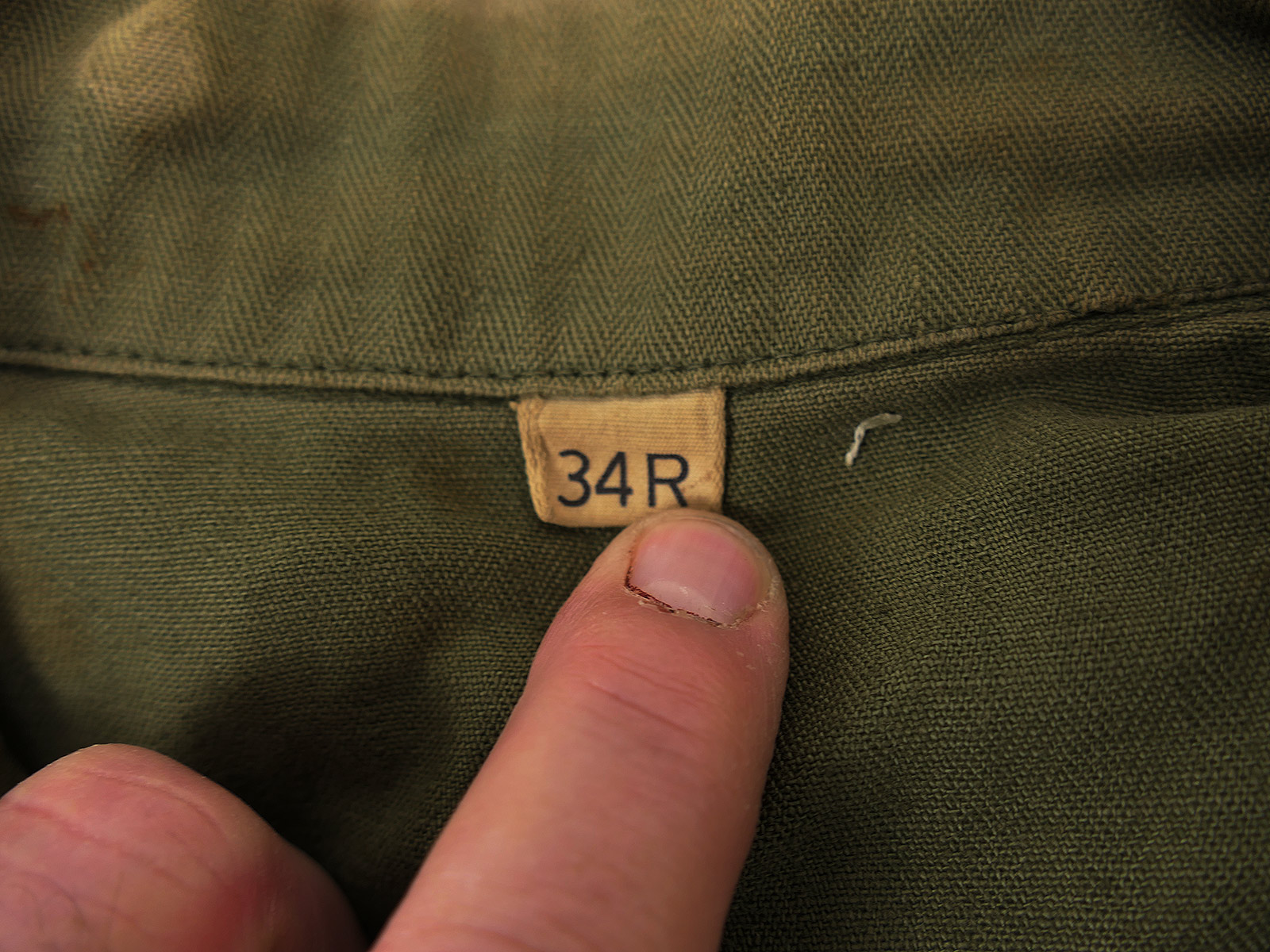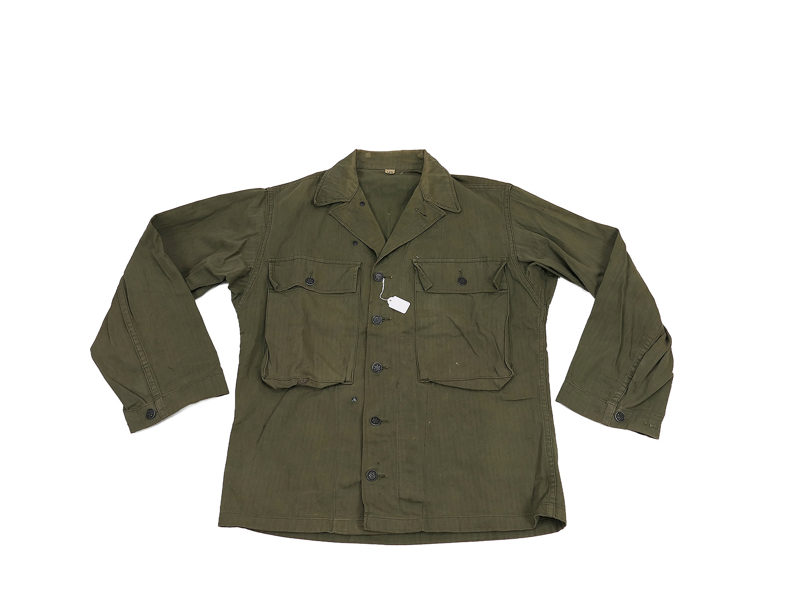 Aus U.S. SammlungsauflösungOriginal US ARMY WW2 HBT Jacket, O.D.7, 13 star buttons, datiert 1943.Größe: 36R = Small / R