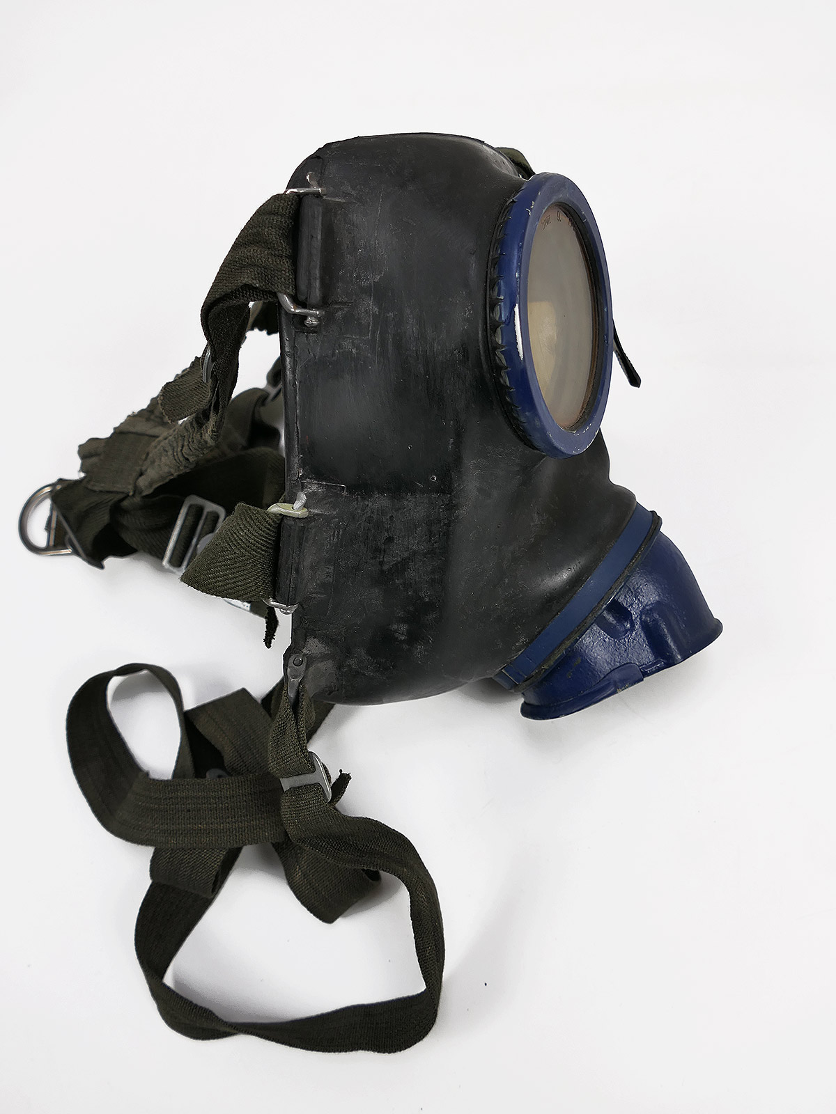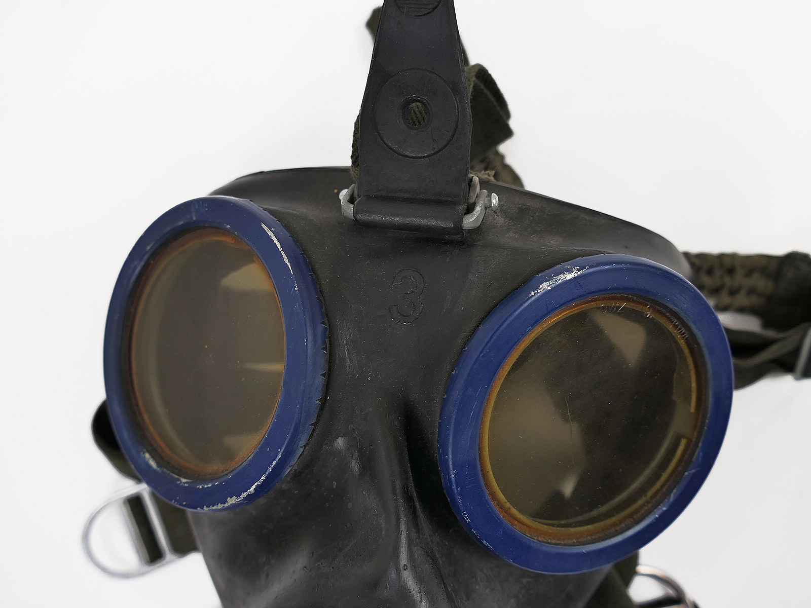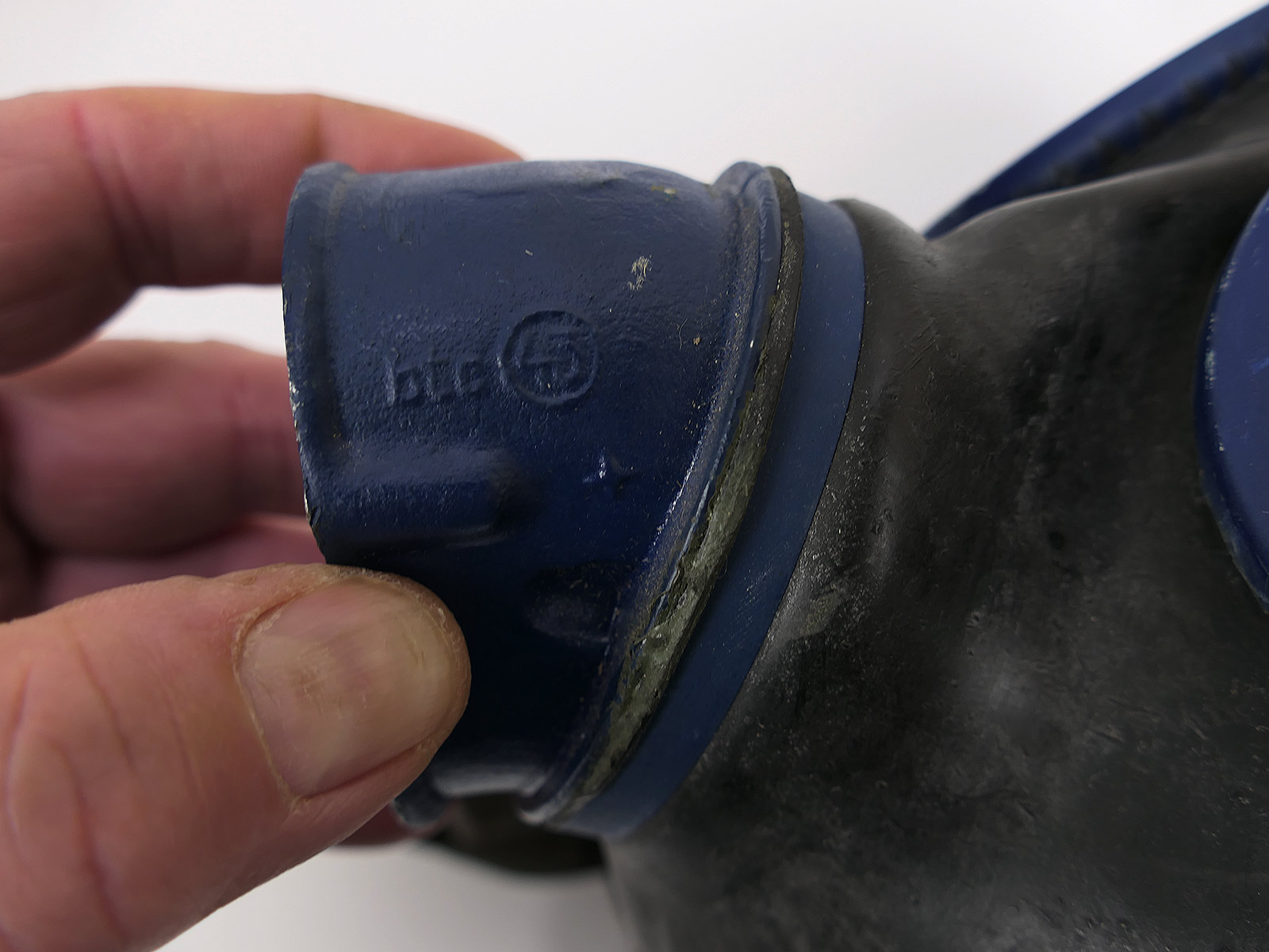 Original Wehrmachts Gasmaske, bmw44, Gummi, schwarz, mit blau lackierten Gläserrändern.