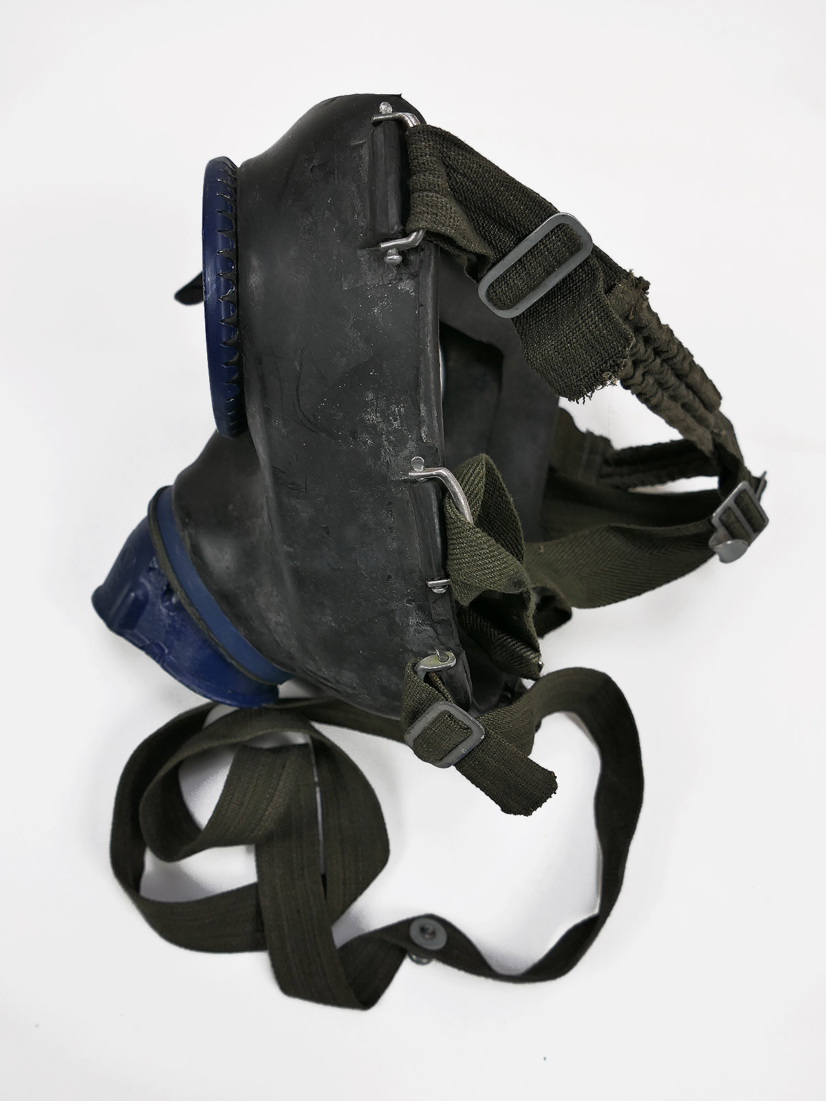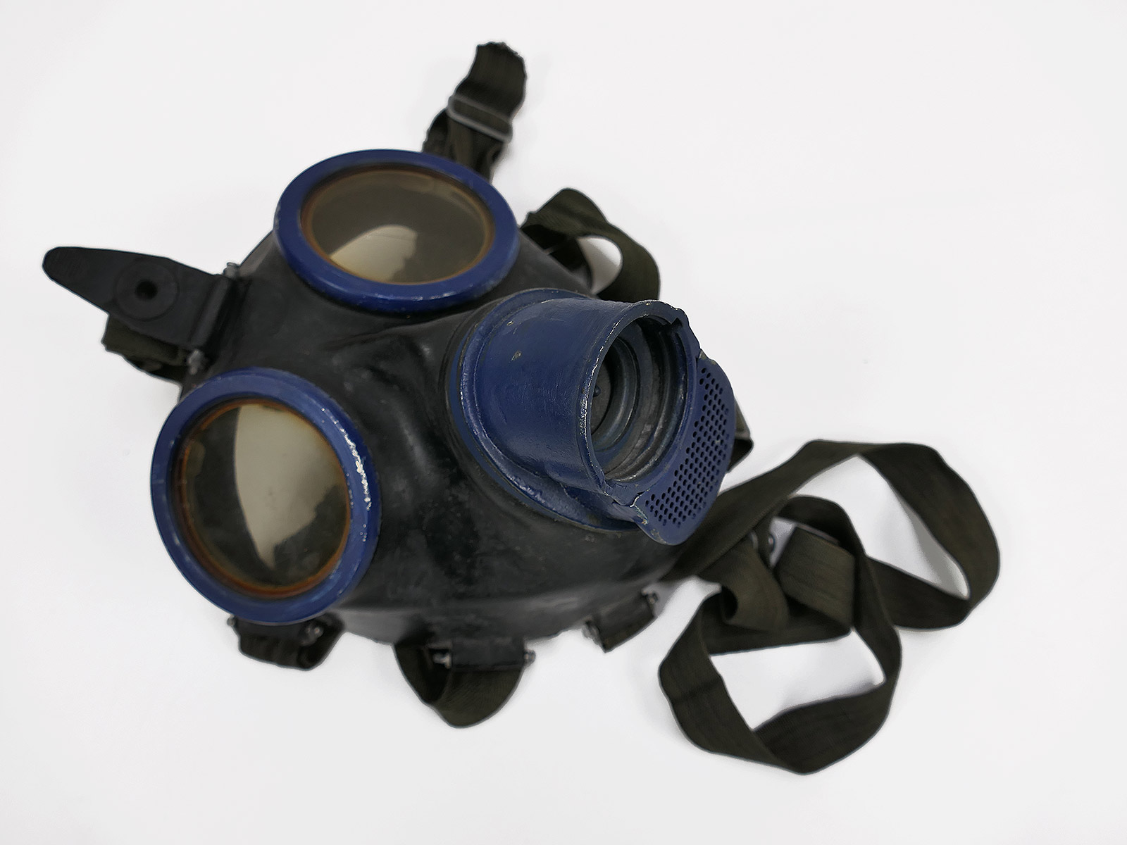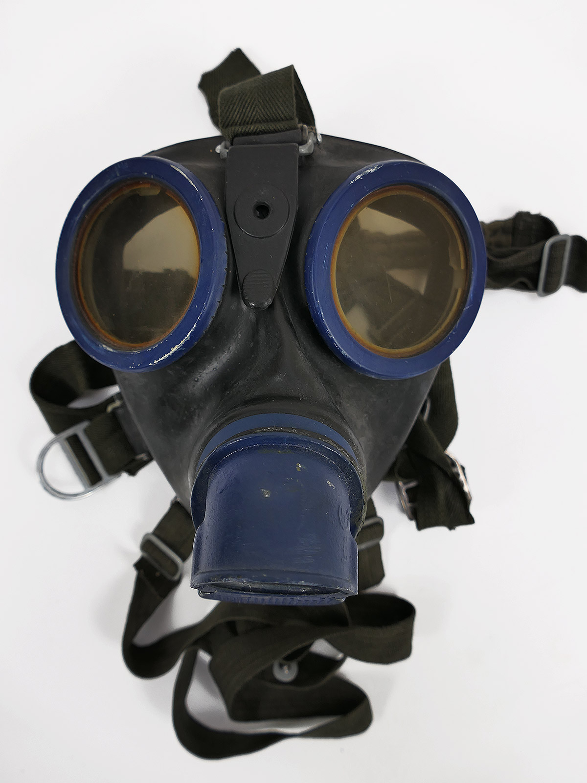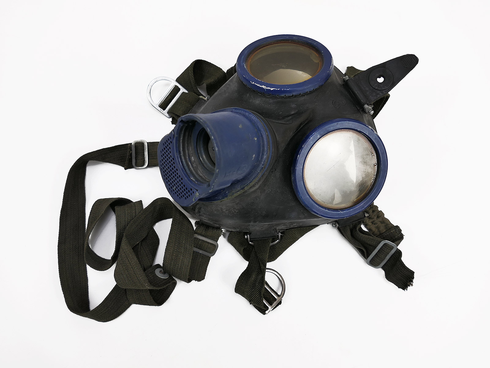 Original Wehrmachts Gasmaske, bmw44, Gummi, schwarz, mit blau lackierten Gläserrändern.