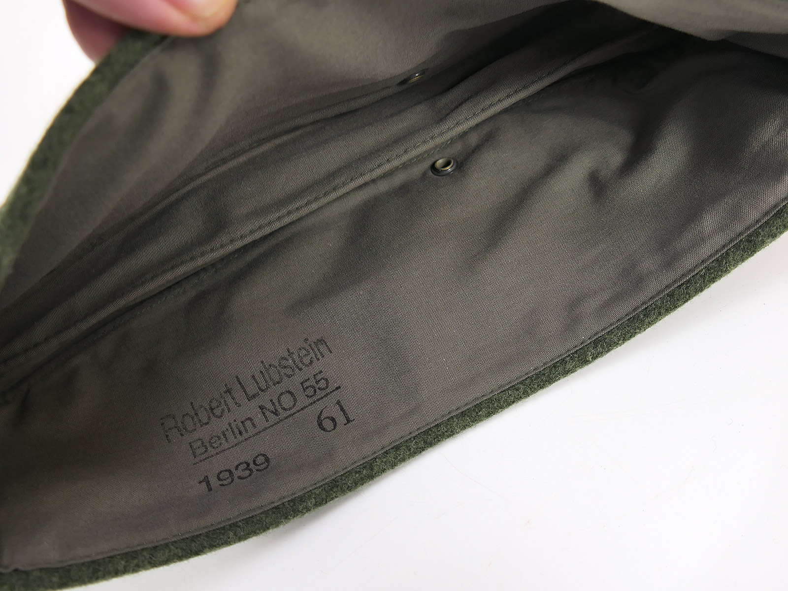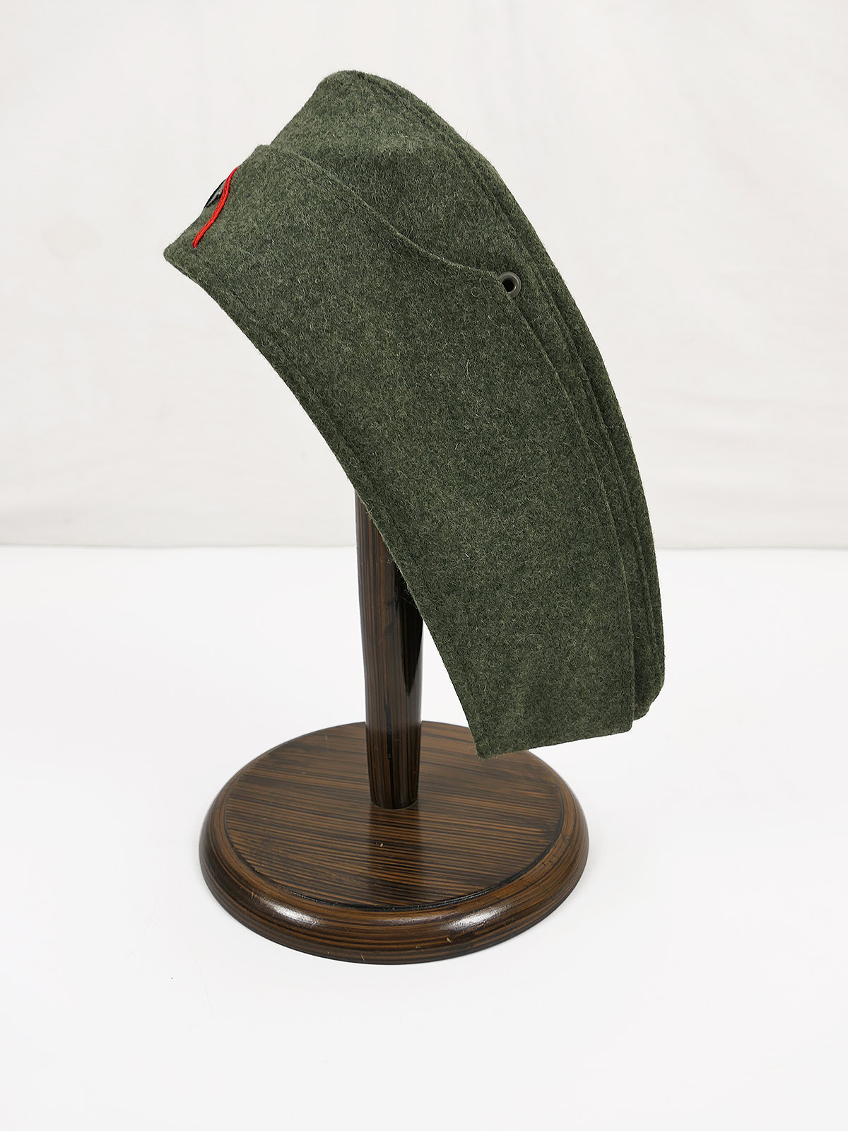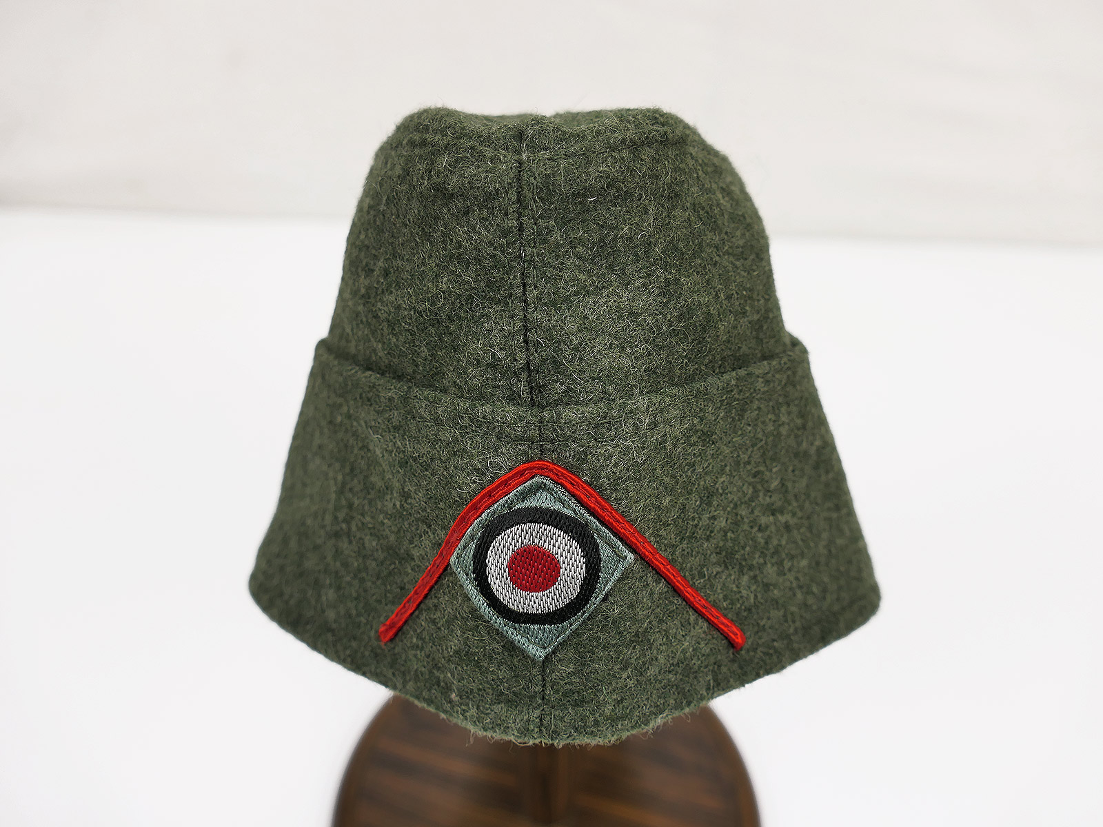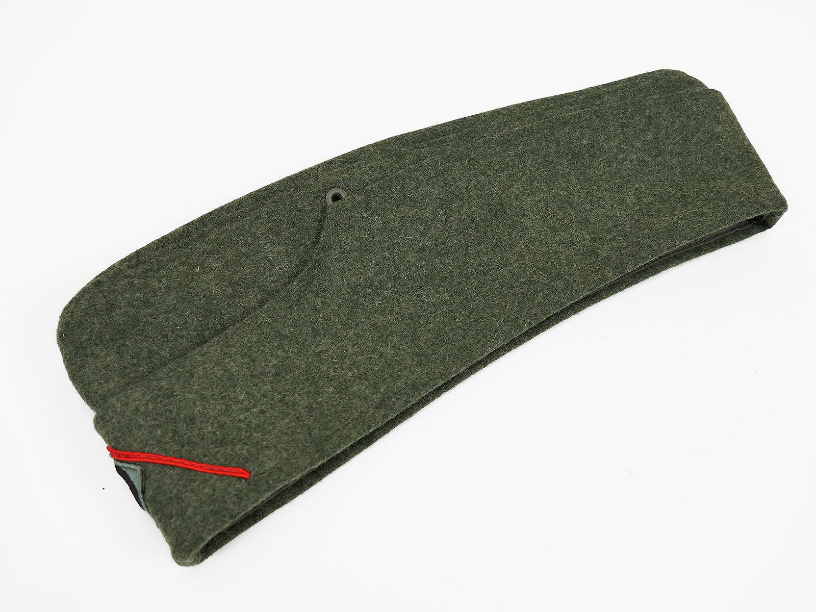 Top Sammleranfertigung, hergestellt in Deutschland, Ausführung für Mannschaften und Unteroffiziere, Lüftungslöcher, Baumwollinnenfutter, Soutache Winkel (Waffenfarbe rot für Artillerie) und hellgrüne Kokarde, Herstellerstempel.