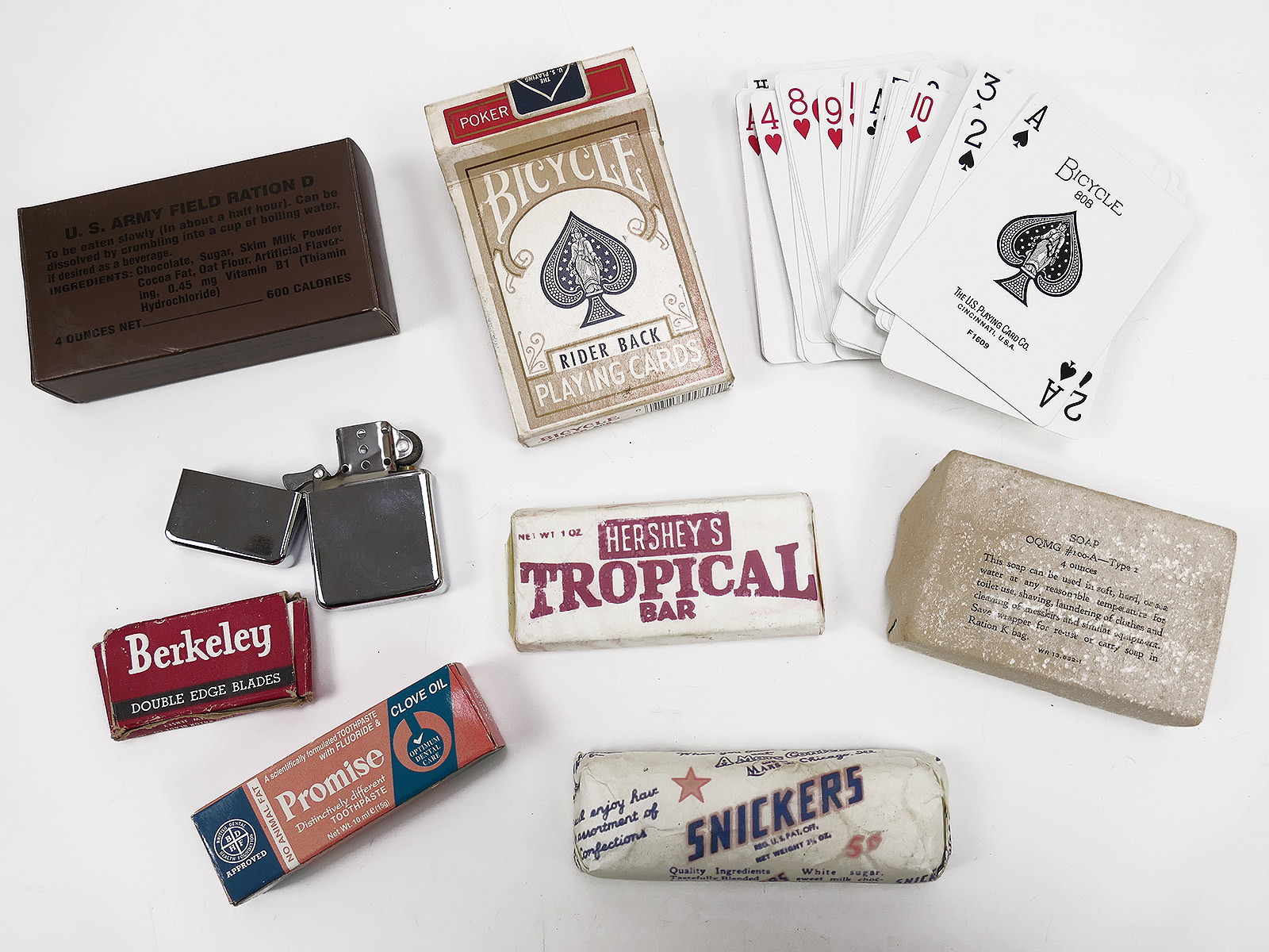 Konvolut US WW2 GI Taschenfüller Pocket Filler Sturmfeuerzeug Verbandpäckchen Kartenspiel PERSÖNLICHES