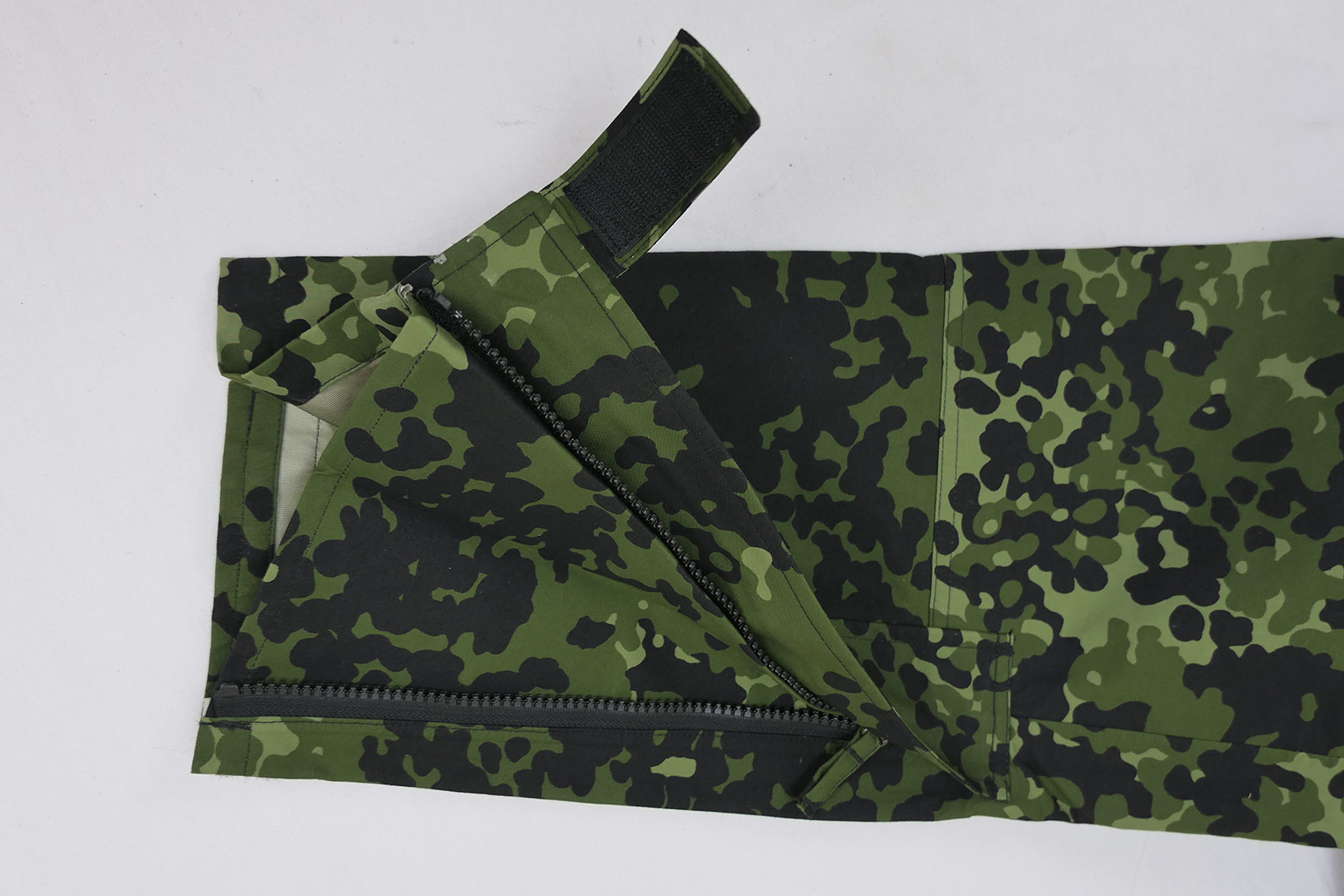 Die Hosenbeine sind seitlich per Reißverschluß im Umfang vergrößerbar so dass man die Hose über die Schuhe/Stiefel ziehen kann.