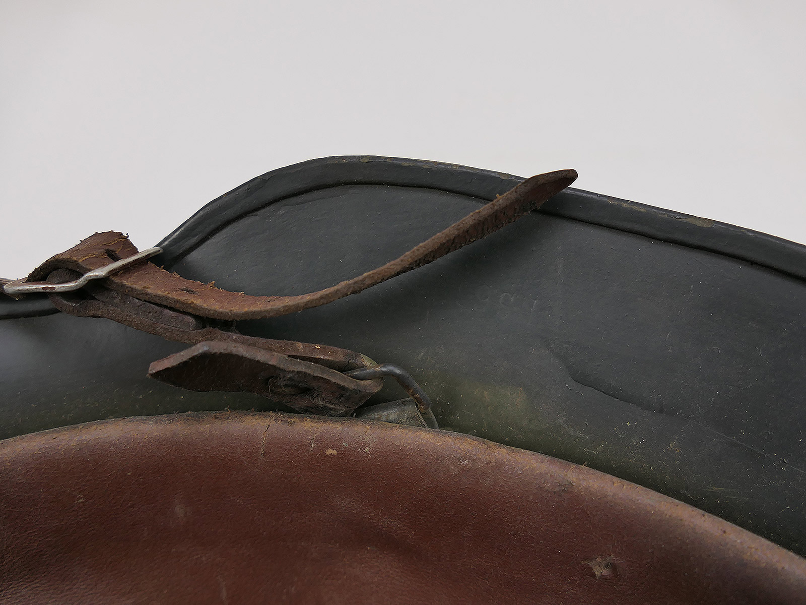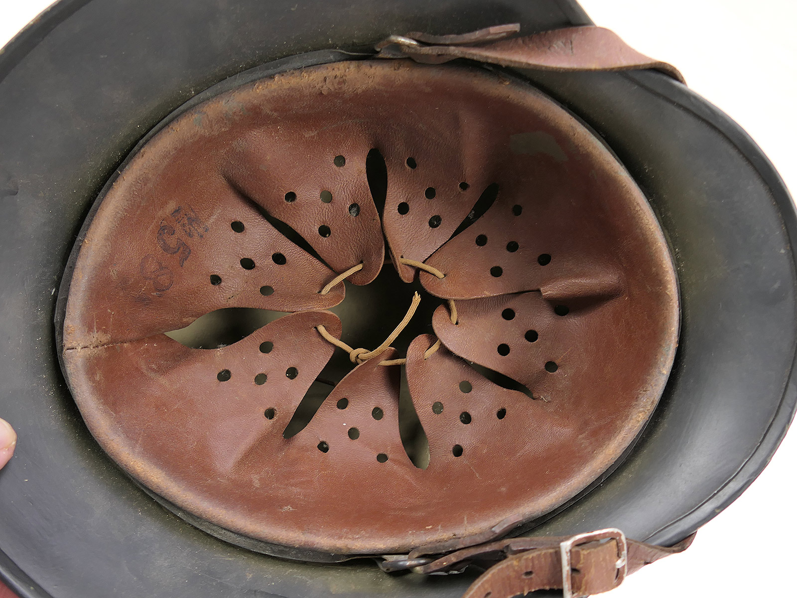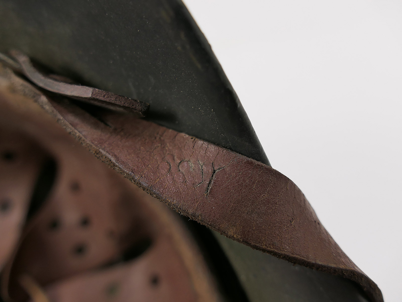 Mit Innenfutter (ältere Sammleranfertigung in Museumsqualität) und Kinnriemen (ebenso) vervollständigt.