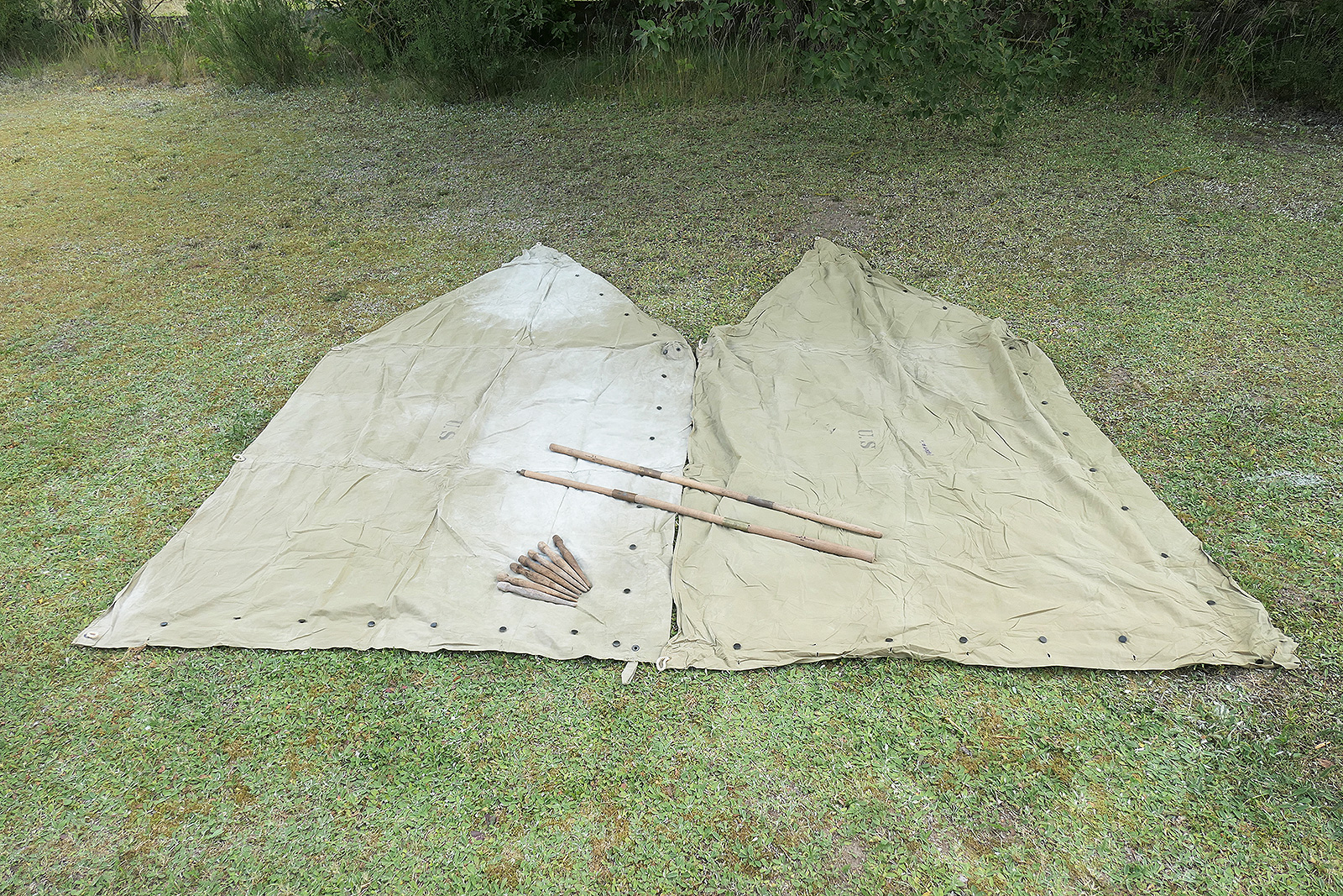 #1 US Zelt 2x Zeltbahn shelter Zeltplane tent half + 2x Stangen 7x Holzpflöcke - GI Zweimannzelt