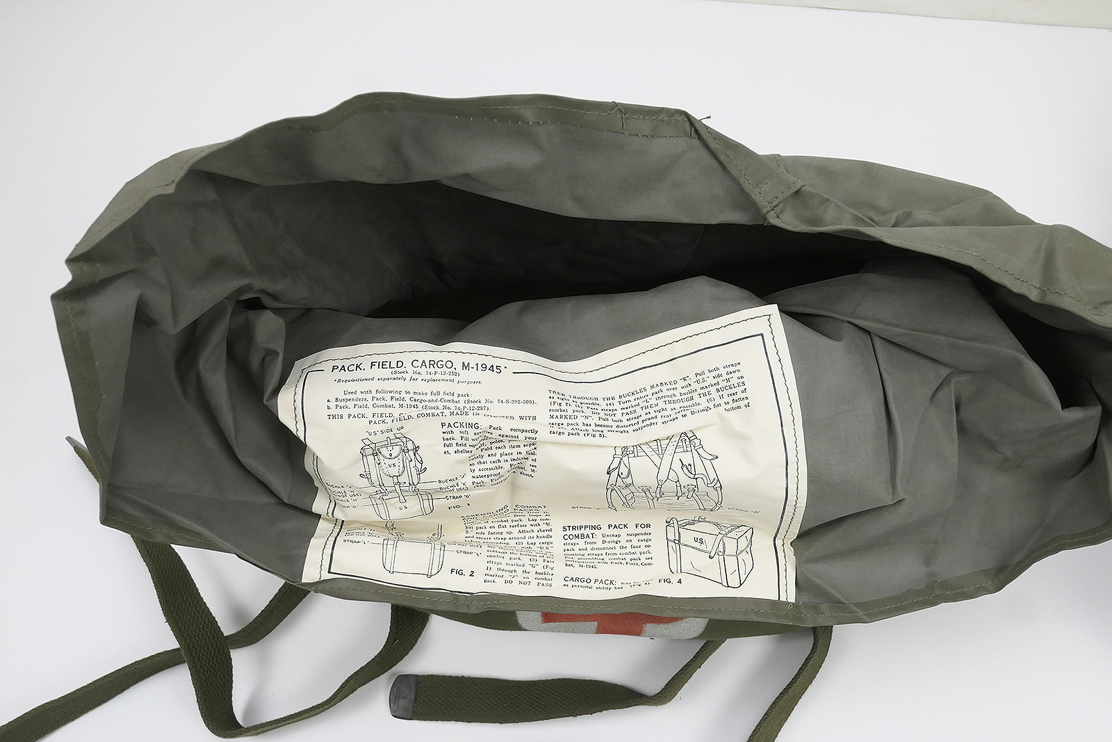 In passendem Pack Field Cargo M-1945, datiert 1951. Mit Rotkreuz versehen und somit zur Sanitätertasche umfunktioniert in gutem gebrauchten Zustand.
