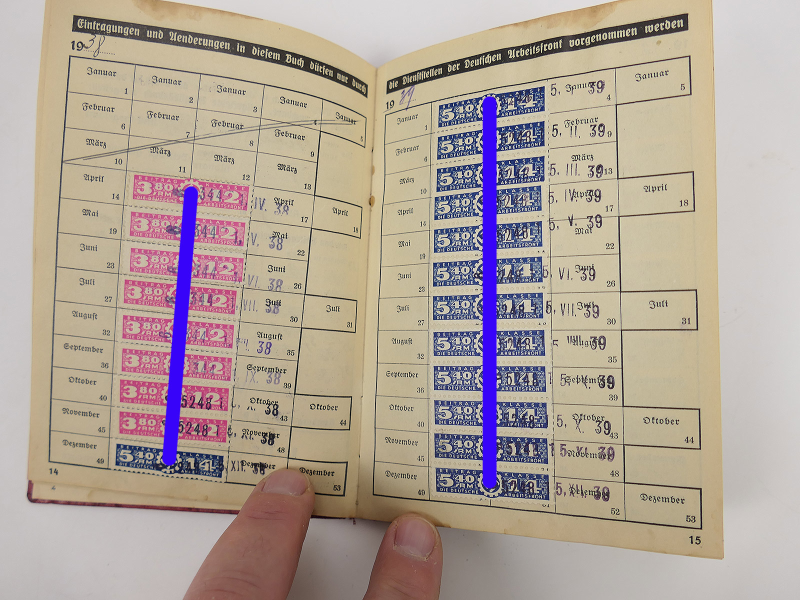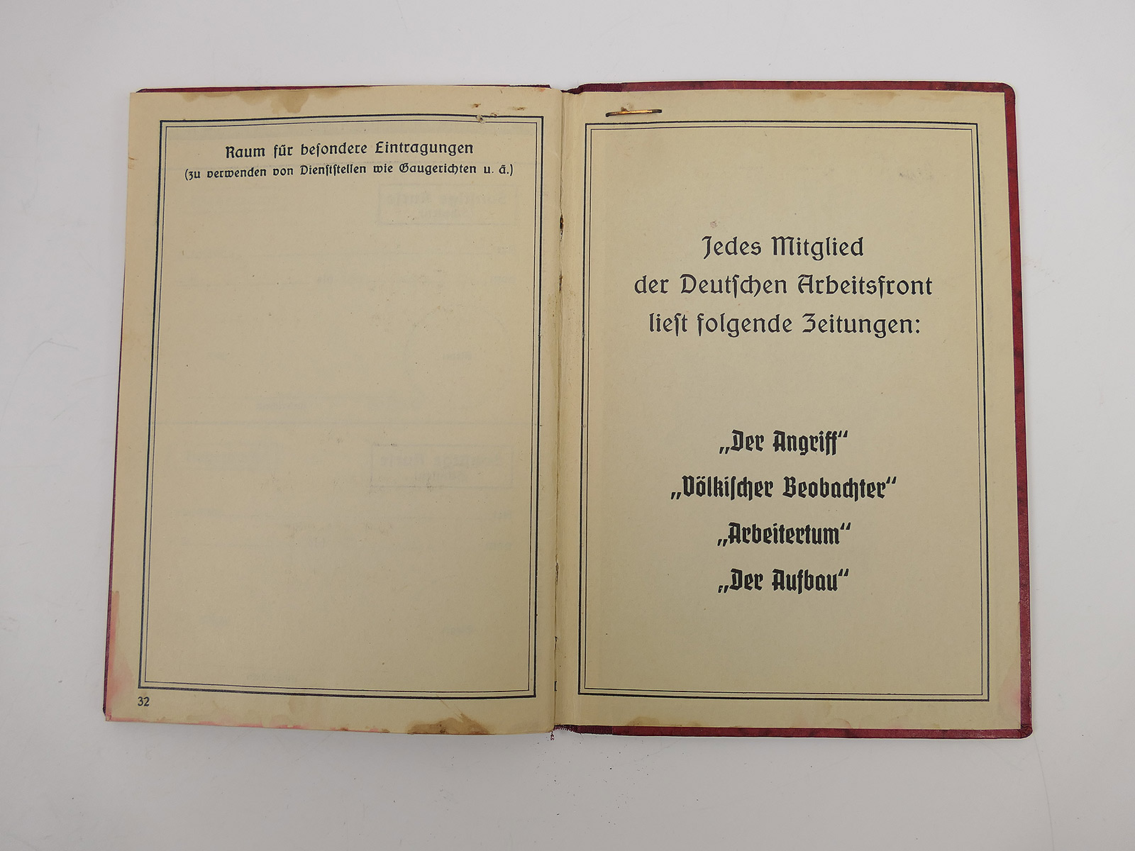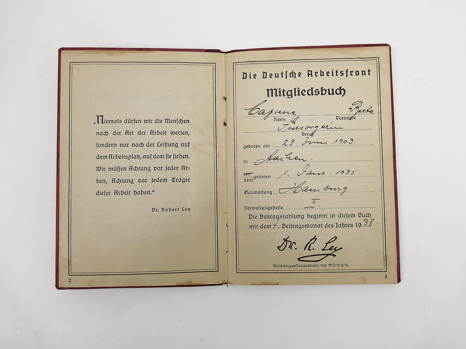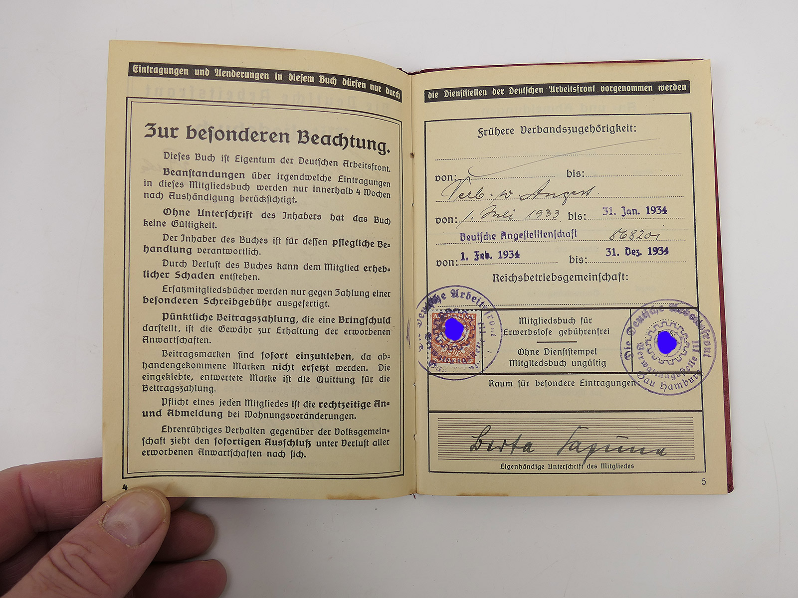 Original Mitgliedsbuch Deutsche Arbeitsfront Weiblich Deutsches Reich mit Eintragungen + Marken