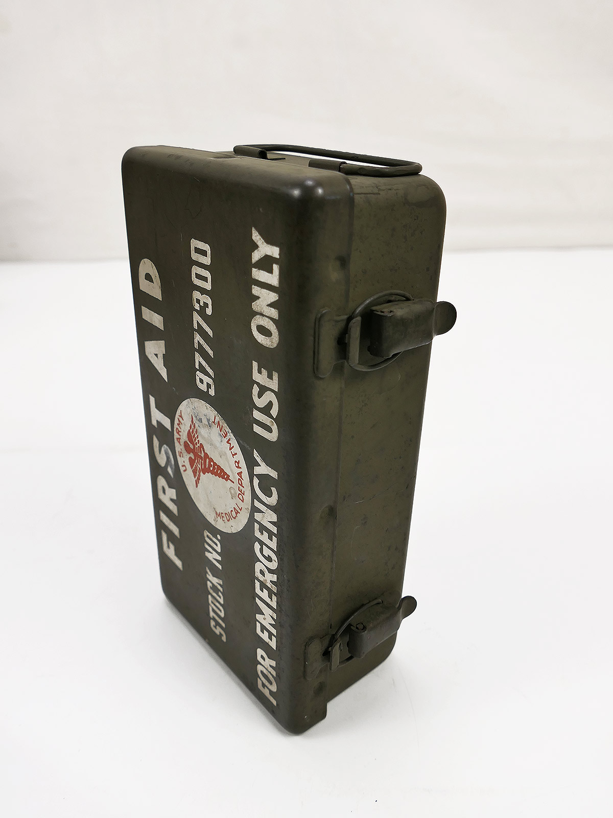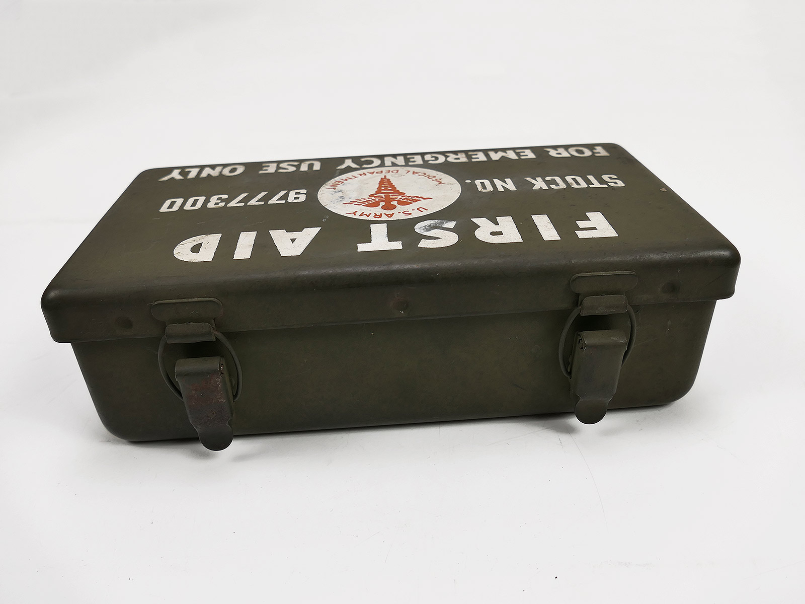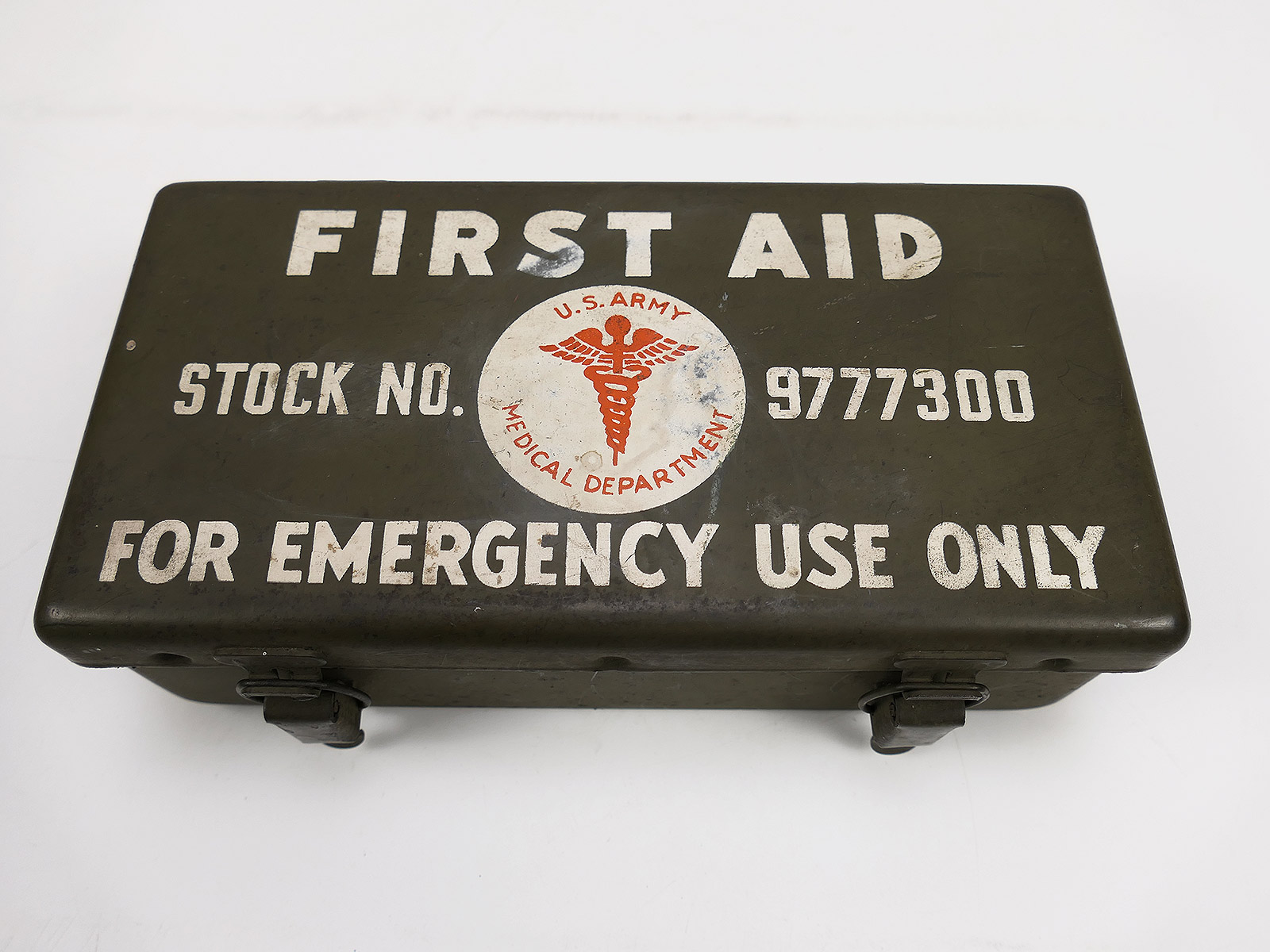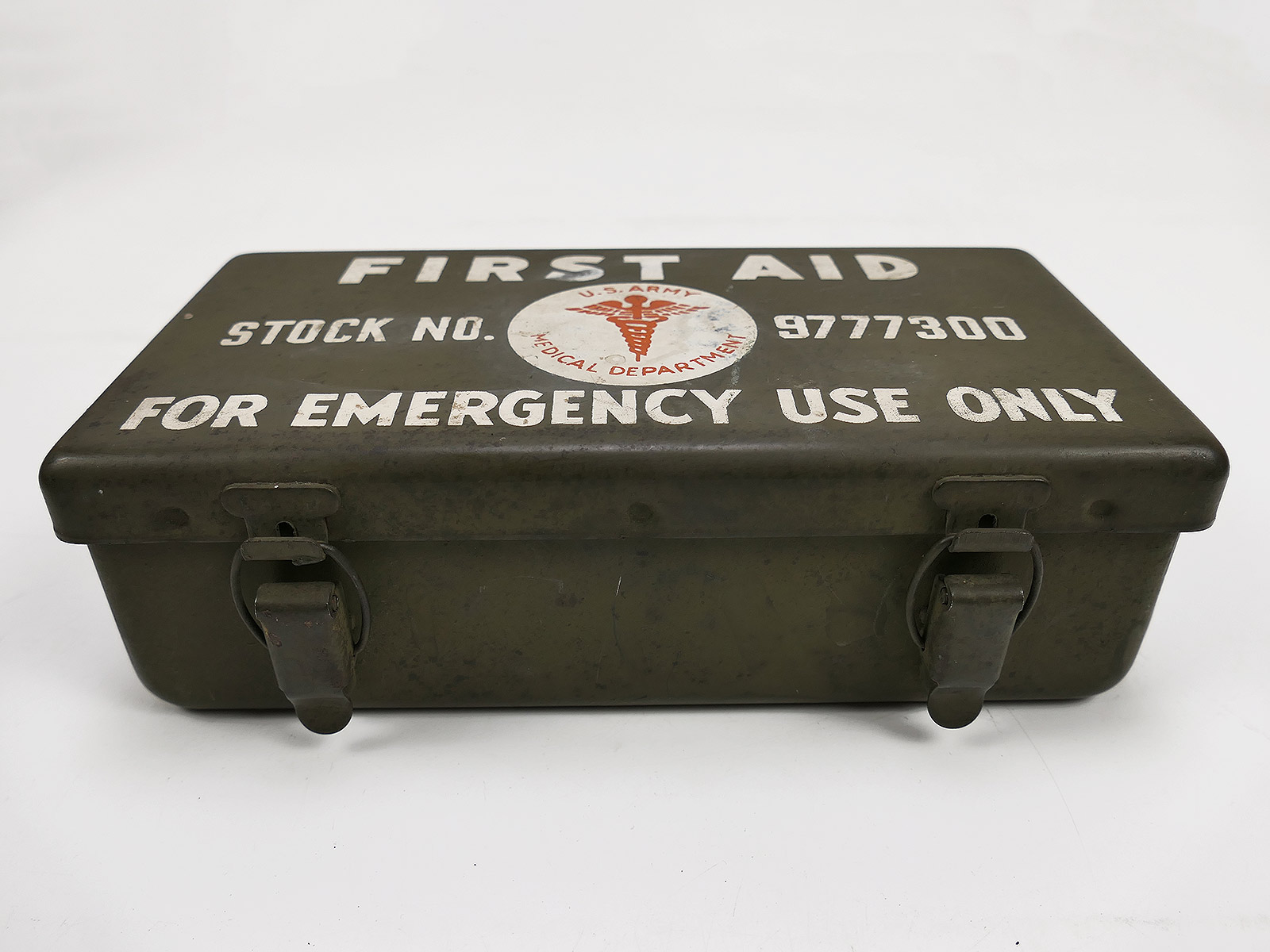 Original US ARMY Medical First Aid Box Jeep Medic Verbandkasten Metallkiste MIT INHALT COLLECTION BATTLE WORN