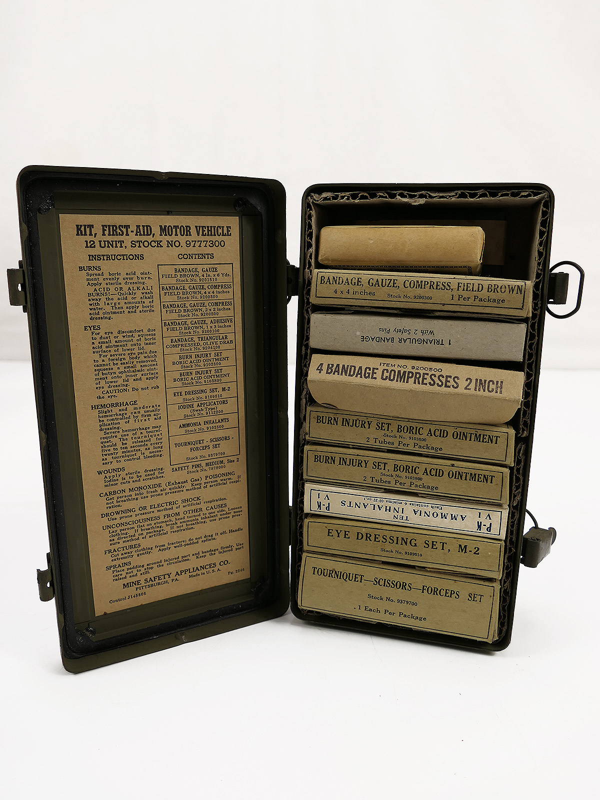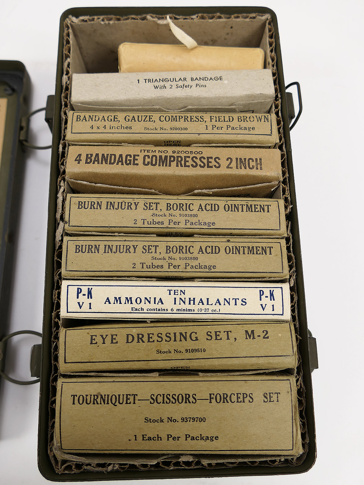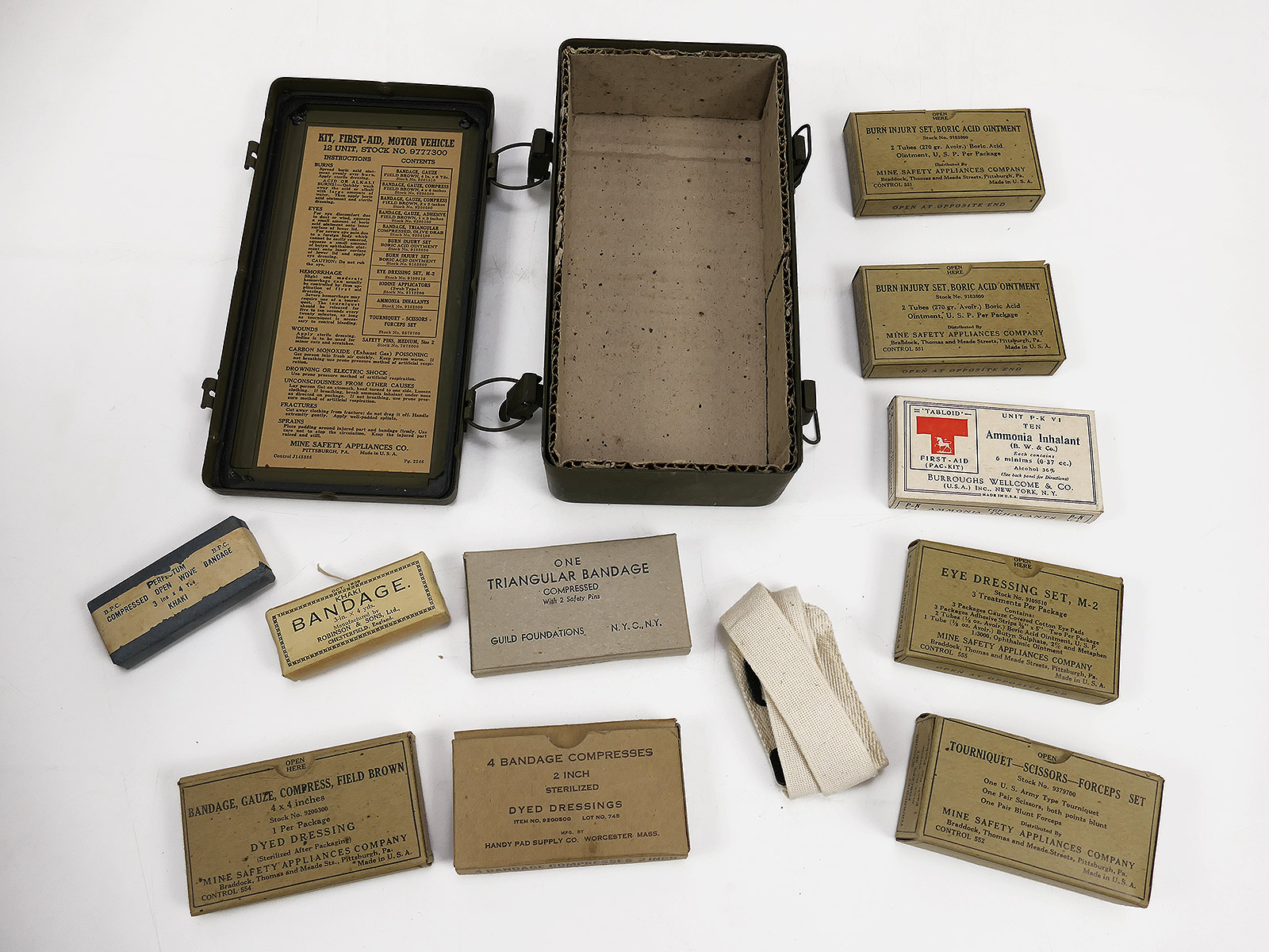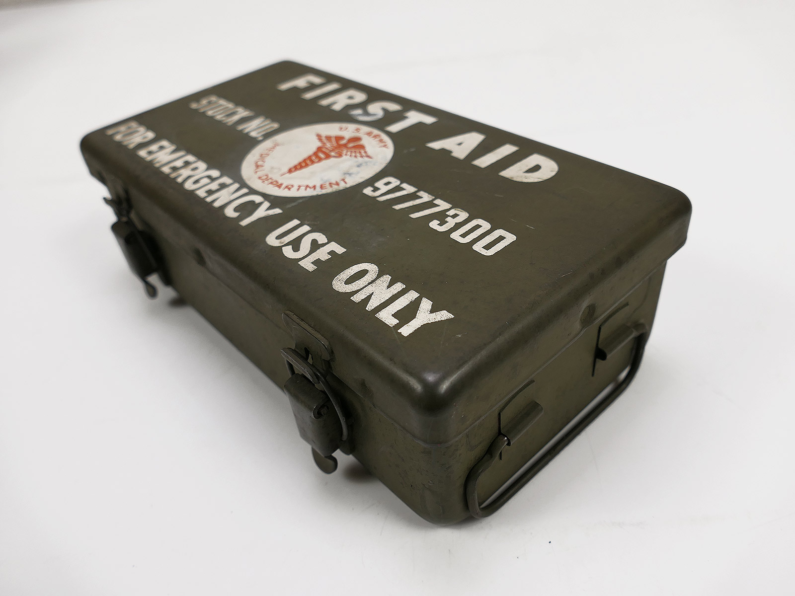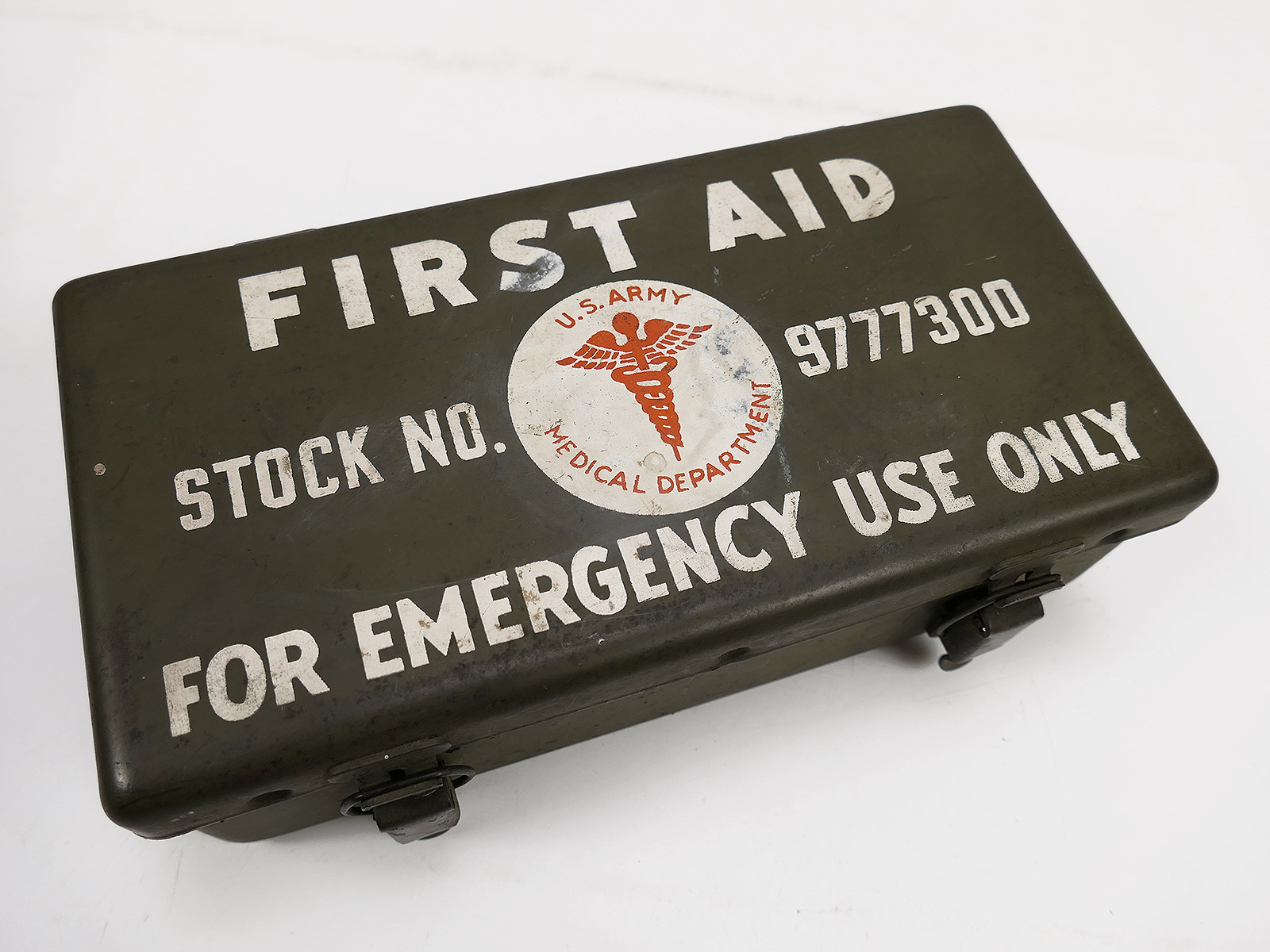 Original US ARMY Medical First Aid Box Jeep Medic Verbandkasten Metallkiste MIT INHALT COLLECTION BATTLE WORN