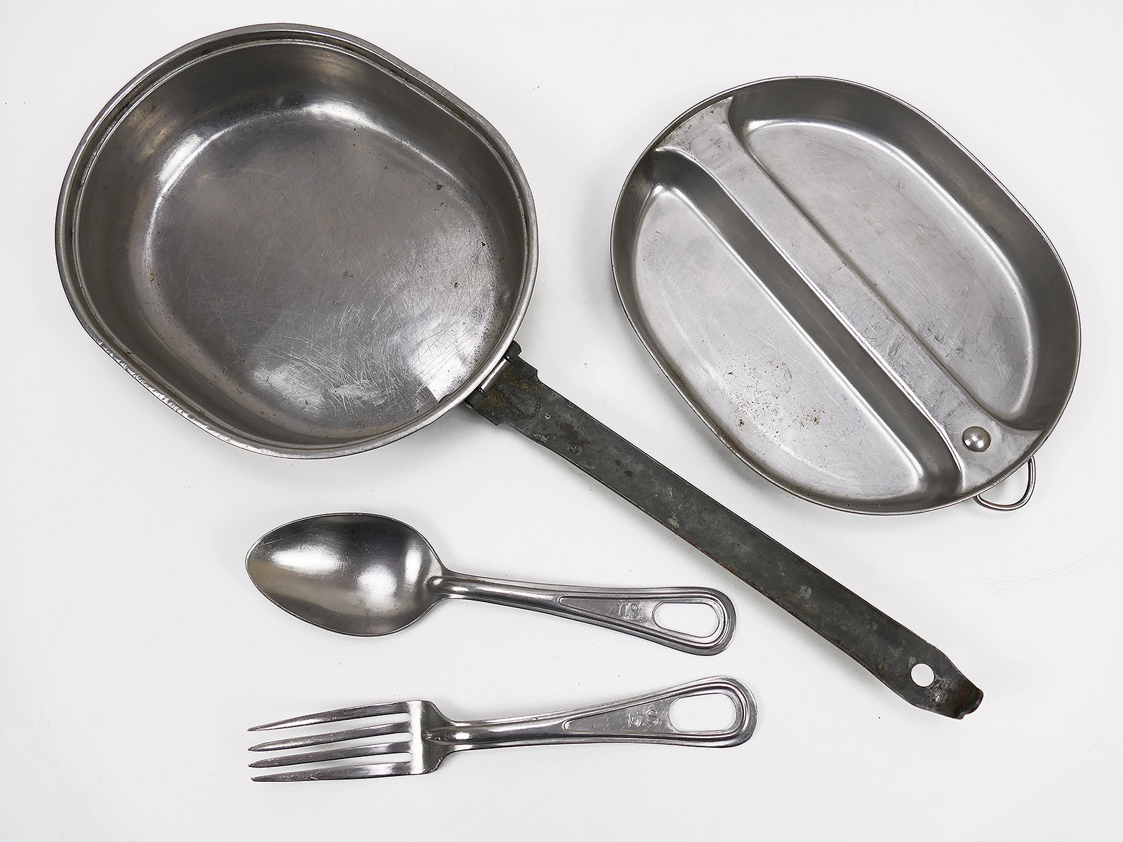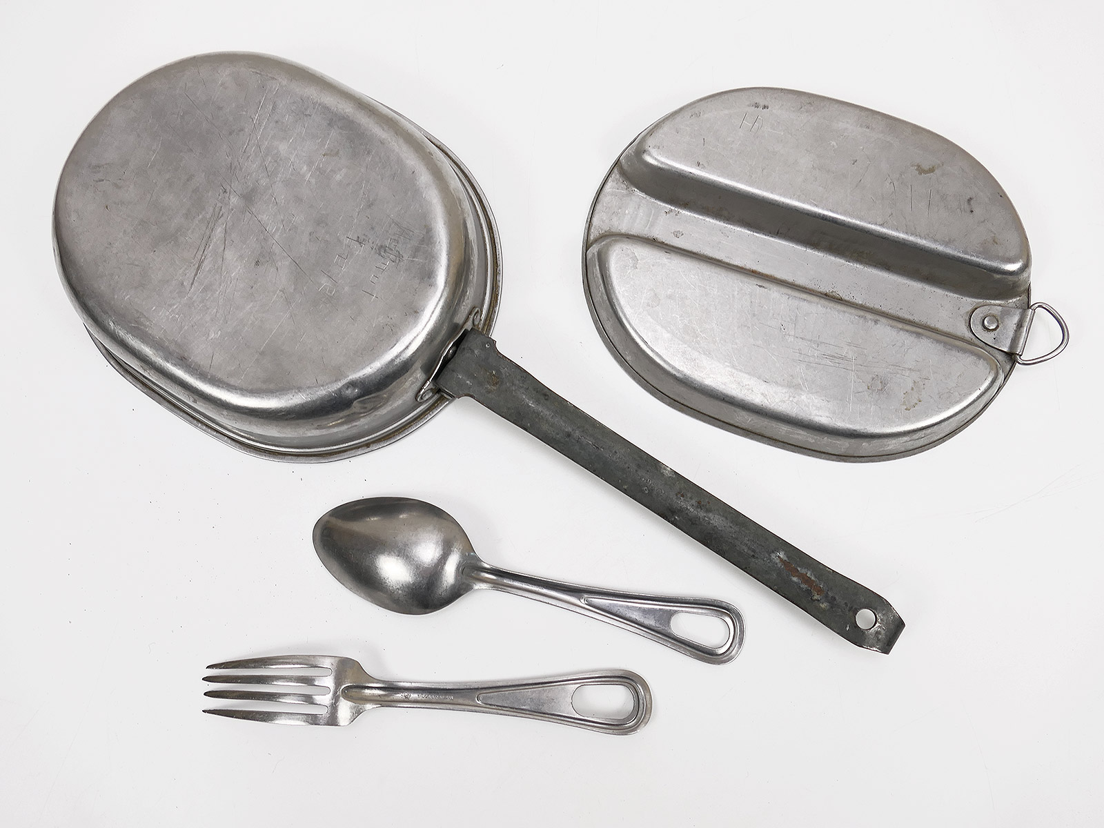 Original US Army WW2 Essgeschirr Kochgeschirr Canteen 1944 + Essbesteck Gabel Löffel Collection BATTLE WORN