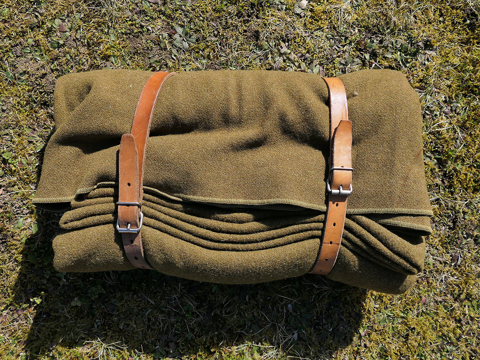 Original US ARMY WW2 Wool Virgin Blanket OD Wolldecke Camp Decke mit 2 Lederriemen COLLECTION BATTLE WORN