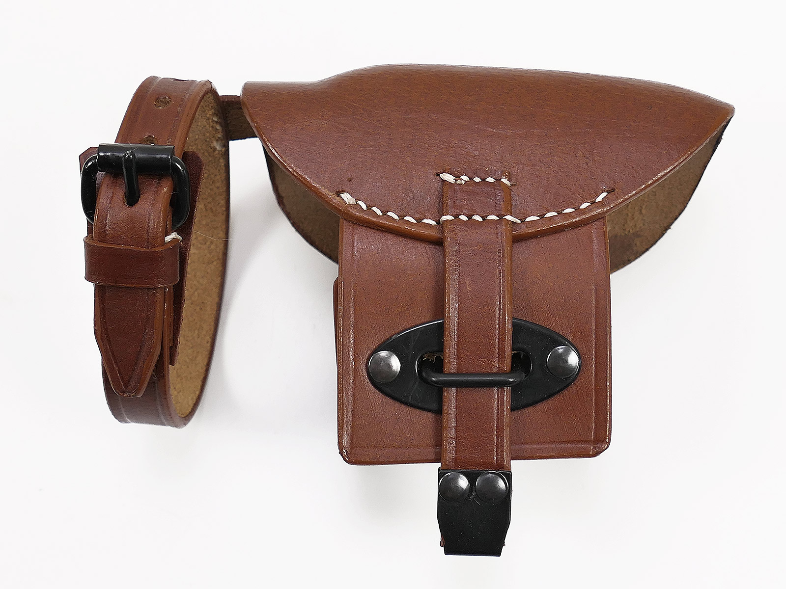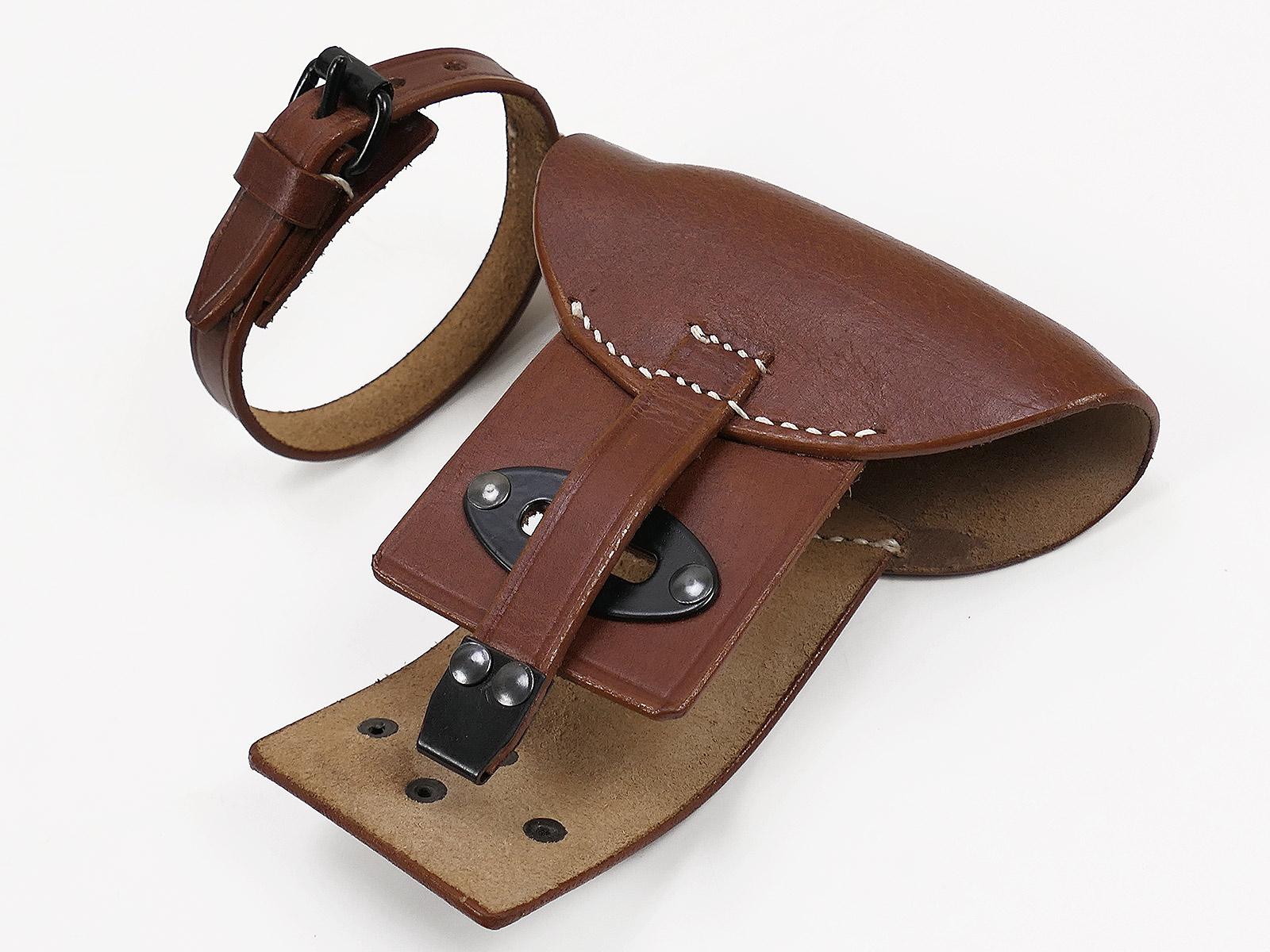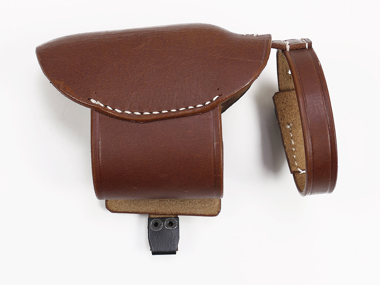 Visierabdeckung / Visierschutz aus Leder für den Karabiener 98K. Diese Abdeckungen wurden genutzt um das nicht benötigte Schiebevisier vor Schmutz und Beschädigung im harten Fronteinsatz zu schützen und im Weiteren ein Flimmern vor der Optik bei heiß geschossener Waffe zu verhindern. Ein Scharfschütze benötigt relativ selten die offene Visierung, und sollte dies trotzdem nötig sein, öffnet man den Steckschieber und klappt die Lederkappe nach unten. Um einen Verlust zu vermeiden ist die ganze Sache mit dem Riemen gesichert.