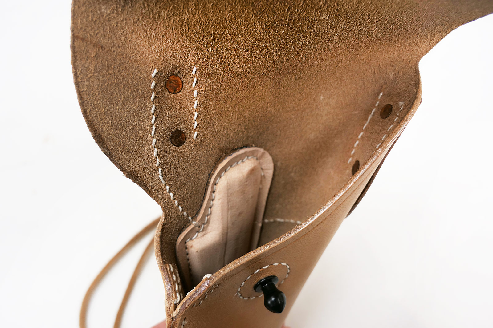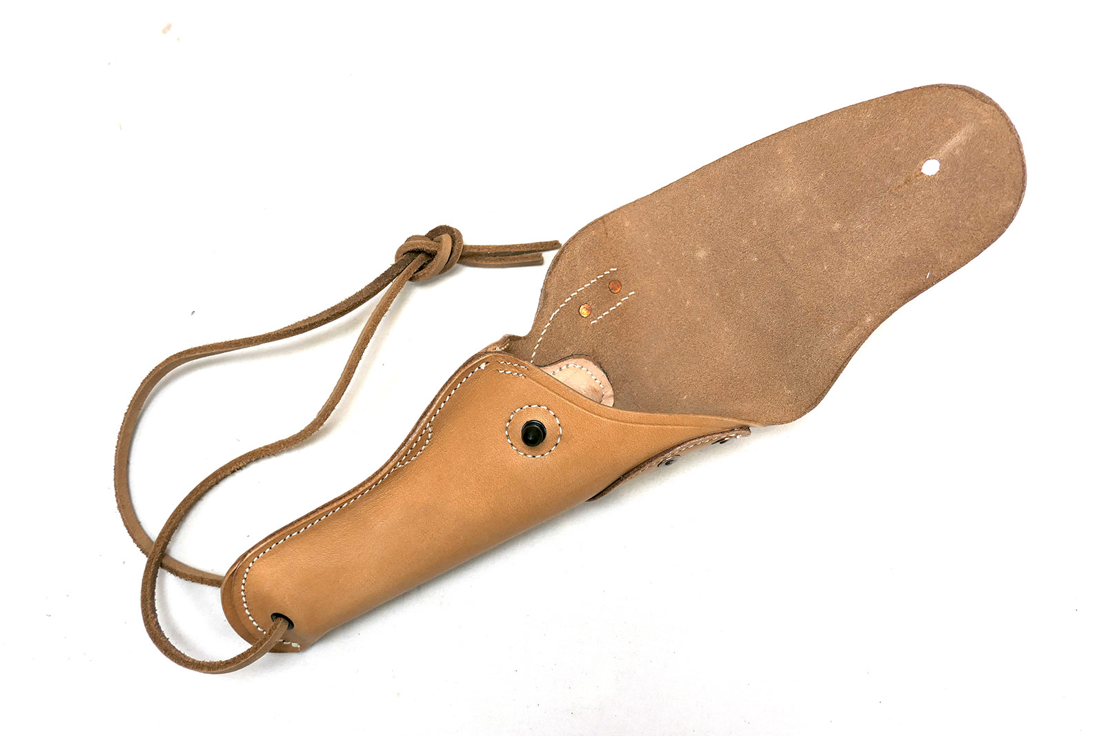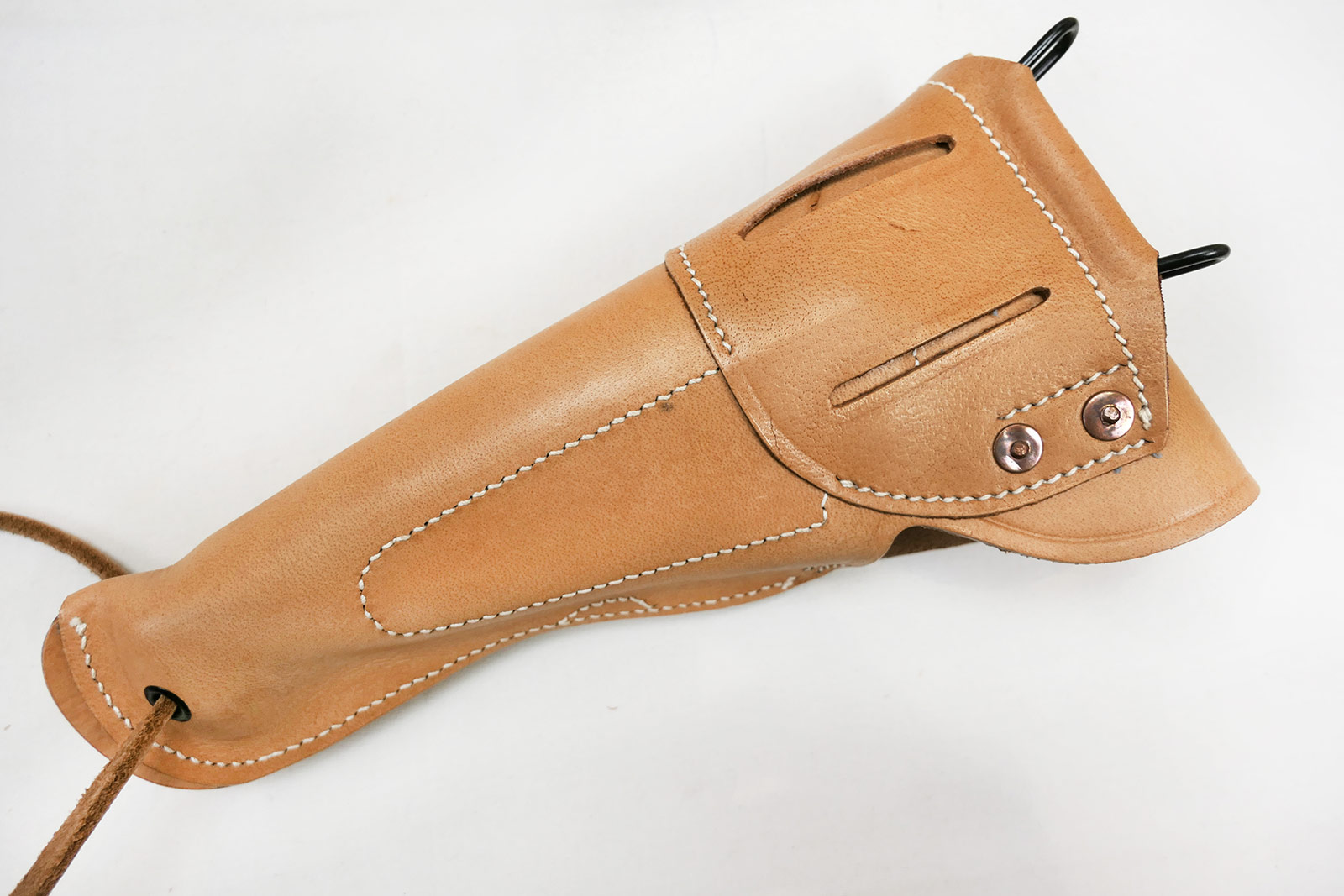 Standard Holster für den Colt Government cal. 45, saubere Verarbeitung, hell / natur. In der Sonne bekommt das Leder mit der Zeit den honigbraunen Ton, mit Lederöl wird die Farbe noch dunkler und das Leder geschmeidig.