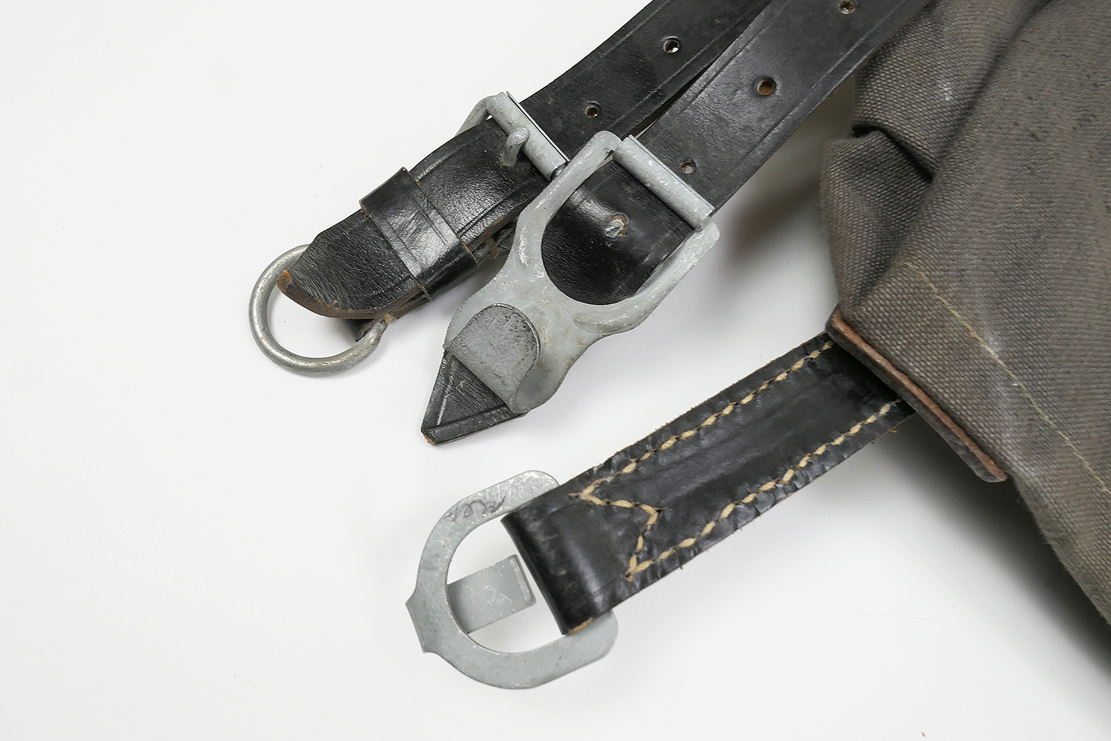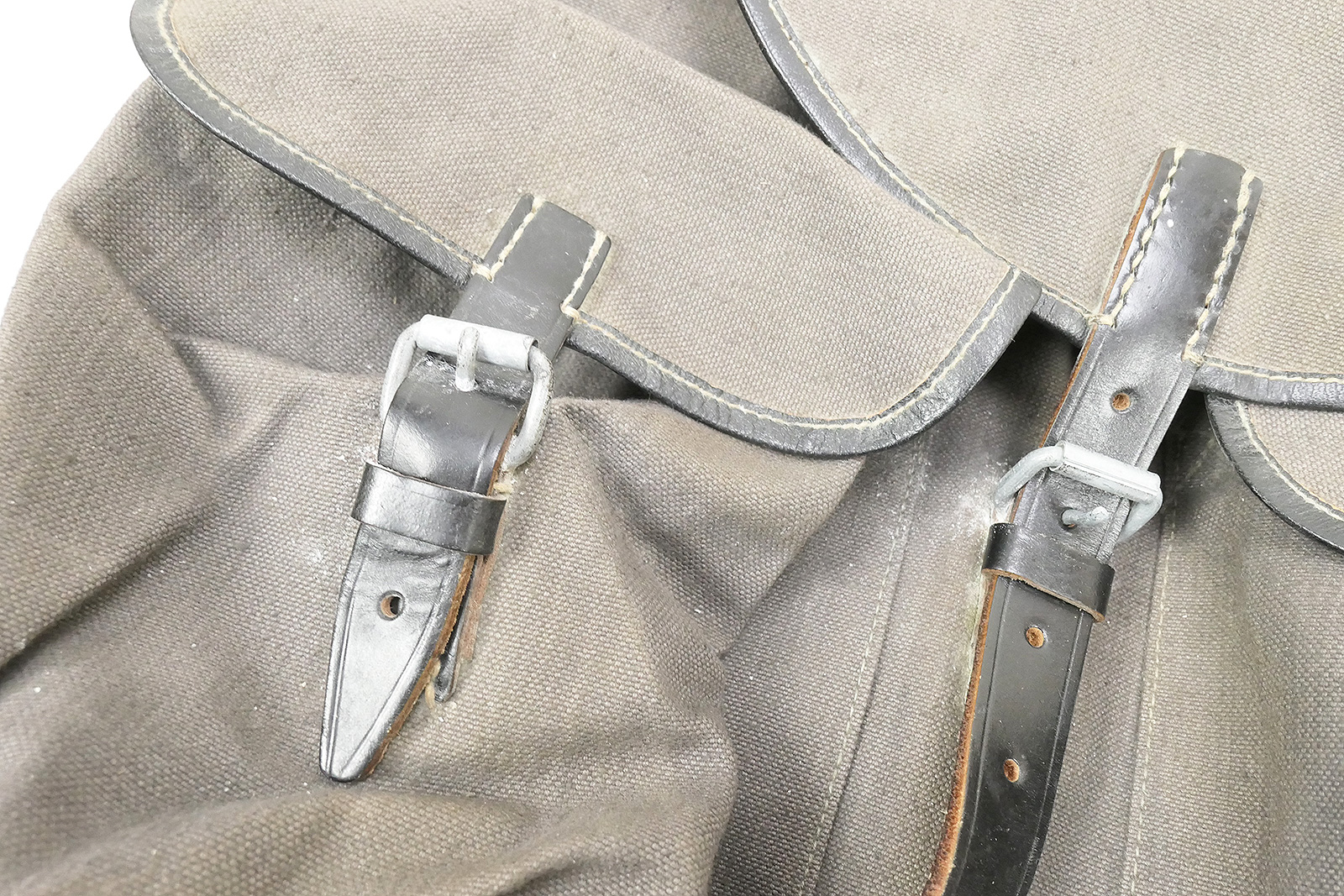 Vintage Militärrucksack blaugrau, aus robustem Material, stabile Verarbeitung.