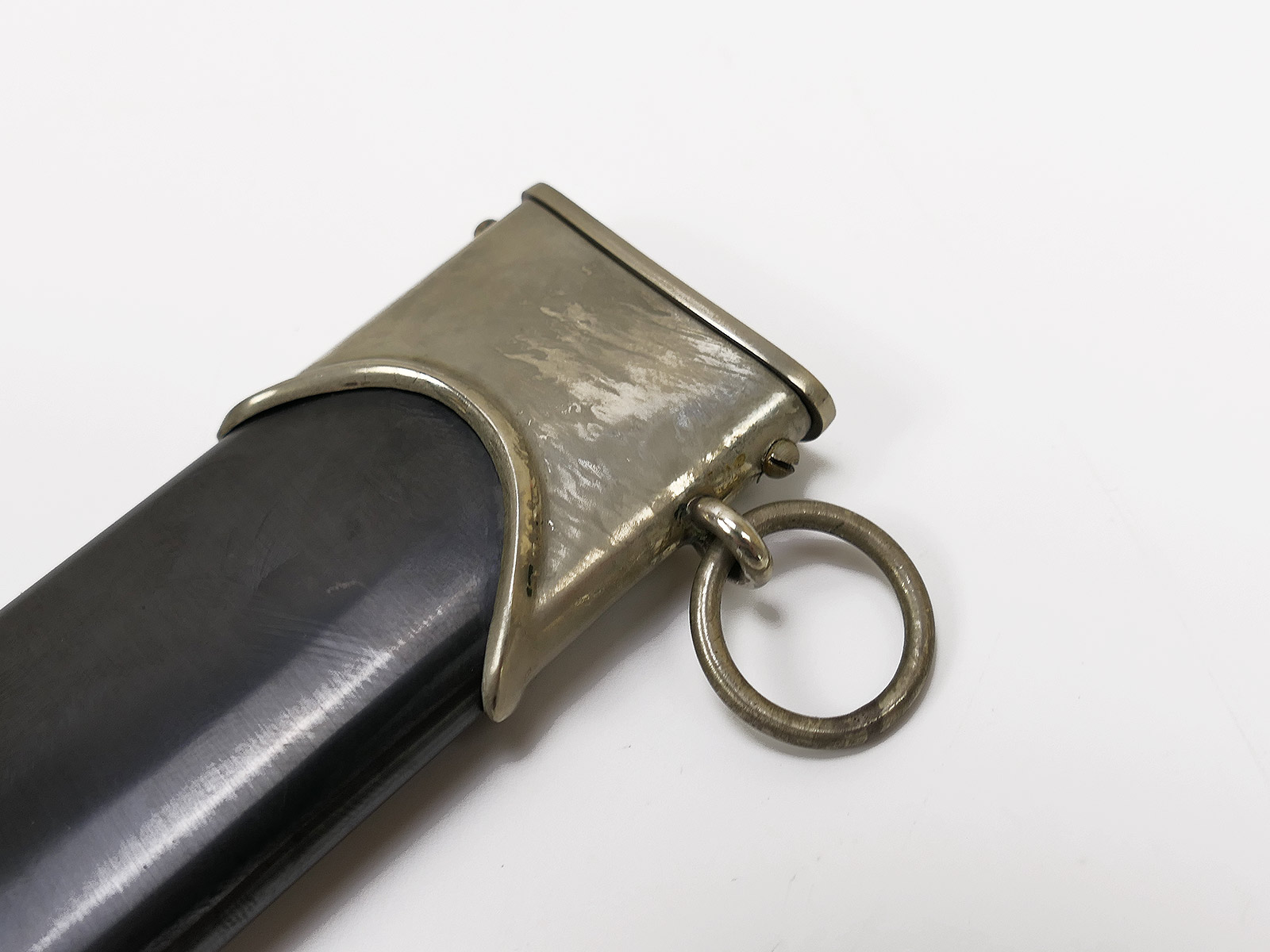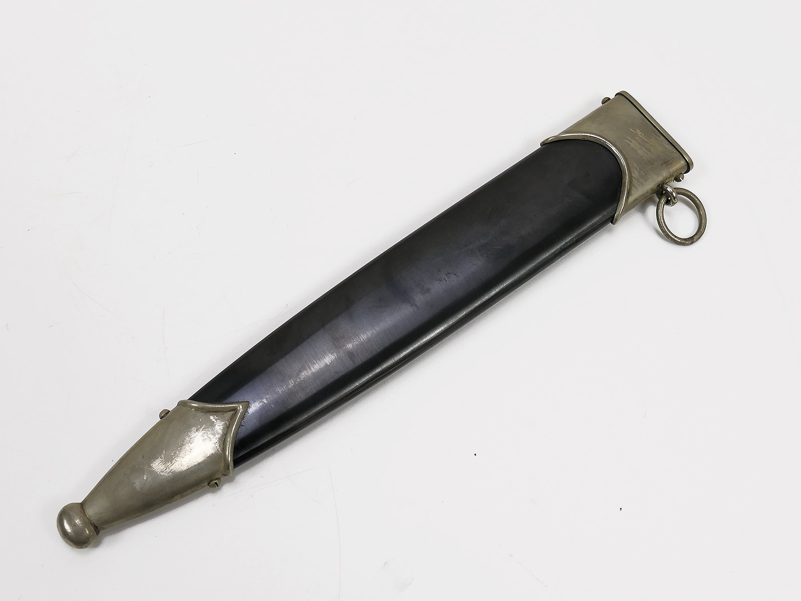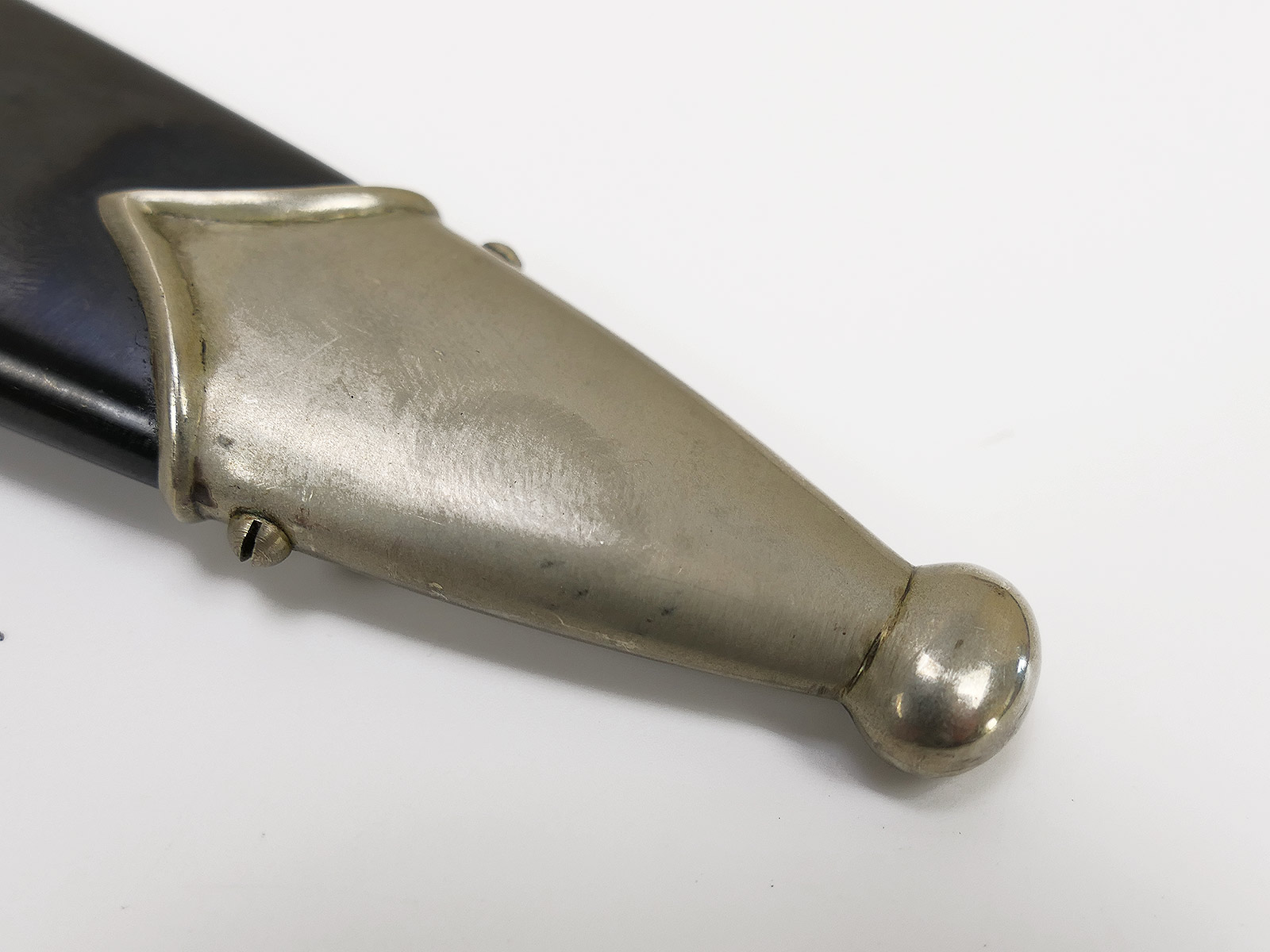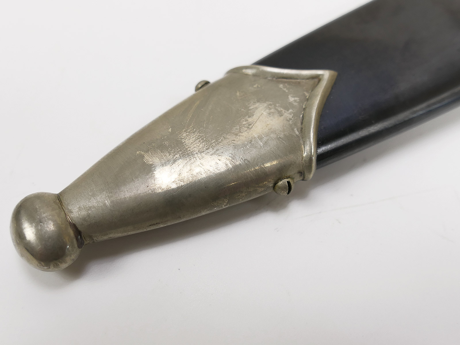 Komplett aus Metall, der Griff aus Holz. Scheidenbeschläge, Klinge.....alles magnetisch.