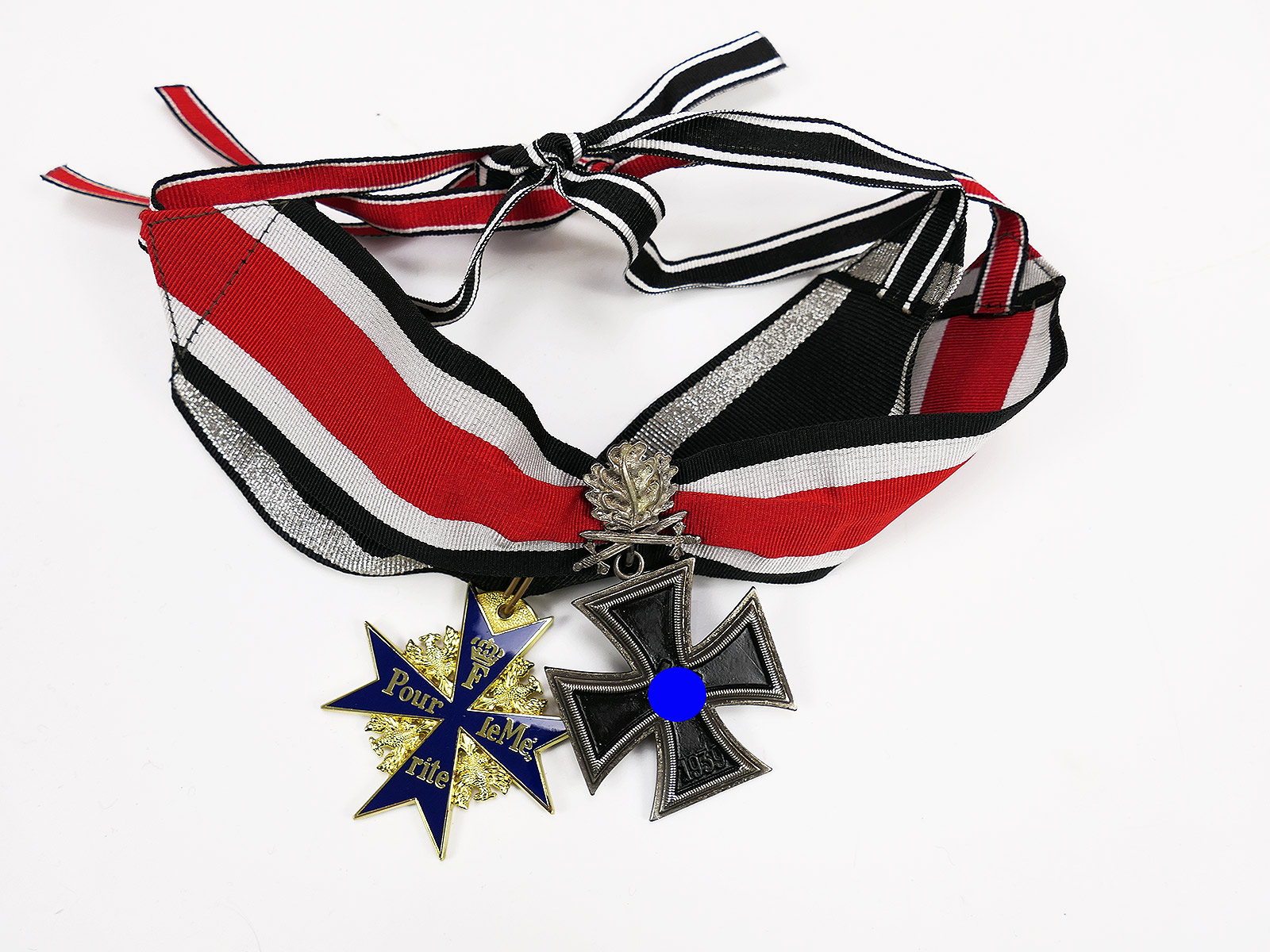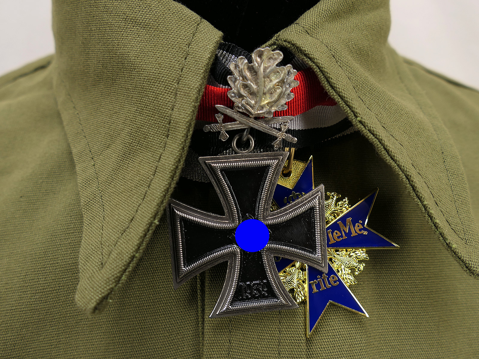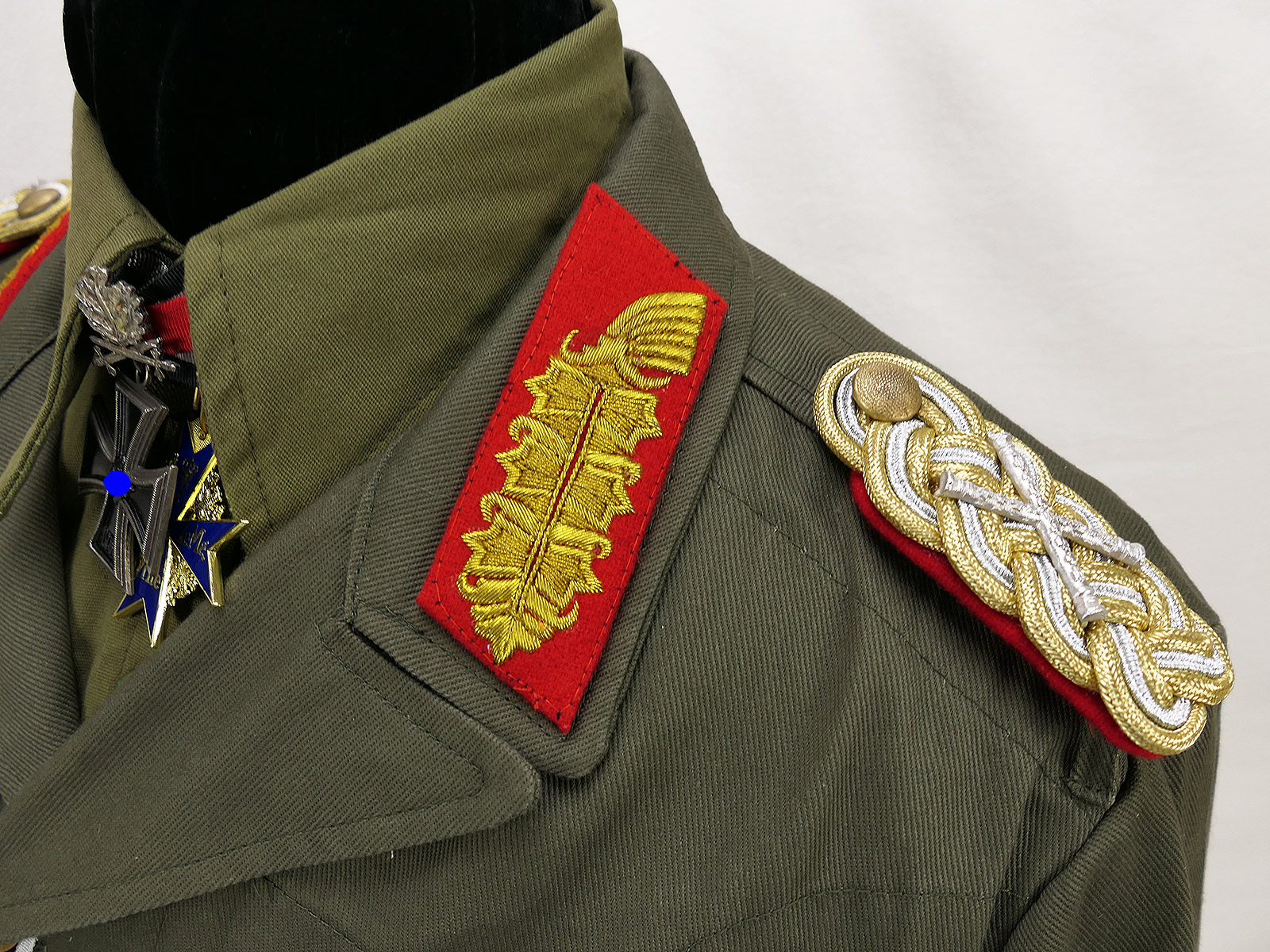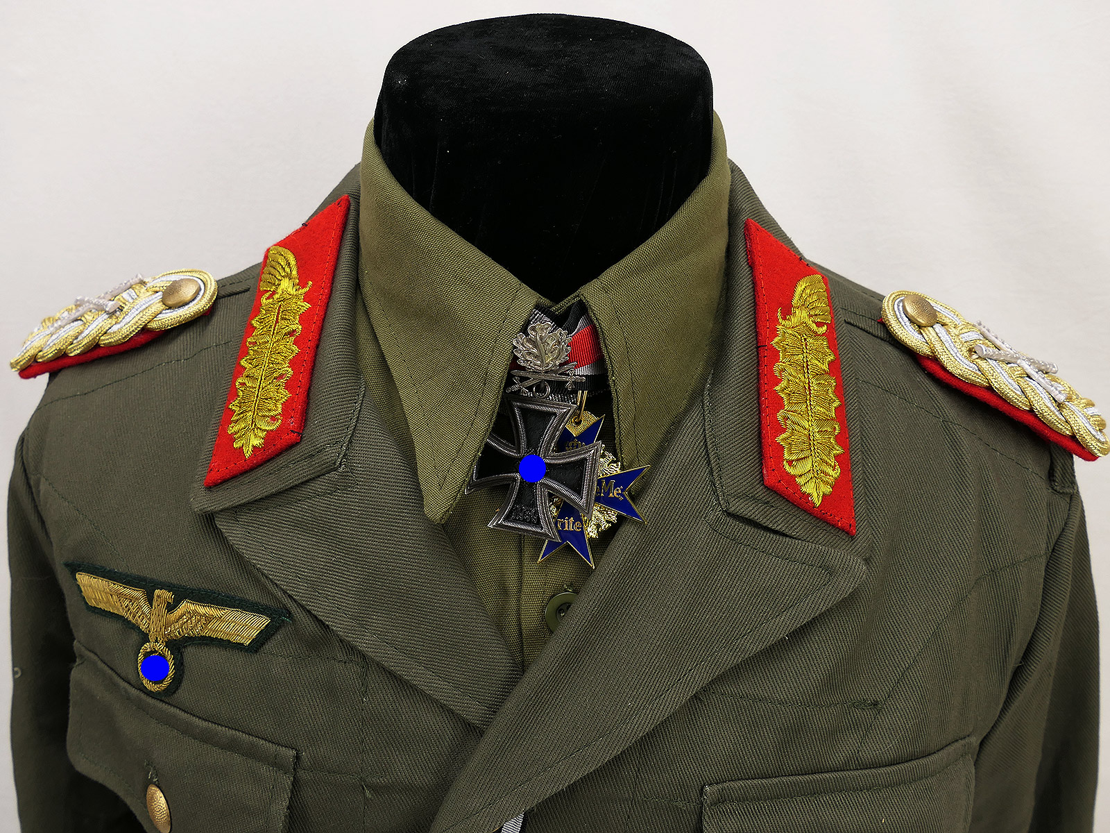 DAK Feldbluse aus schilfgrünem Drillich Baumwollstoff, Afrikakorps Ärmelband gewebt, aufgeschlaufte Generalsschulterstücke mit Auflagen für einen GFM, Kragenspiegel für einen GeneralFm, General M36 Brustadler Metallfaden gestickt, Knöpfe in goldfarben, 3 WK1 Auszeichnungen, Wiederholungsspange Eisernes Kreuz sowie Orden am Band Pour le Mérite und Ritterkreuz mit Eichenlaub und Schwertern.