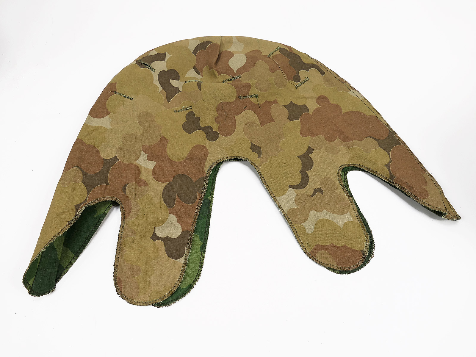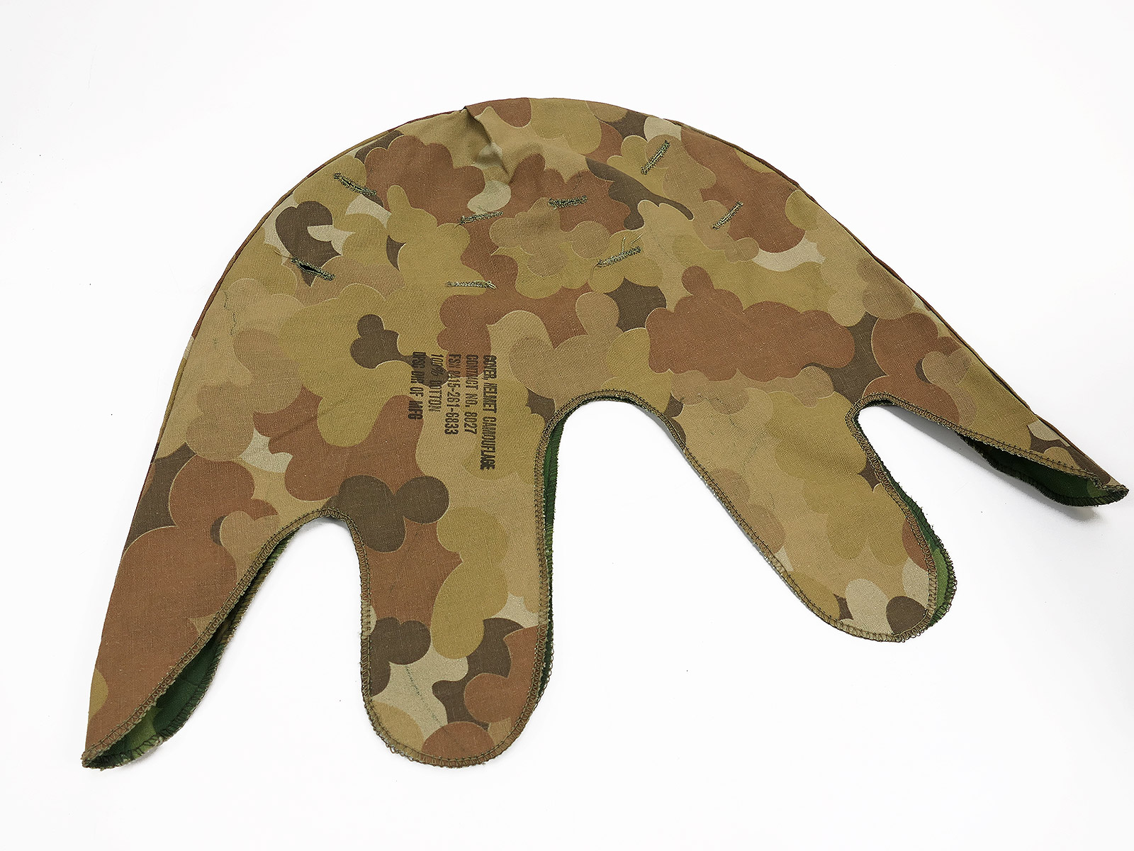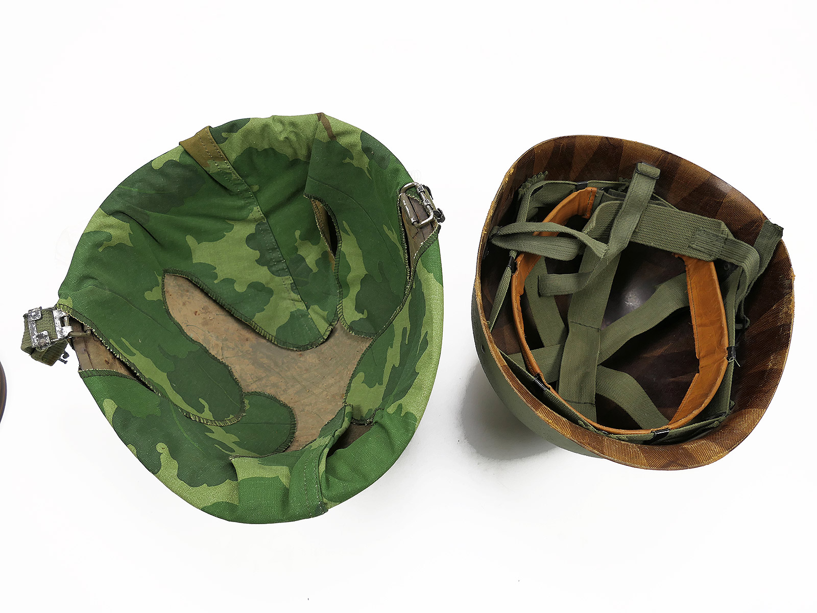 mit antikem Fiber Innenhelm / Liner - Type Vietnam Ära - und Original Mitchell Helmtarnbezug leaf pattern in Top Zustand, sowie dem abgebildeten Zubehör.