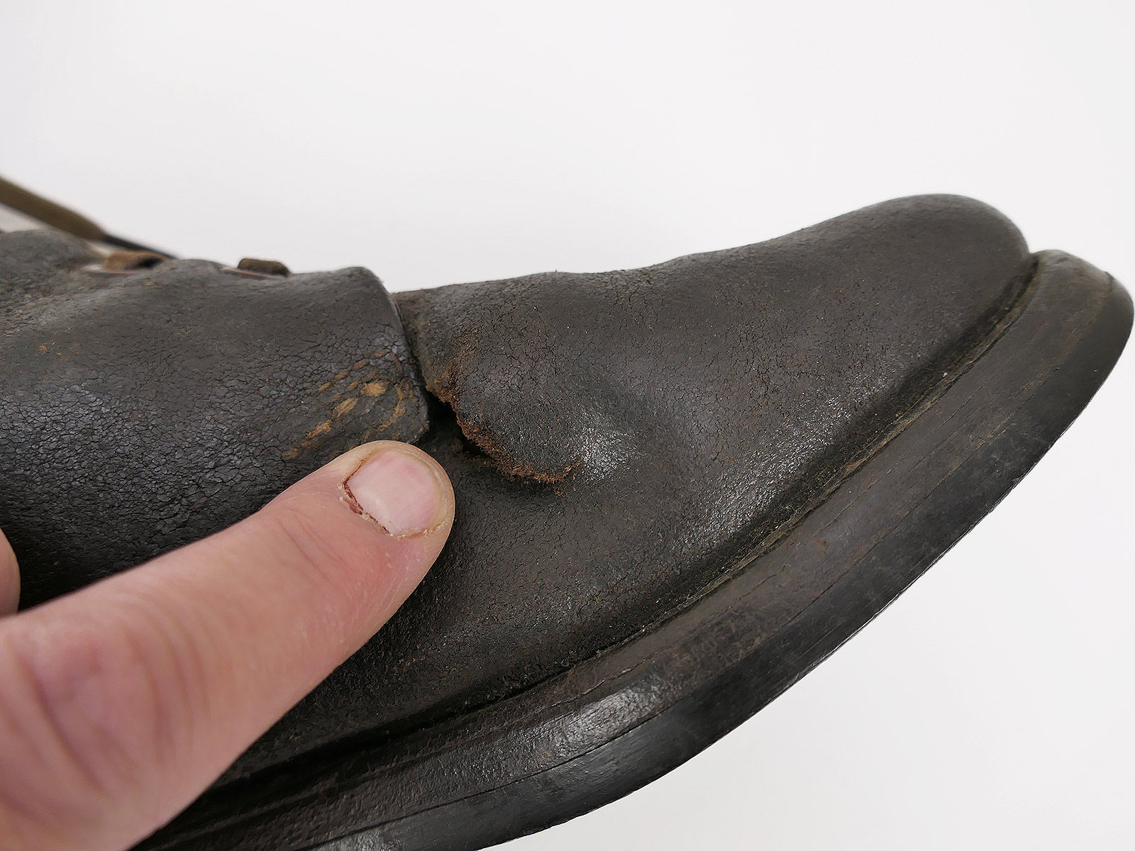 1 Beschädigung am linken Vorderfuß, Innenseite.