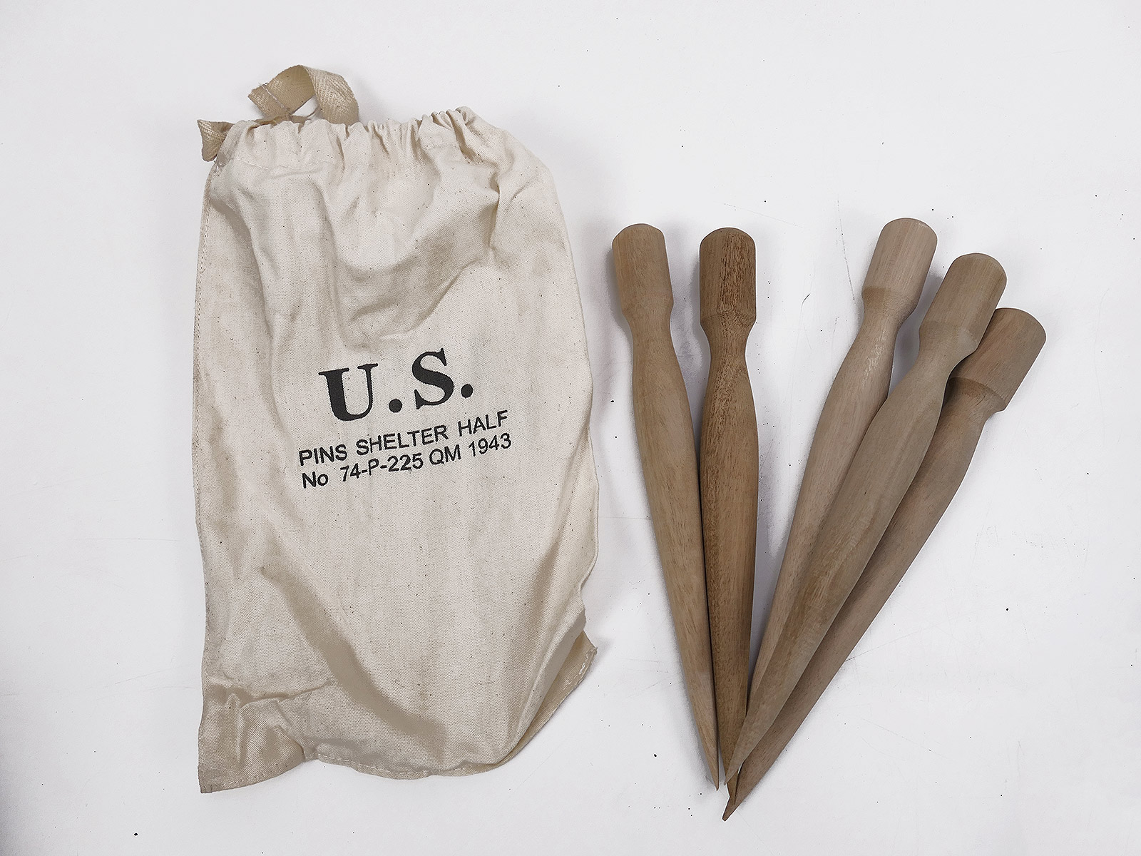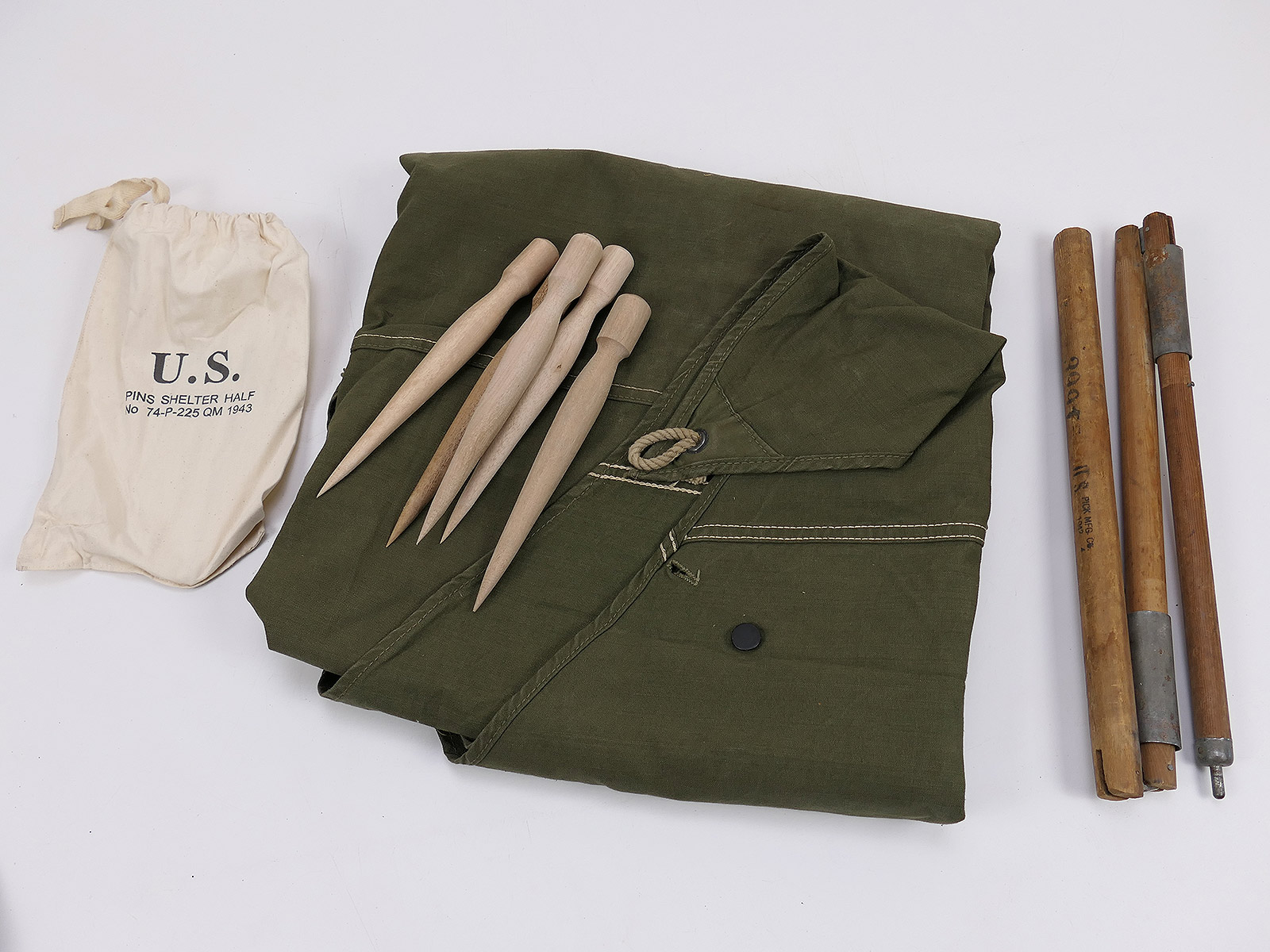 US WW2 Zeltbahn shelter Zeltplane tent half 1945 + Zubehör 5x Holzpflöcke Beutel u. Zeltstange COLLECTION BATTLE WORN