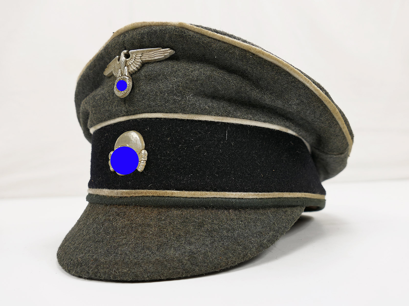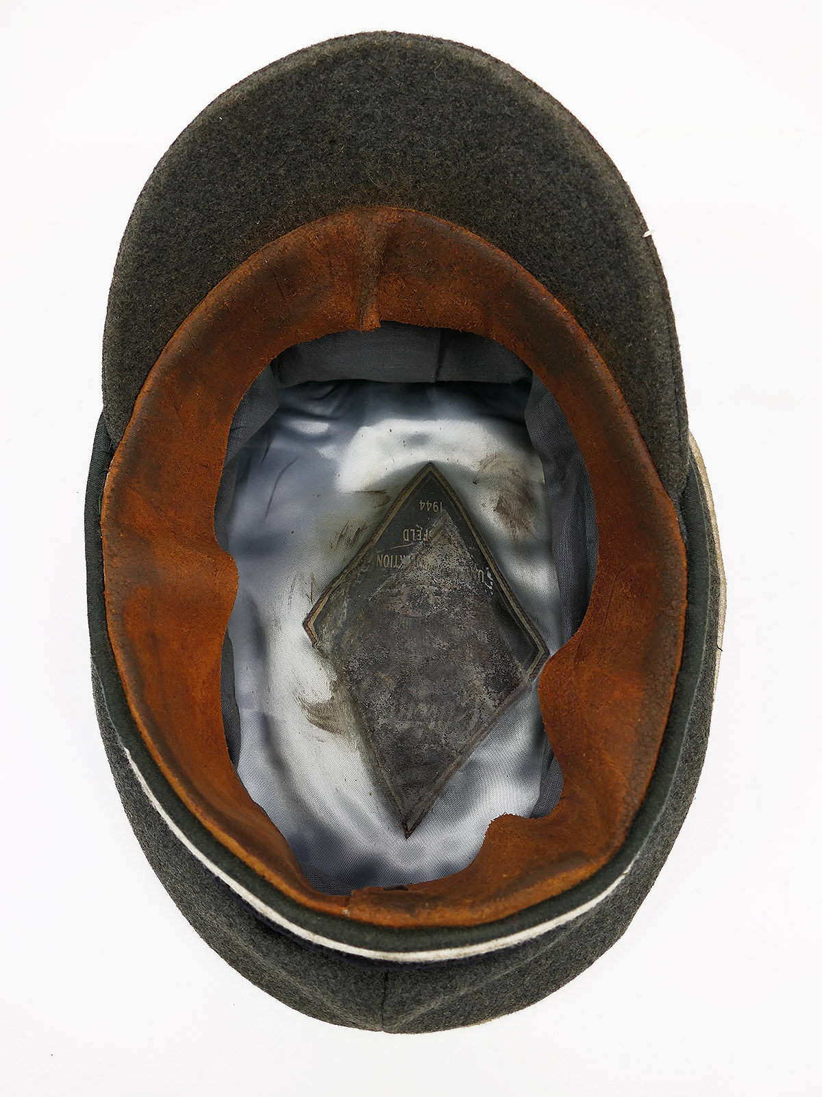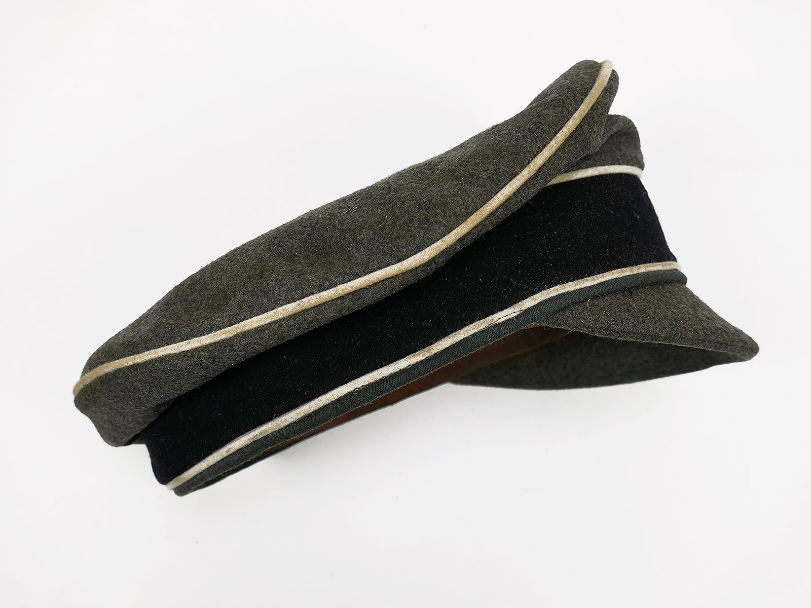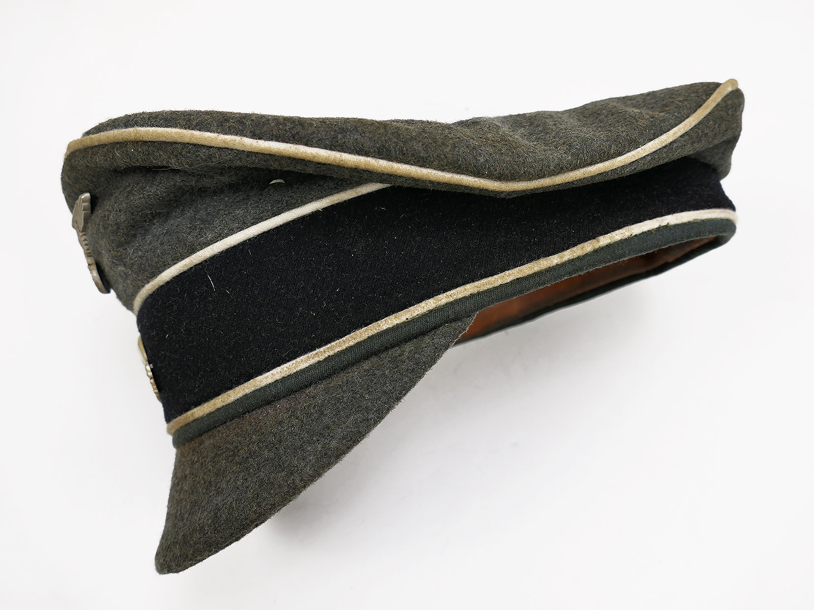Hochwertige Sammleranfertigung (handgenäht in einer kleinen Mützenmanufaktur), getragenes Stück mit altersbedingten Abnutzungsspuren, Tragespuren und Verschmutzungen sowie zusätzlicher Alterung aller Komponenten.