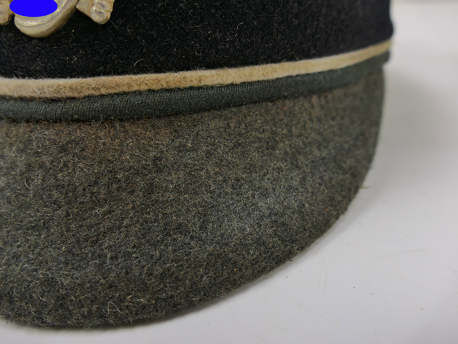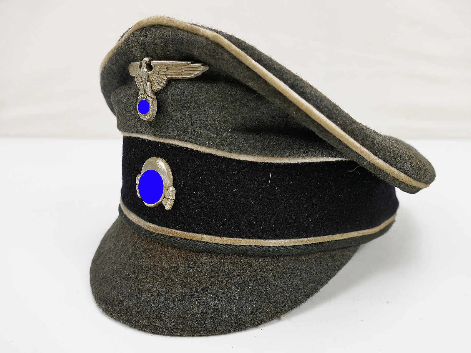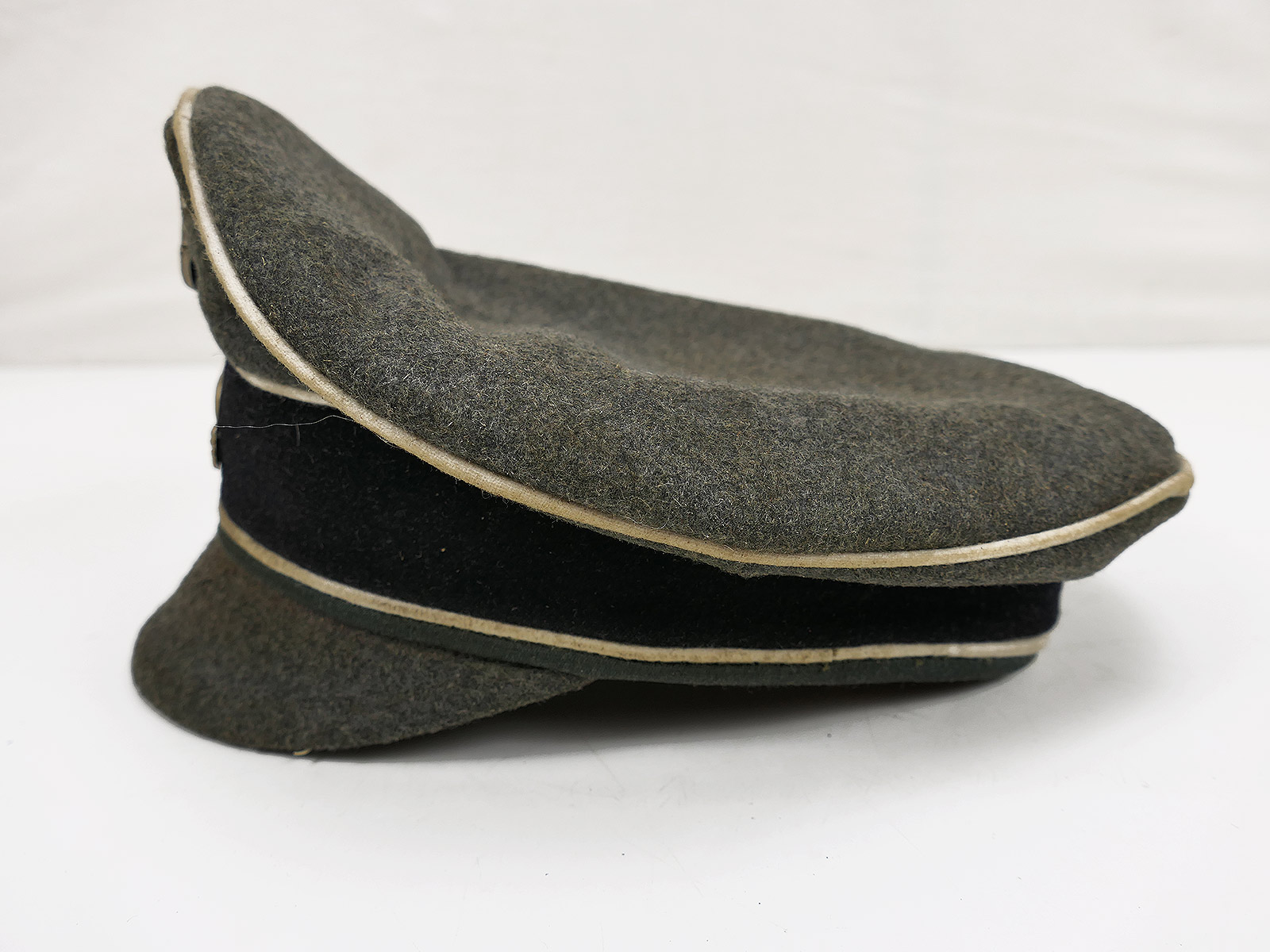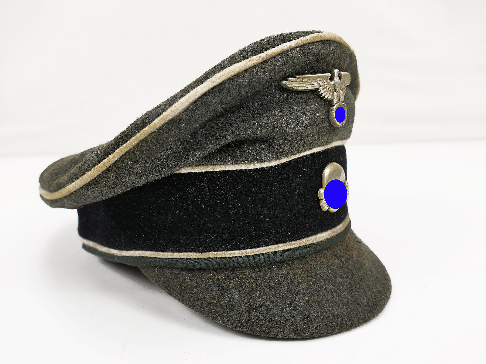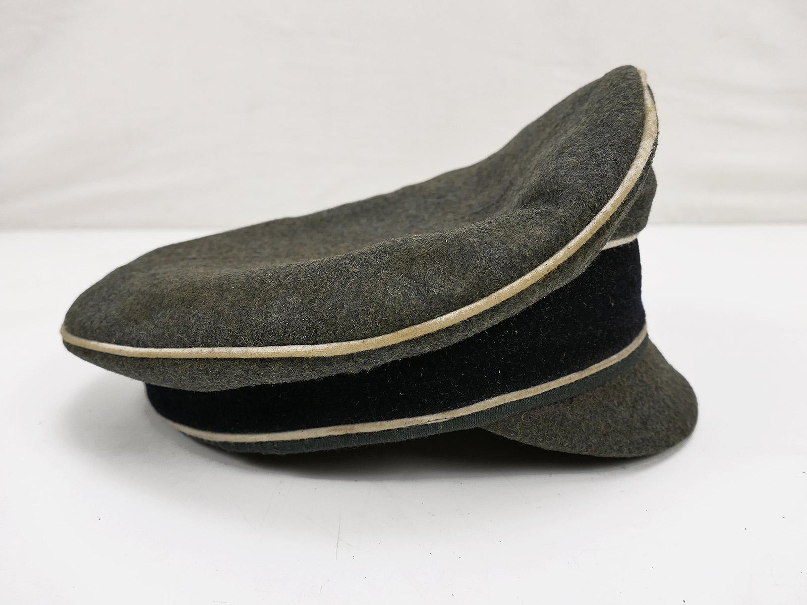 Hochwertige Sammleranfertigung (handgenäht in einer kleinen Mützenmanufaktur), getragenes Stück mit altersbedingten Abnutzungsspuren, Tragespuren und Verschmutzungen sowie zusätzlicher Alterung aller Komponenten.