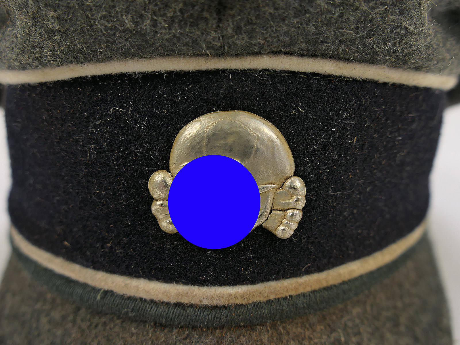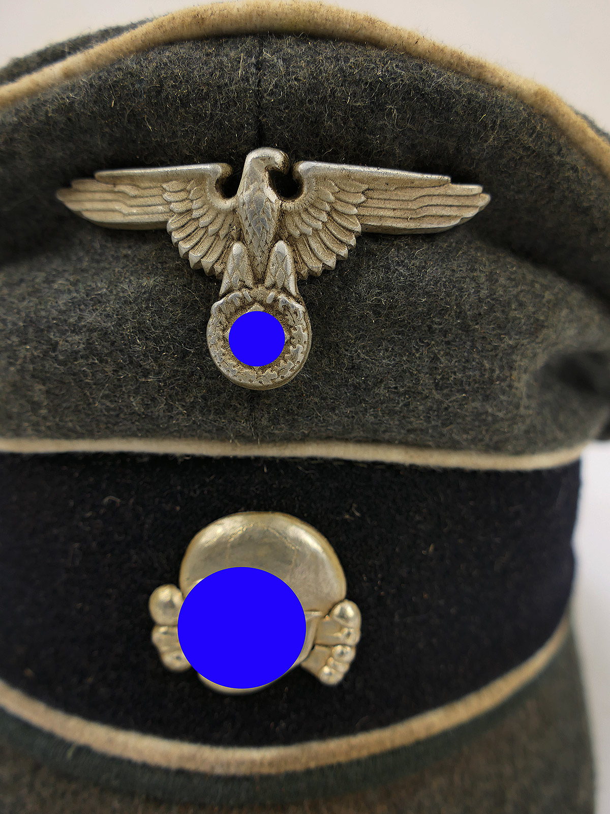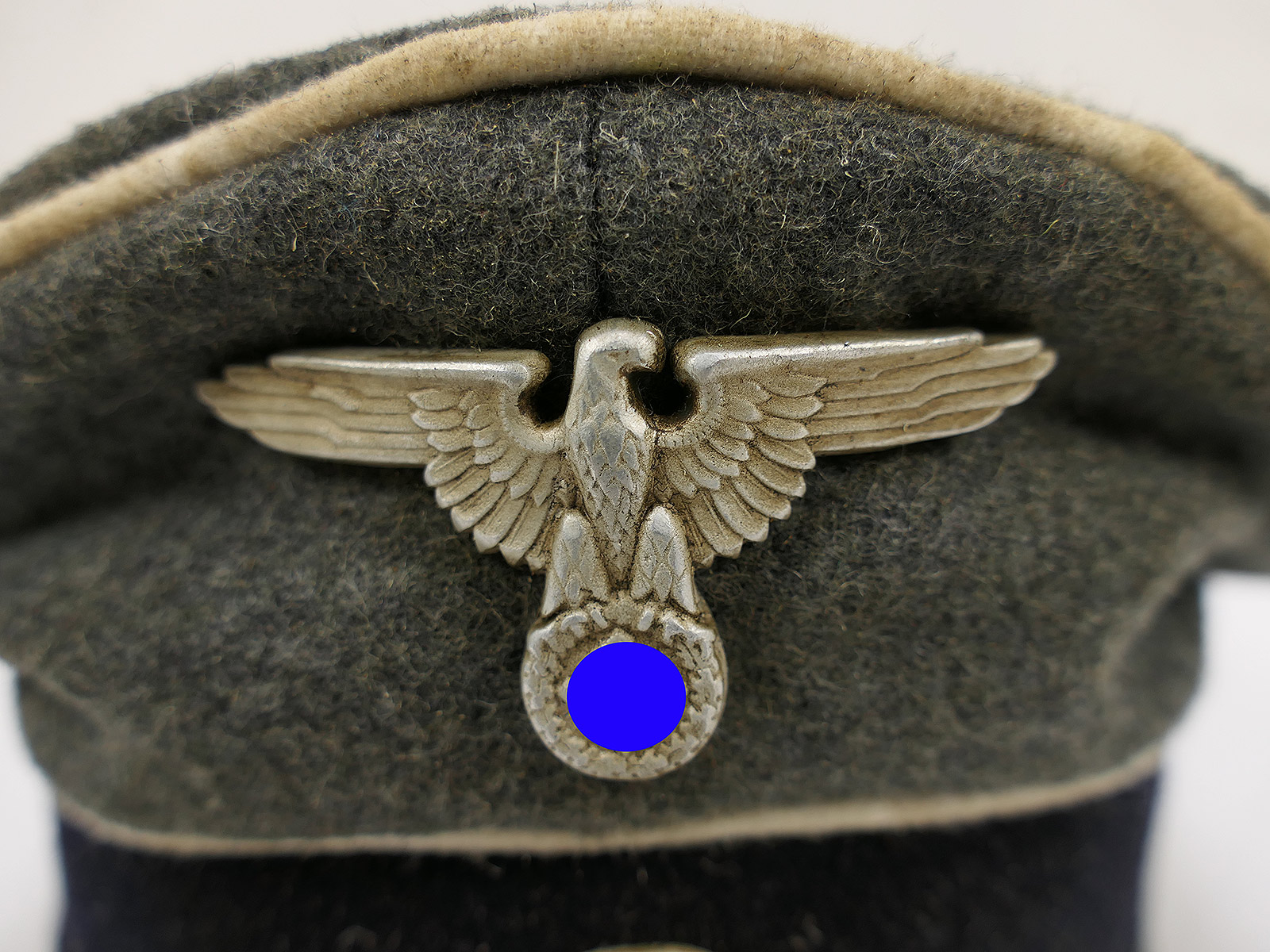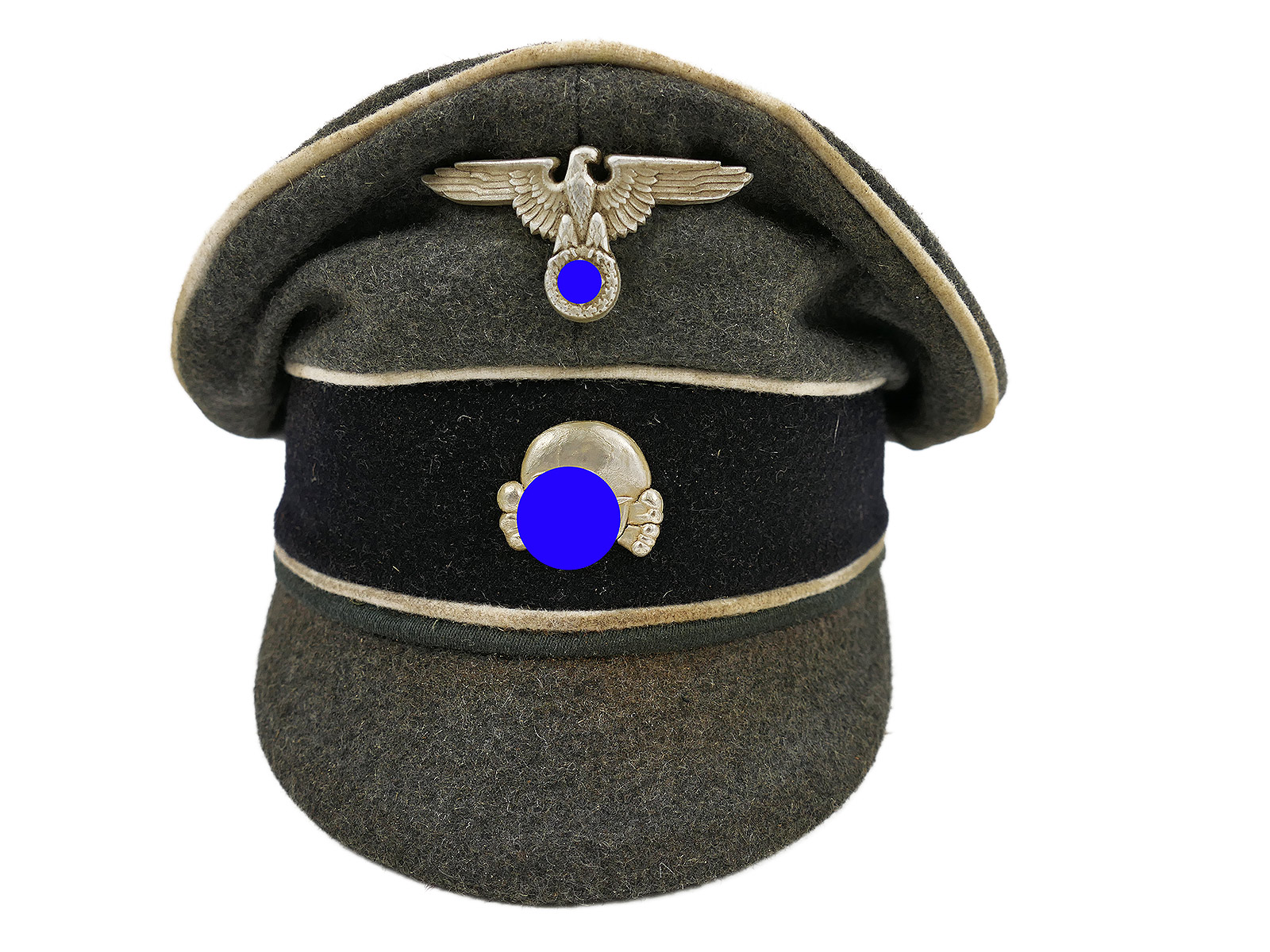 Hochwertige Sammleranfertigung (handgenäht in einer kleinen Mützenmanufaktur), getragenes Stück mit altersbedingten Abnutzungsspuren, Tragespuren und Verschmutzungen sowie zusätzlicher Alterung aller Komponenten.