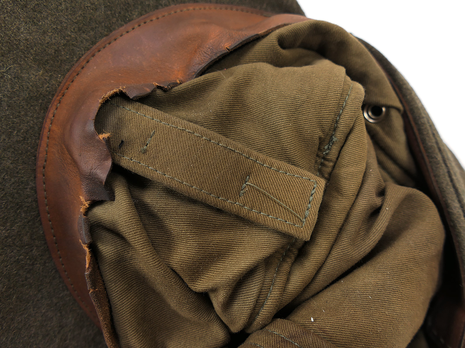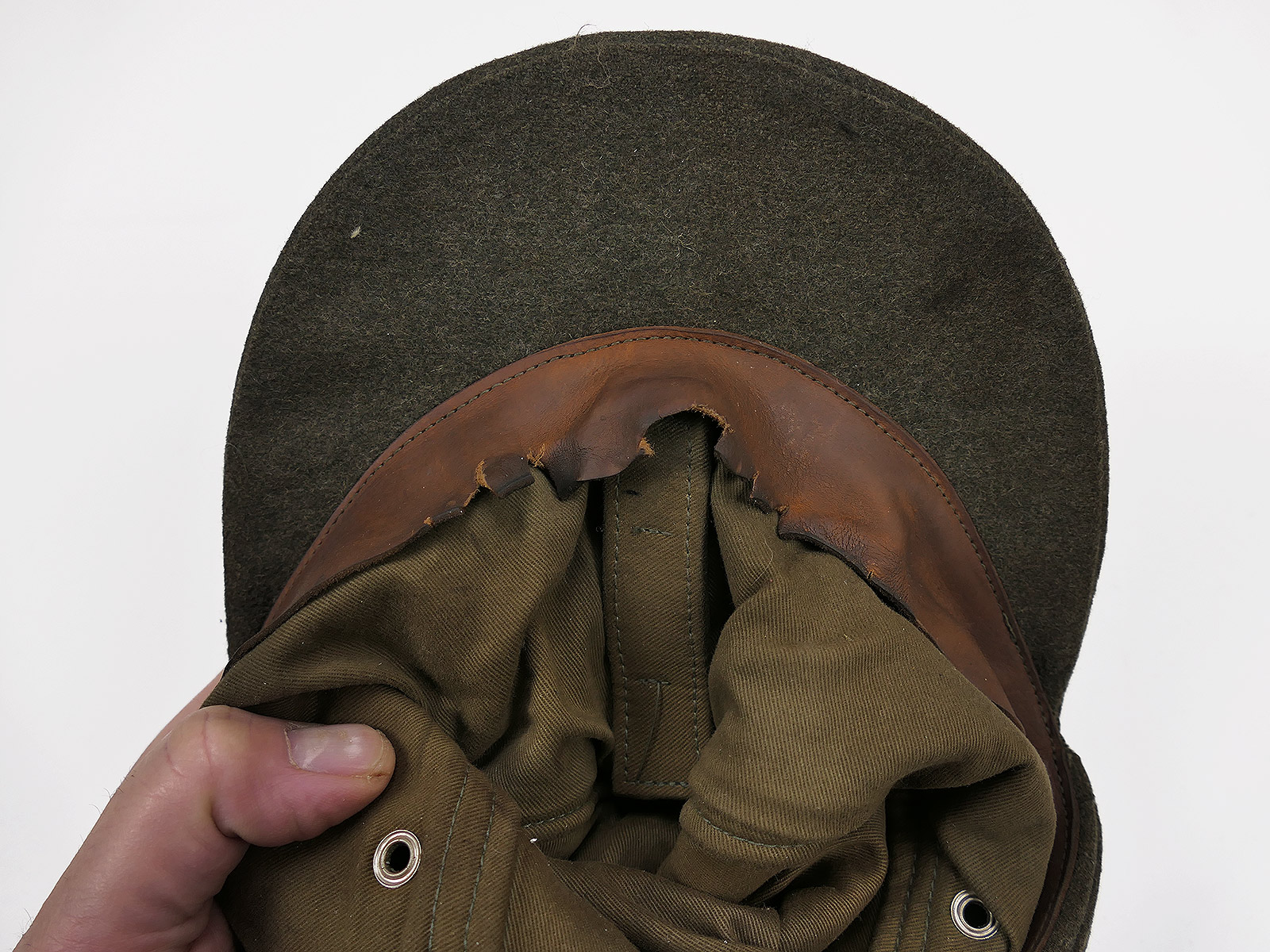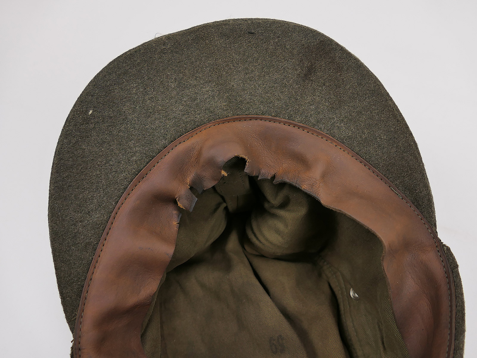 aus Vintage Wolltuch, mit Baumwoll Innenfutter und Leder Schweißband, handgeschneidert, mit Trapez T-Effekten.