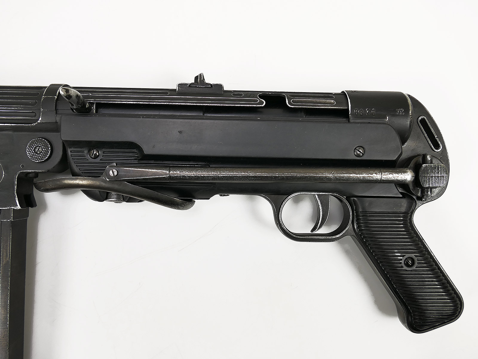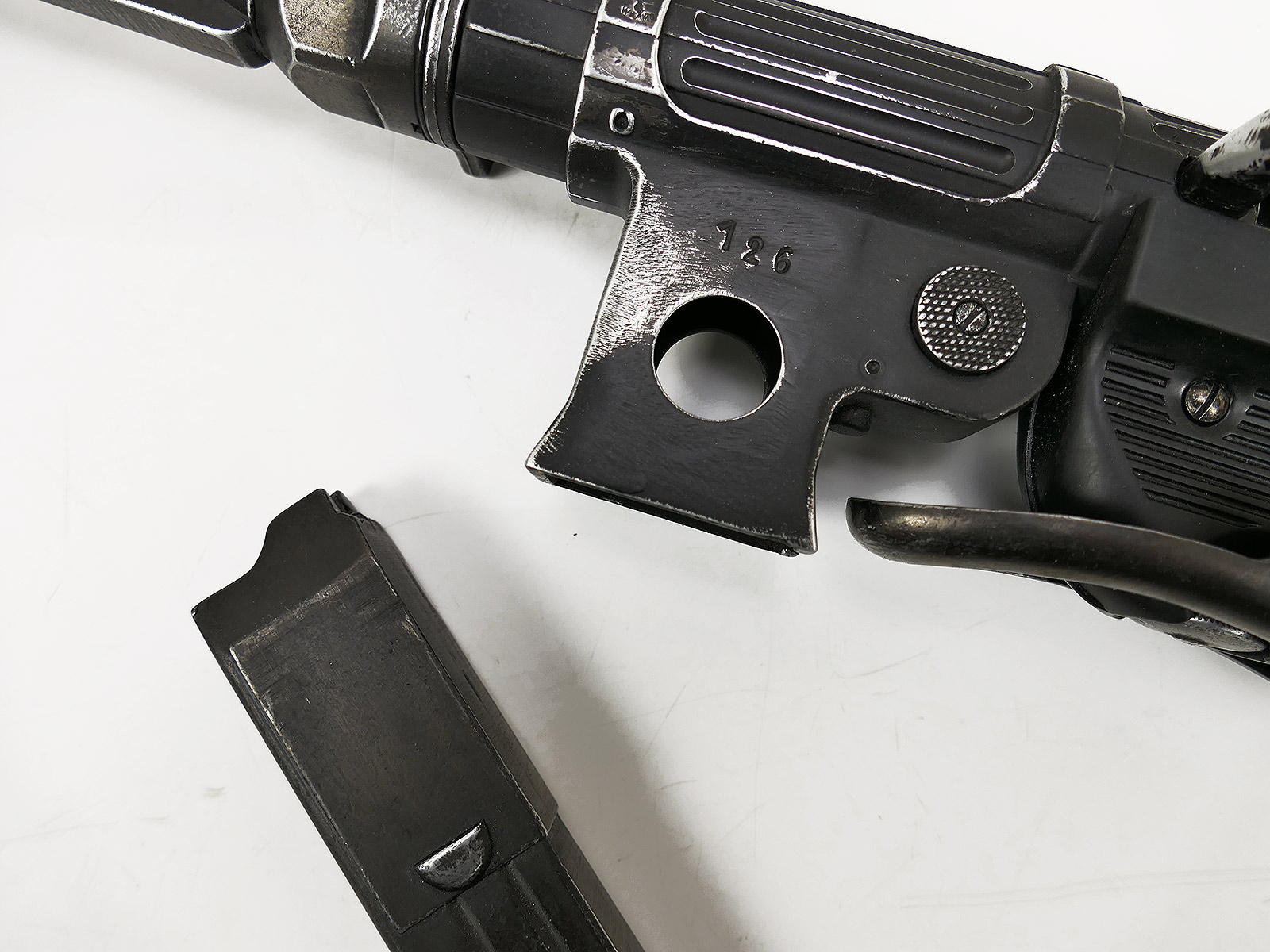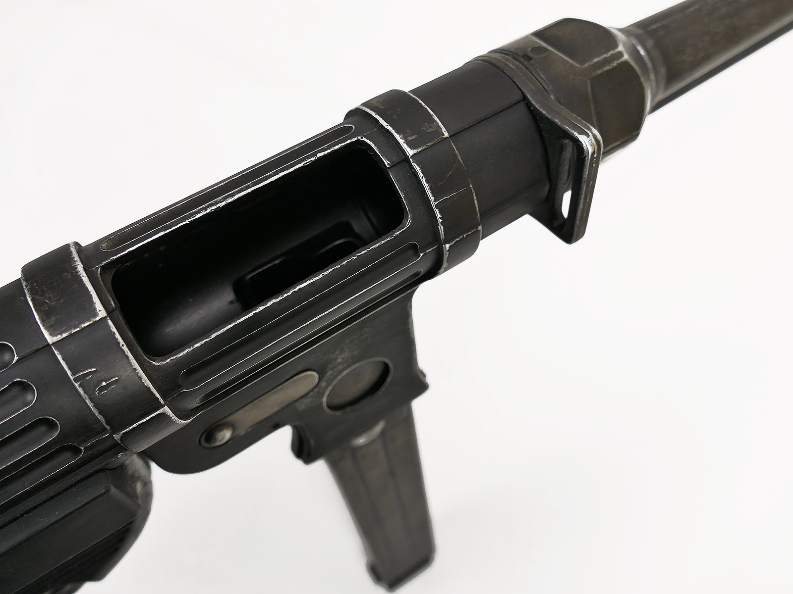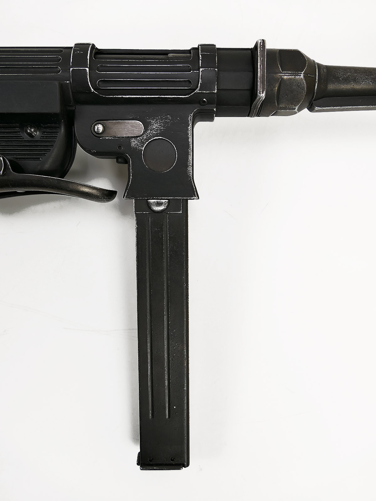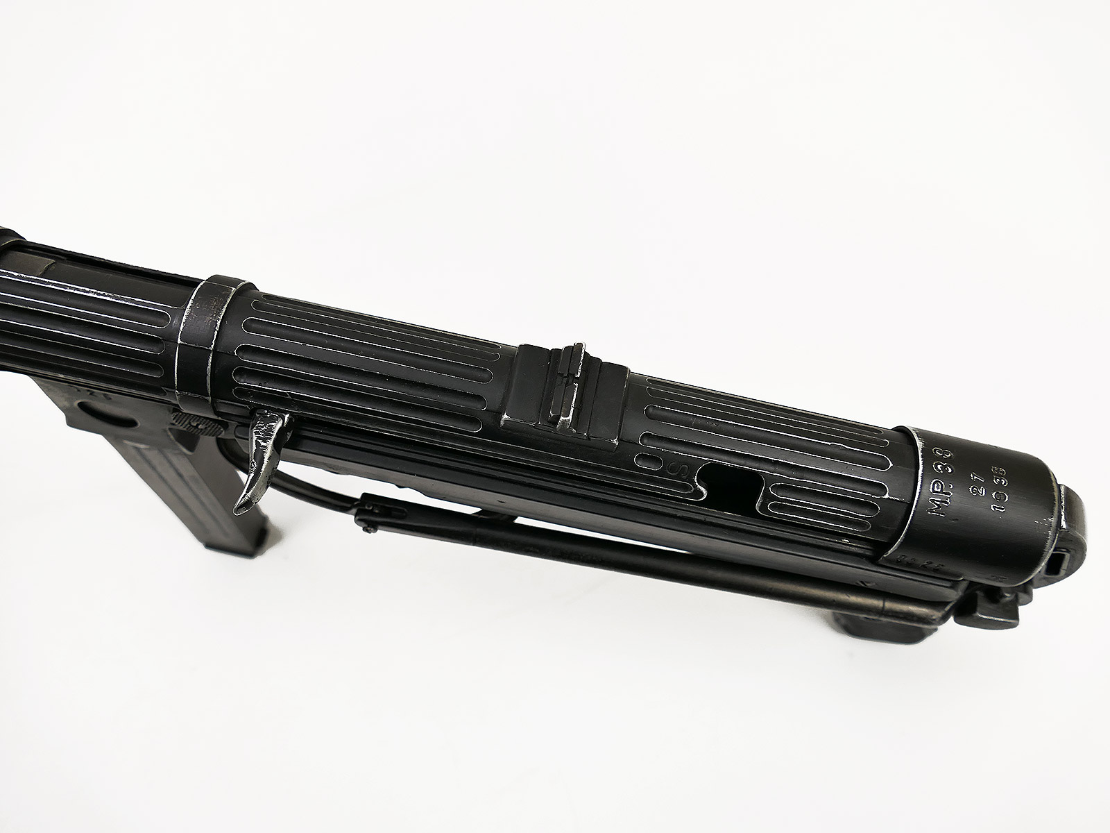 Ursprünglich eine MP40 der Firma Denix, hier von Hand zu einer MP38 umgebaut.