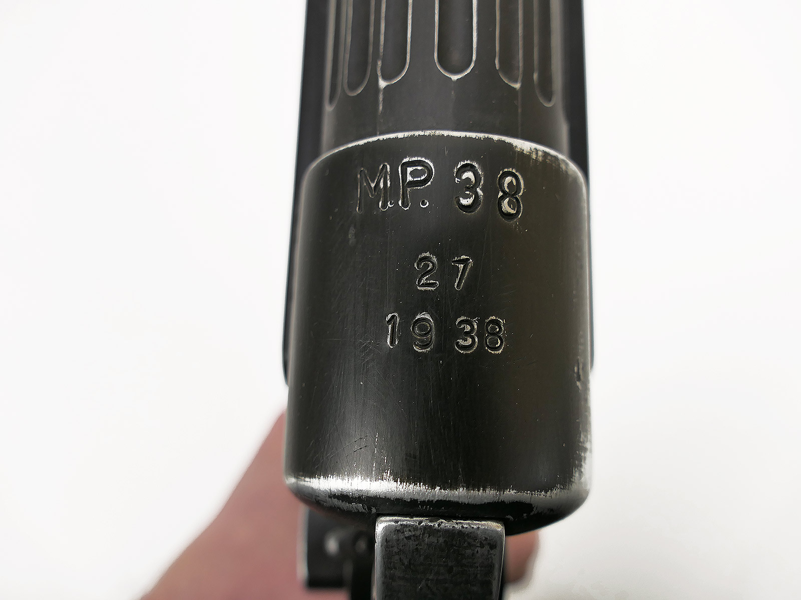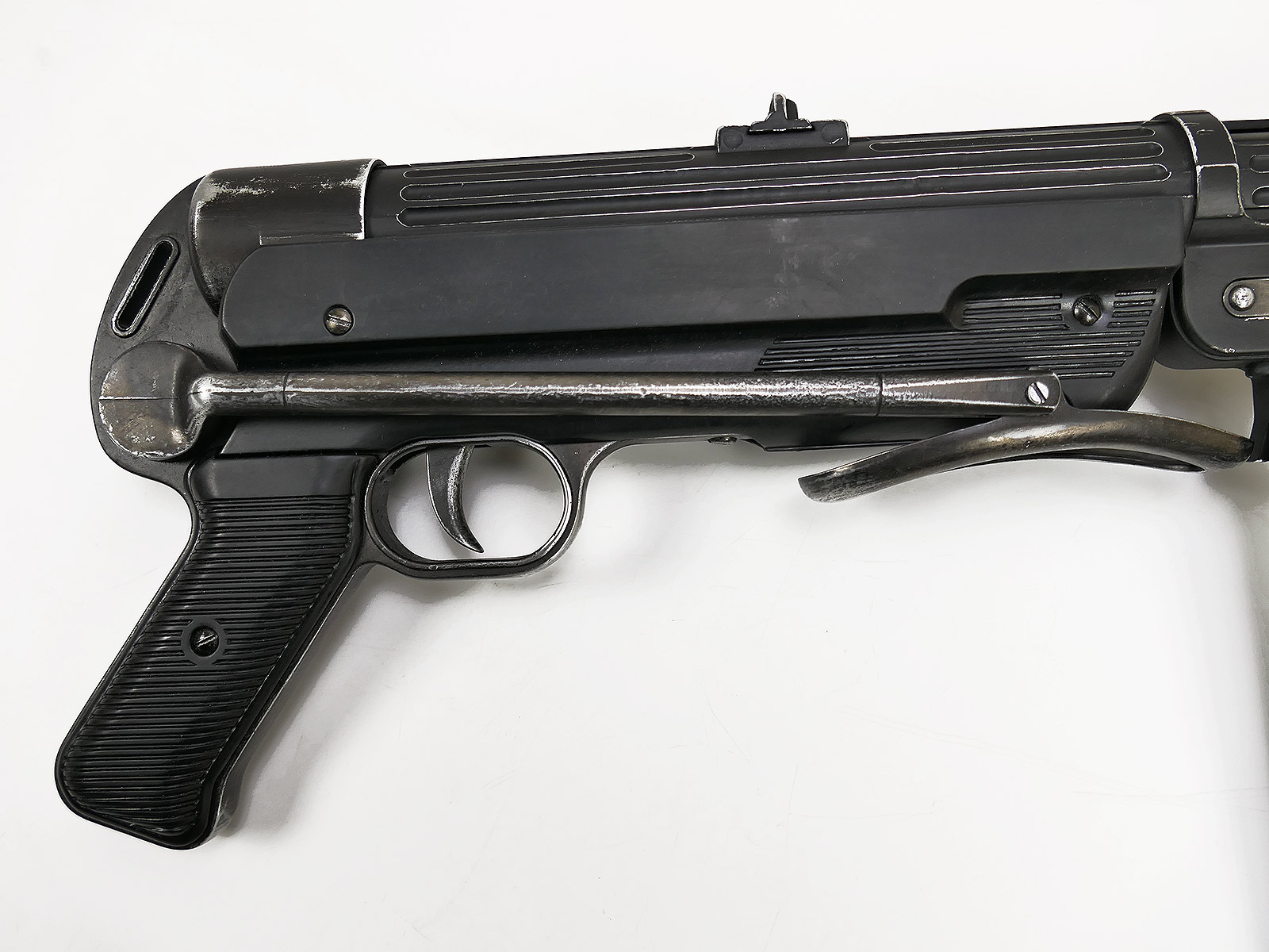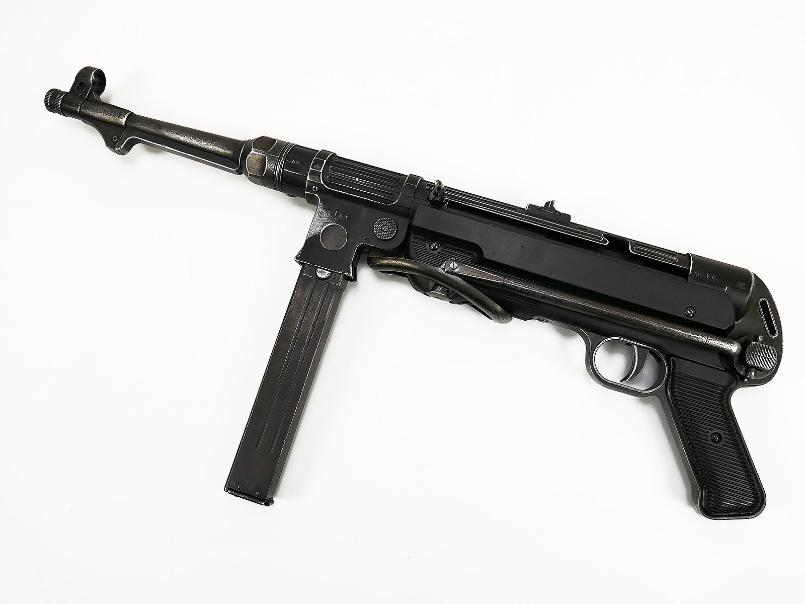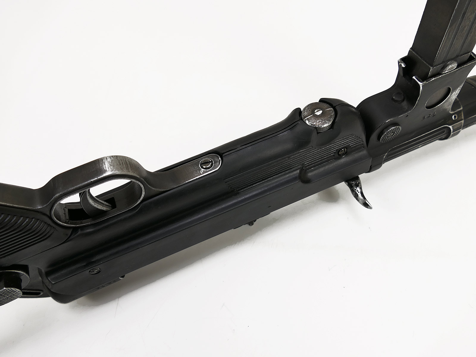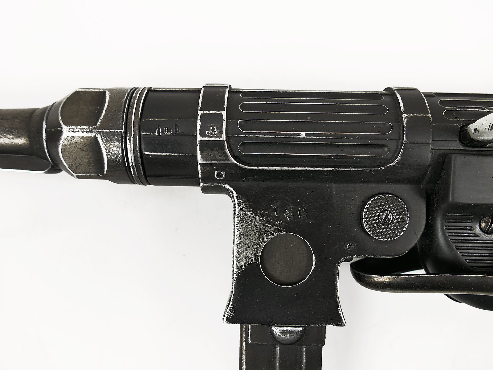Ursprünglich eine MP40 der Firma Denix, hier von Hand zu einer MP38 umgebaut.