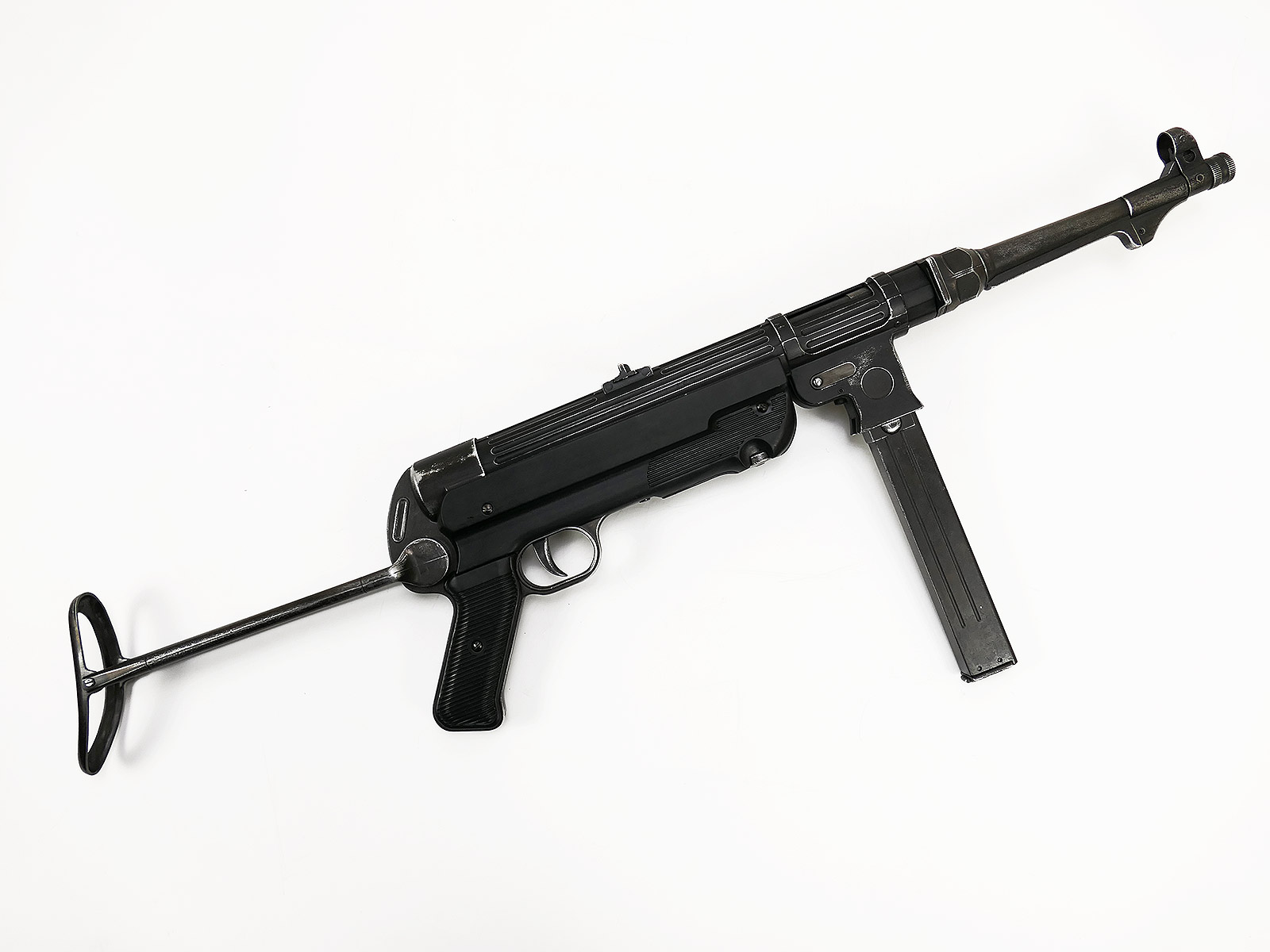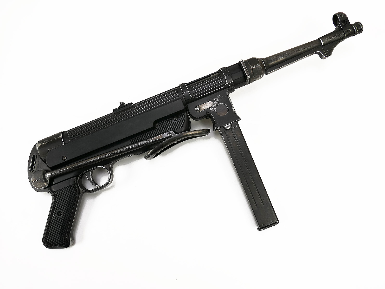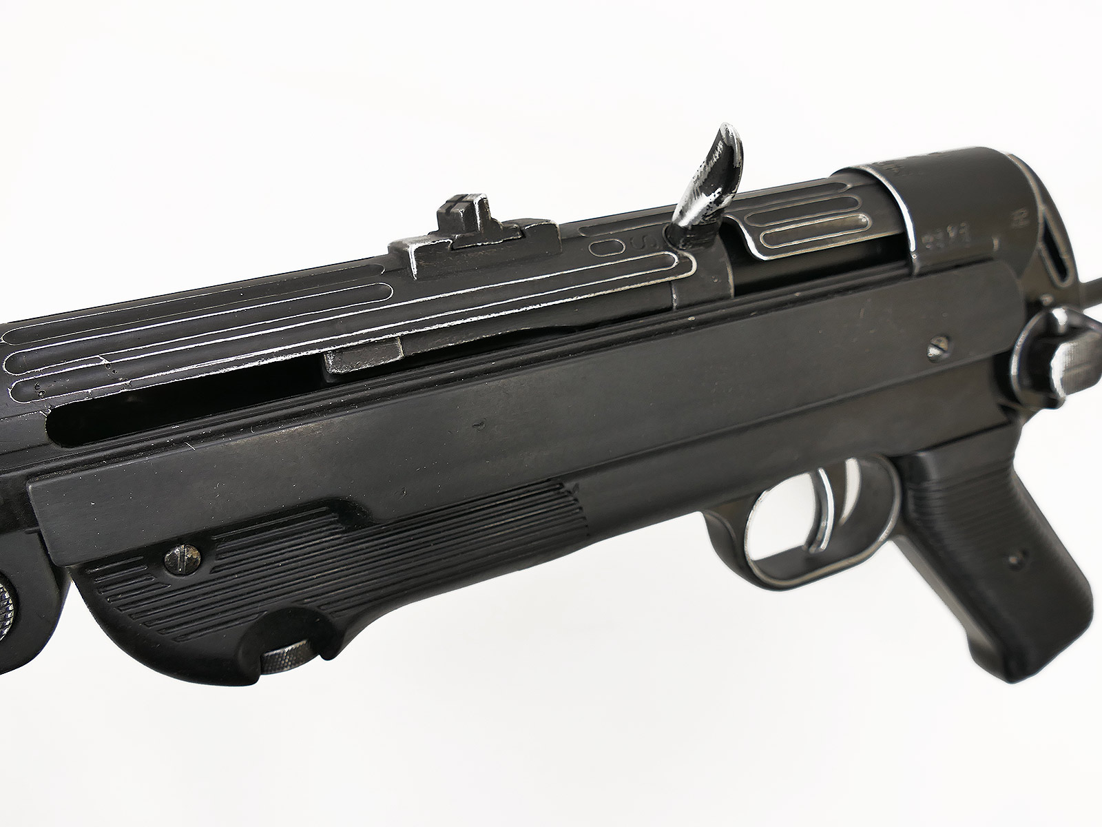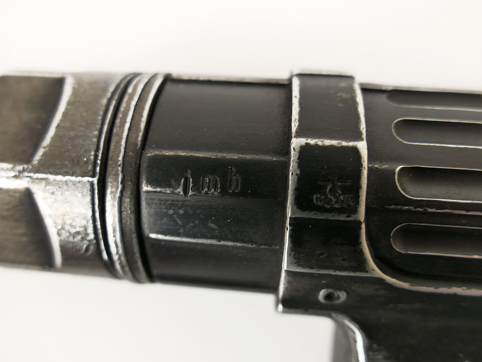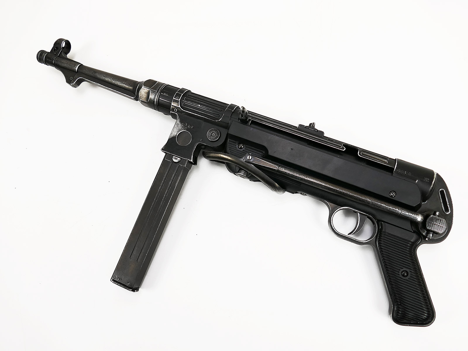 Ursprünglich eine MP40 der Firma Denix, hier von Hand zu einer MP38 umgebaut.