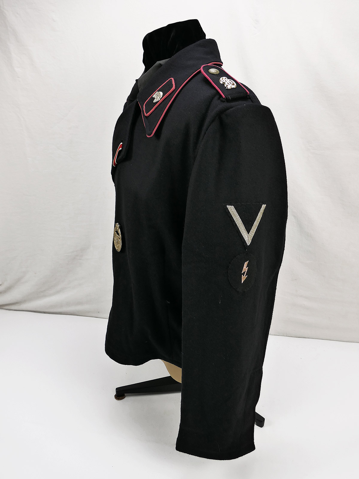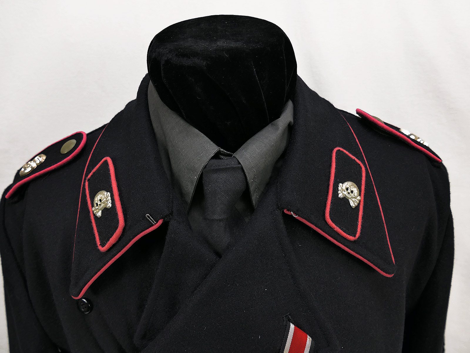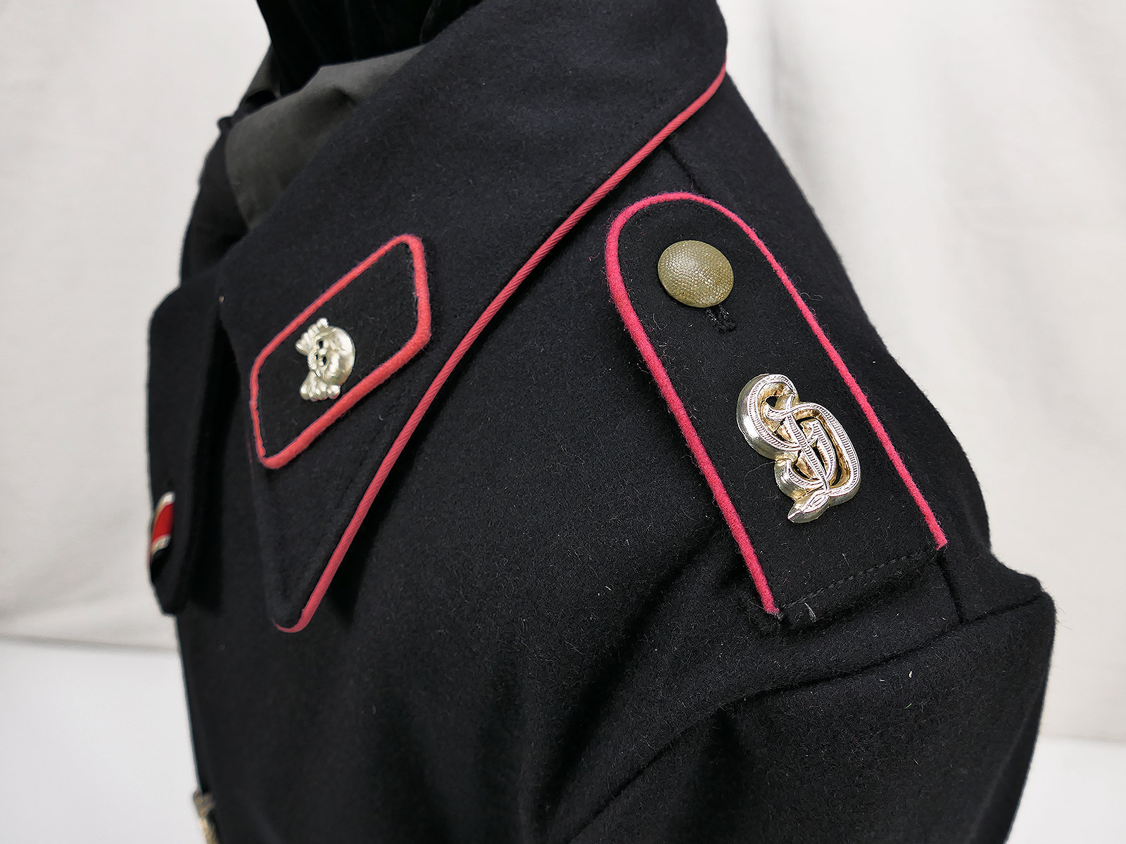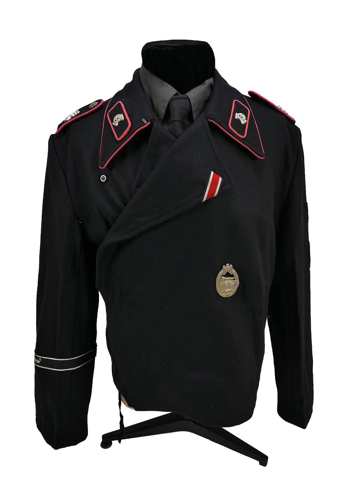 Die Panzerbluse besteht aus schwerem, tiefschwarzen Wolltuch im Schnitt der Wehrmacht mit Baumwollinnenfutter. Der Kragen ist geschönt mit einer Papell in der Waffenfarbe rosa für die Panzertruppe. Die Knopfleiste ist innen mit Seidenfutter ausgelegt. Die Jacke ist innen links und rechts mit Zugbändern ausgestattet damit die Bluse eng am Körper getragen werden kann. Auf der Bluse sind die Kragenspiegel vernäht deren Paspellierung in etwa den gleichen Farbton triff wie die am Kragen. Auf den Schulterstücken befinden sich Metallauflagen mit den Buchstaben "GD" für die vollmotorisierte Division "Großdeutschland". Auf der linken Brustseite befindet sich ein Panzerkampfabzeichen in "silber".
