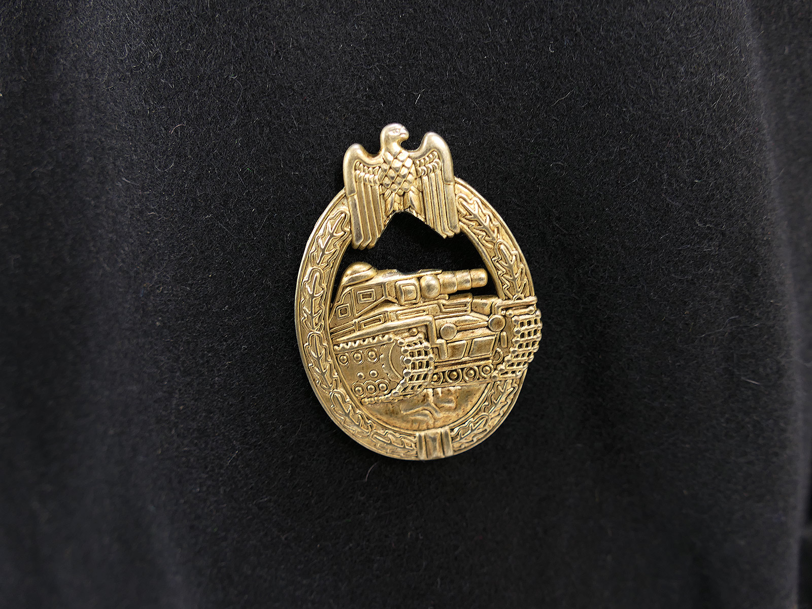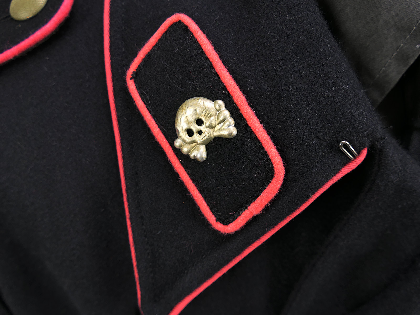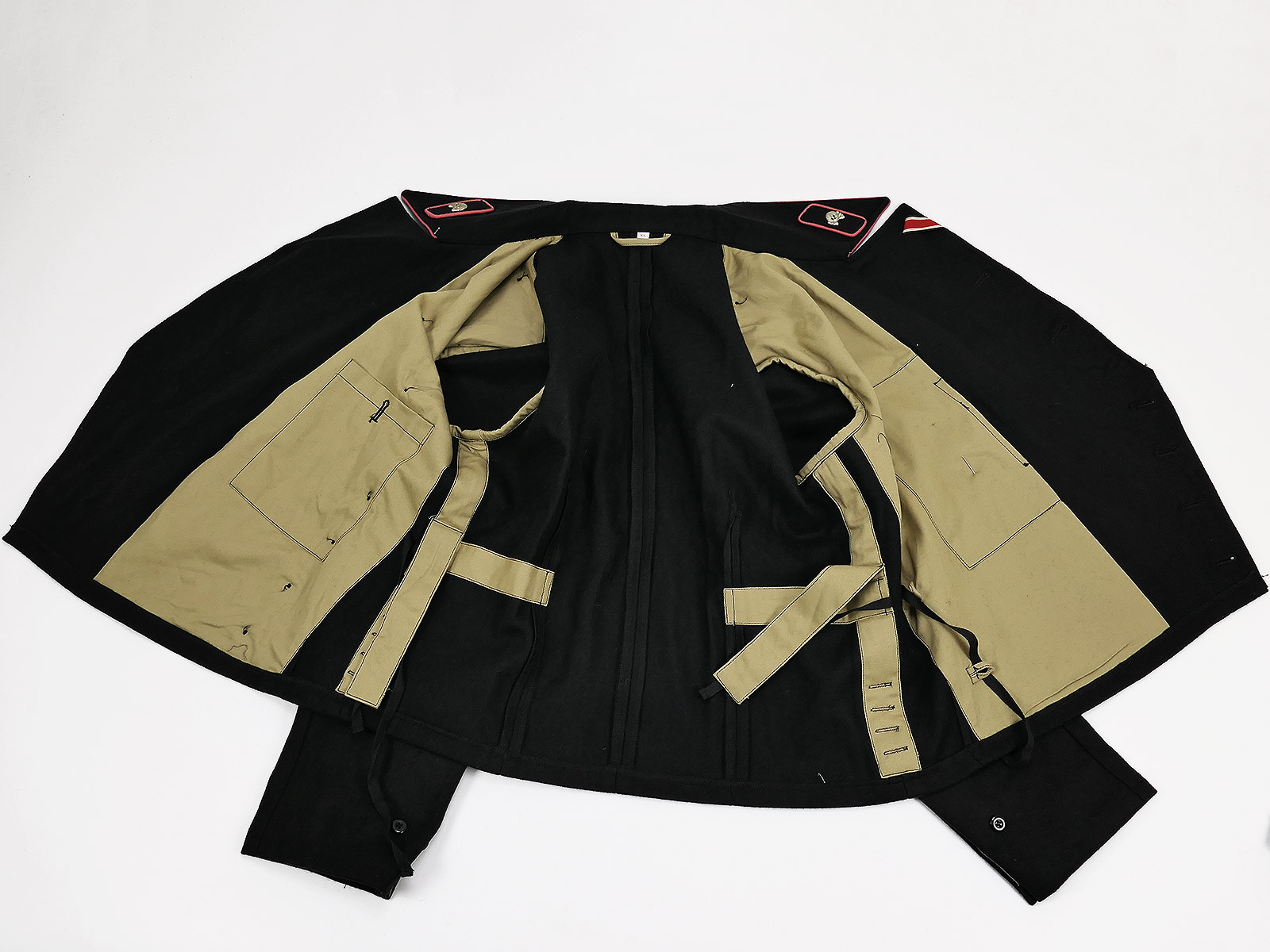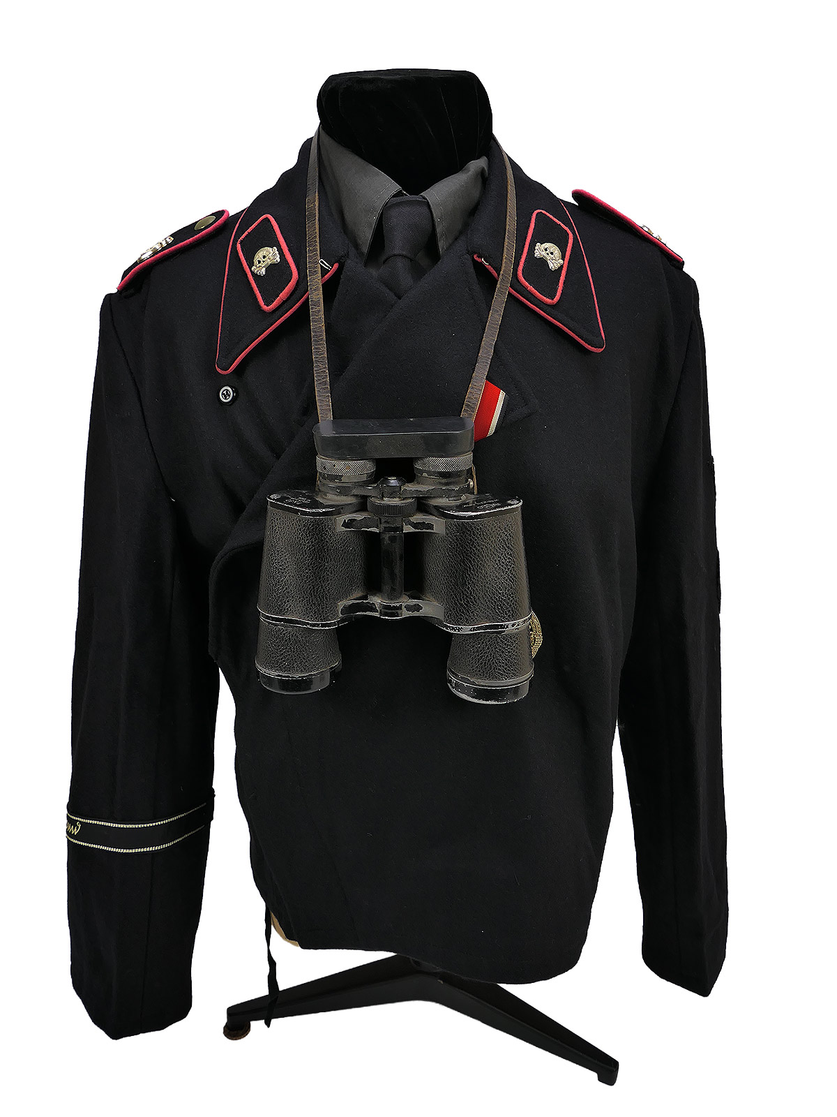 Die Panzerbluse besteht aus schwerem, tiefschwarzen Wolltuch im Schnitt der Wehrmacht mit Baumwollinnenfutter. Der Kragen ist geschönt mit einer Papell in der Waffenfarbe rosa für die Panzertruppe. Die Knopfleiste ist innen mit Seidenfutter ausgelegt. Die Jacke ist innen links und rechts mit Zugbändern ausgestattet damit die Bluse eng am Körper getragen werden kann. Auf der Bluse sind die Kragenspiegel vernäht deren Paspellierung in etwa den gleichen Farbton triff wie die am Kragen. Auf den Schulterstücken befinden sich Metallauflagen mit den Buchstaben "GD" für die vollmotorisierte Division "Großdeutschland". Auf der linken Brustseite befindet sich ein Panzerkampfabzeichen in "silber".