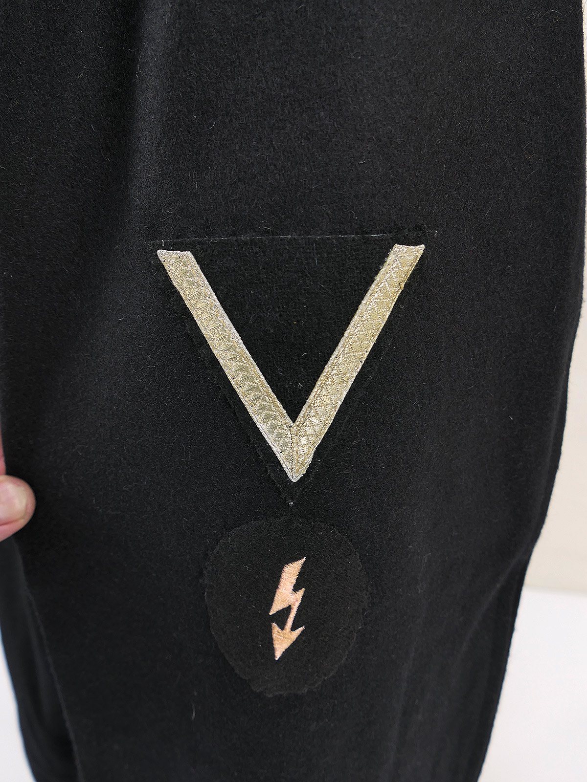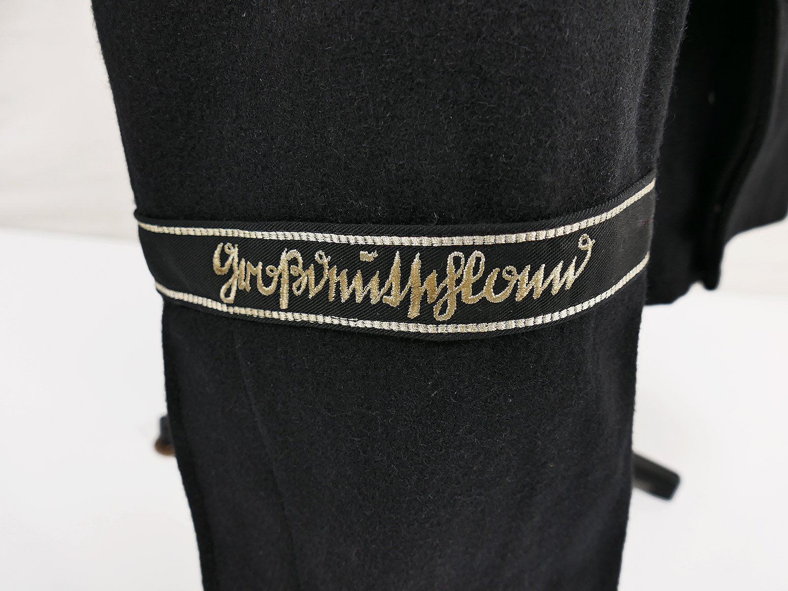 Am rechten Unterarm wurde das Ärmelband "Großdeutschland" vernäht in maschinengestickter Ausführung passend zur schwarzen Panzerbluse auf schwarzem Untergrund. Im Knopfloch befindet sich ein original Bandabschnitt vom Eisernen Kreuz 2. Klasse. Auf dem linken Oberarm befindet sich ein schwarzer Gefreitenwinkel sowie ein Funkerabzeichen.