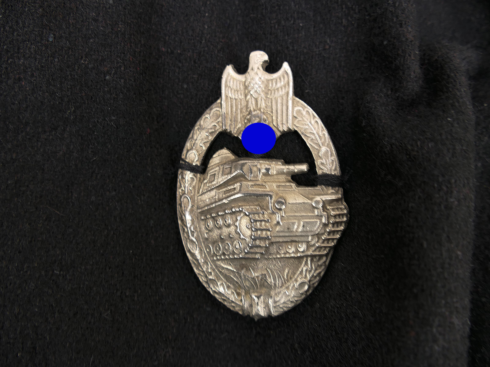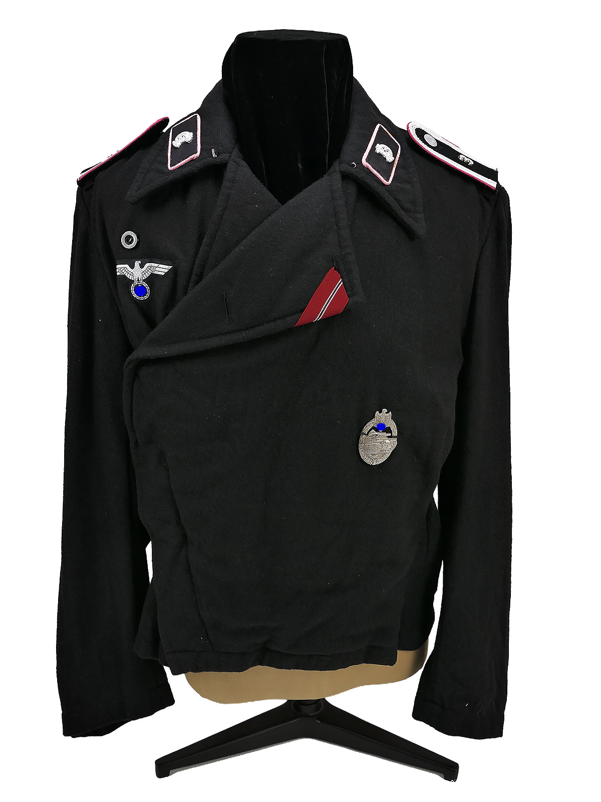 Schwarze effektierte Panzerjacke in der WH-Ausführung, geschwungene Front Knopfreihe (Gr. L / 52 Deutsch), mit allen Effekten/ Auszeichnungen wie auf den Bildern zu sehen