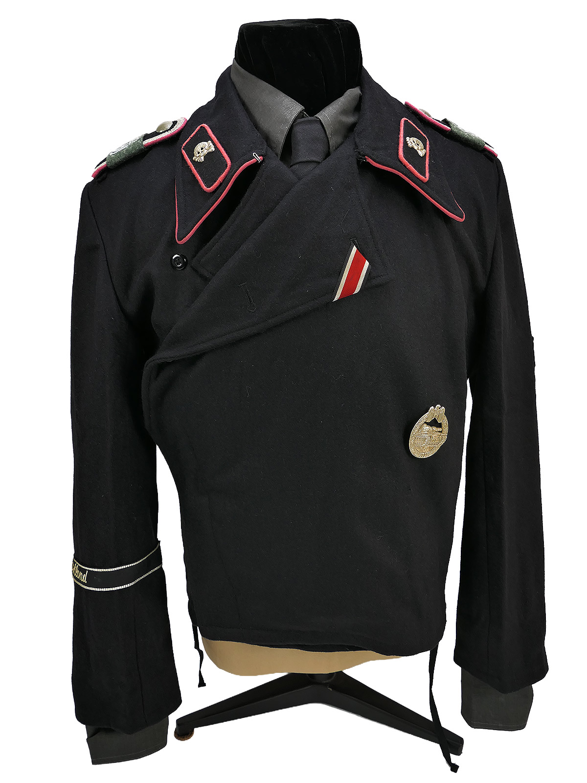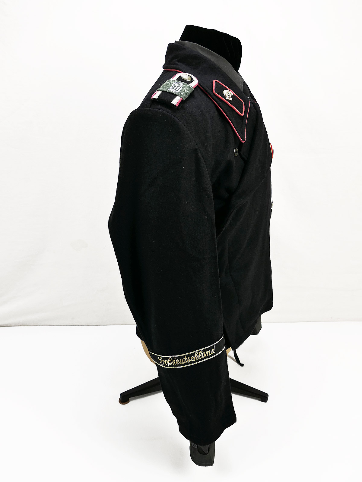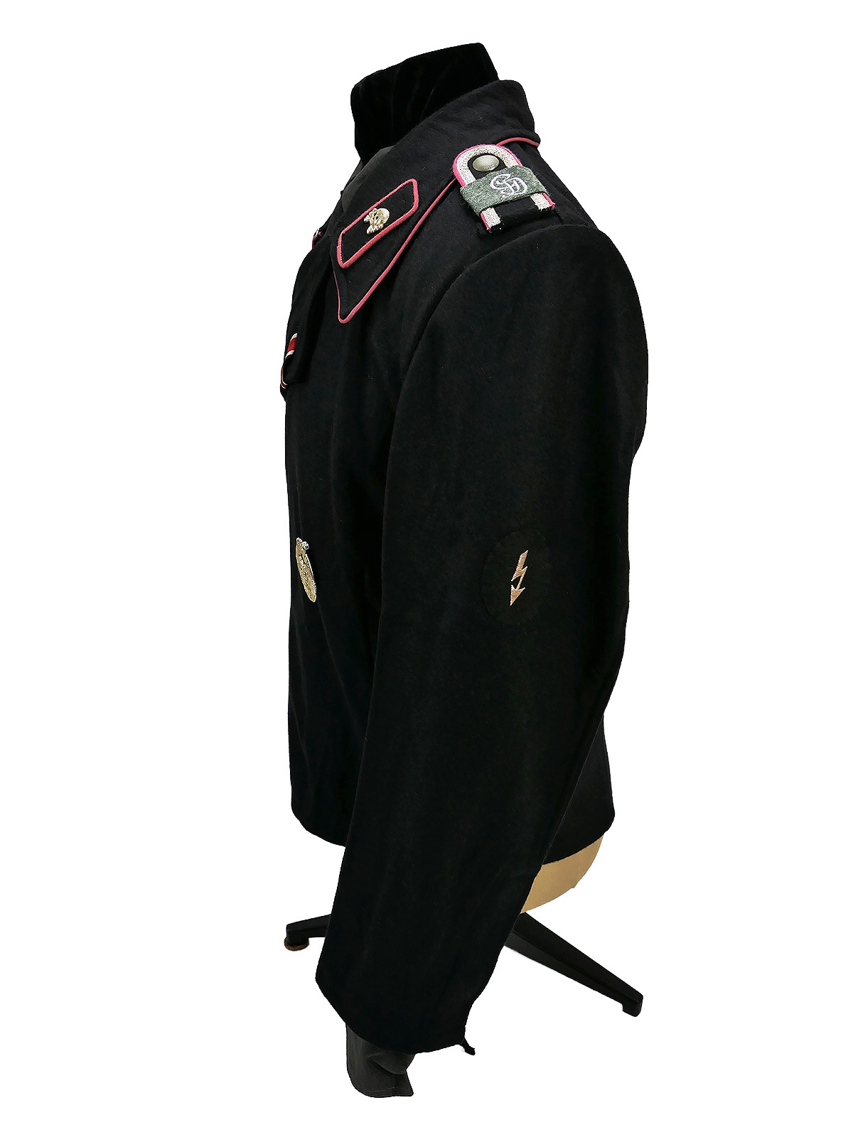 Die Panzerbluse besteht aus schwerem, tiefschwarzen Wolltuch im Schnitt der Wehrmacht mit Baumwollinnenfutter. Der Kragen ist geschönt mit einer Papell in der Waffenfarbe rosa für die Panzertruppe. Die Knopfleiste ist innen mit Seidenfutter ausgelegt. Die Jacke ist innen links und rechts mit Zugbändern ausgestattet damit die Bluse eng am Körper getragen werden kann. Auf der Bluse sind die Kragenspiegel vernäht deren Paspellierung in etwa den gleichen Farbton triff wie die am Kragen. Auf den Schulterstücken für einen Unteroffizier befinden sich Soffauflagen mit den Buchstaben "GD" für die vollmotorisierte Division "Großdeutschland". Auf der linken Brustseite befindet sich ein Panzerkampfabzeichen in "silber".