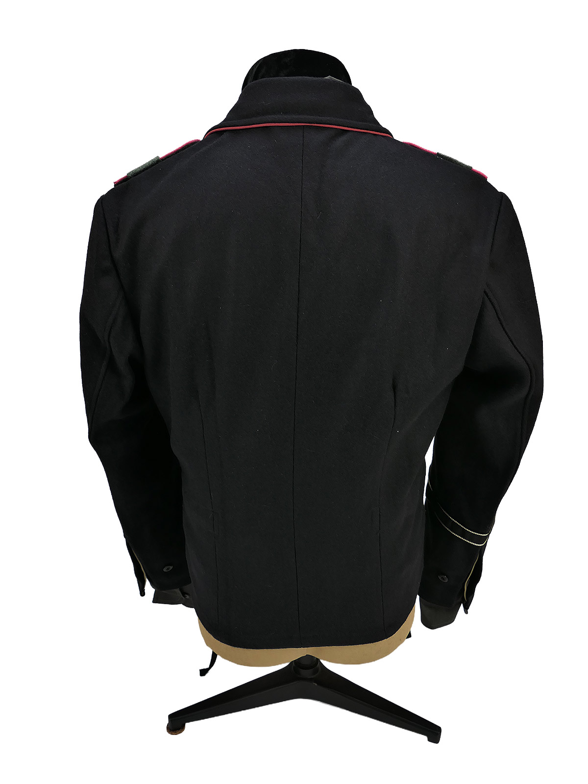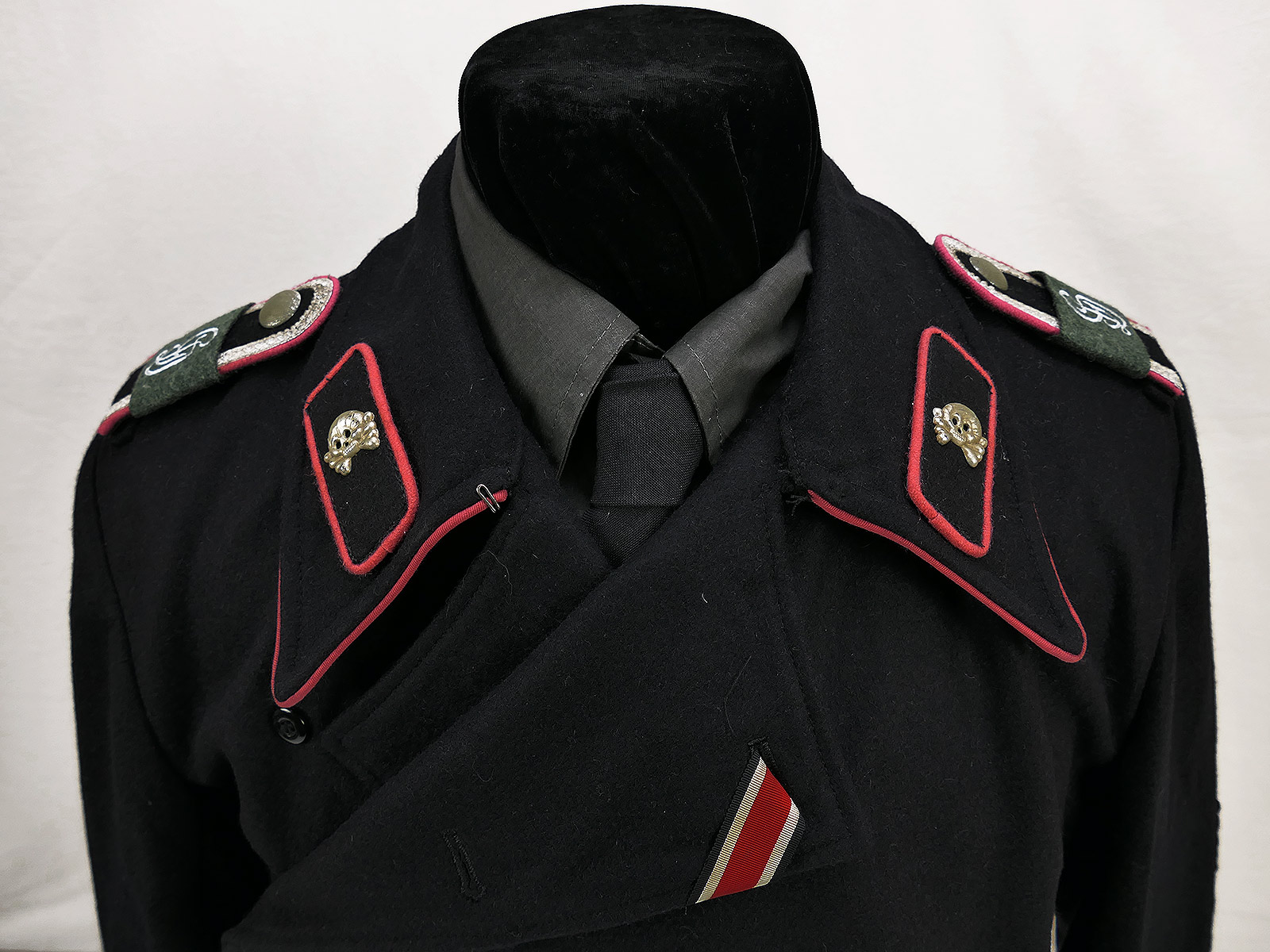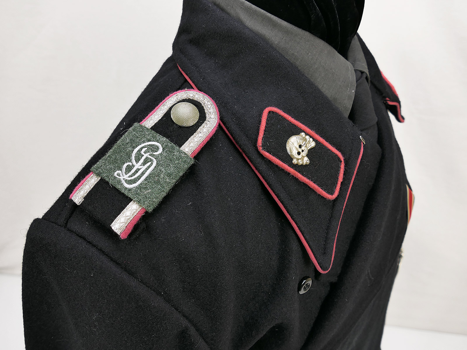 Die Panzerbluse besteht aus schwerem, tiefschwarzen Wolltuch im Schnitt der Wehrmacht mit Baumwollinnenfutter. Der Kragen ist geschönt mit einer Papell in der Waffenfarbe rosa für die Panzertruppe. Die Knopfleiste ist innen mit Seidenfutter ausgelegt. Die Jacke ist innen links und rechts mit Zugbändern ausgestattet damit die Bluse eng am Körper getragen werden kann. Auf der Bluse sind die Kragenspiegel vernäht deren Paspellierung in etwa den gleichen Farbton triff wie die am Kragen. Auf den Schulterstücken für einen Unteroffizier befinden sich Soffauflagen mit den Buchstaben "GD" für die vollmotorisierte Division "Großdeutschland". Auf der linken Brustseite befindet sich ein Panzerkampfabzeichen in "silber".
