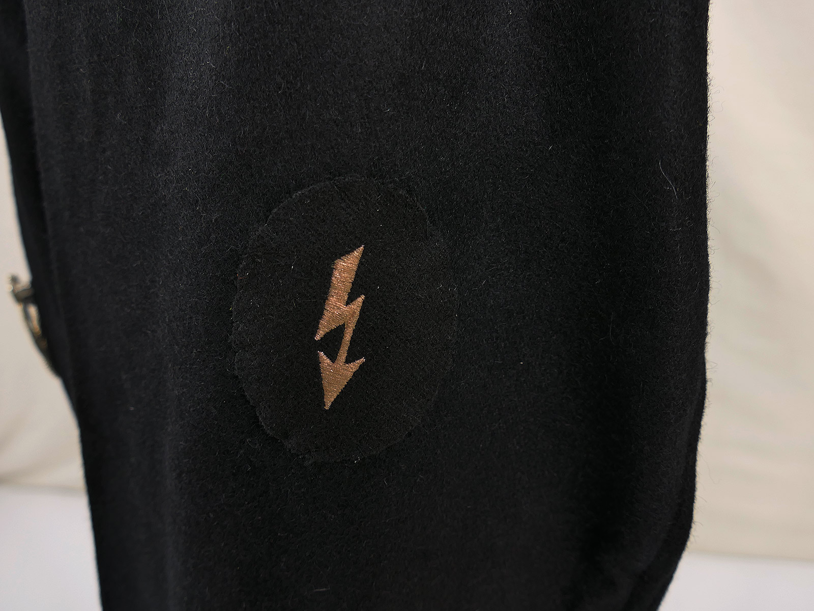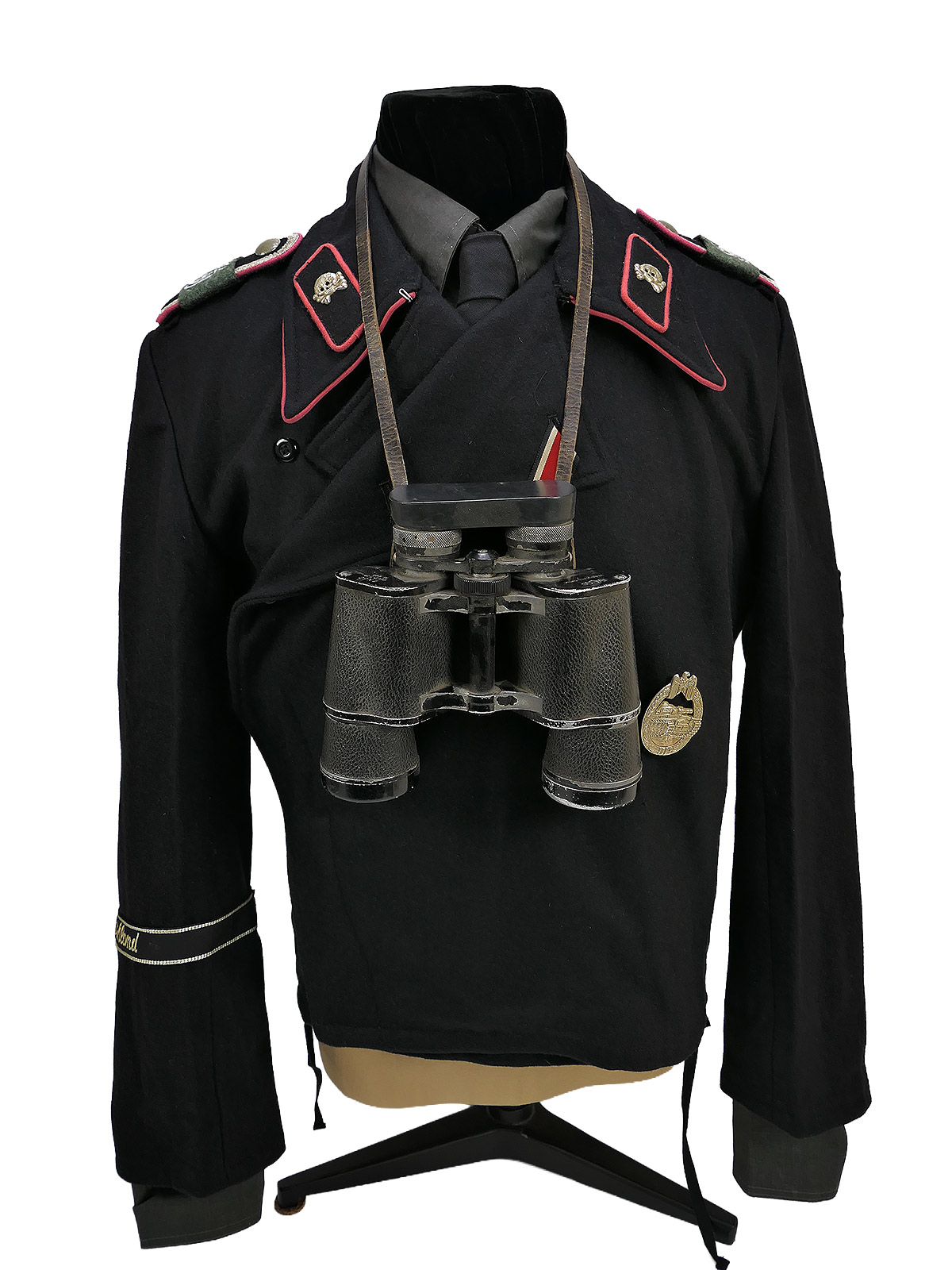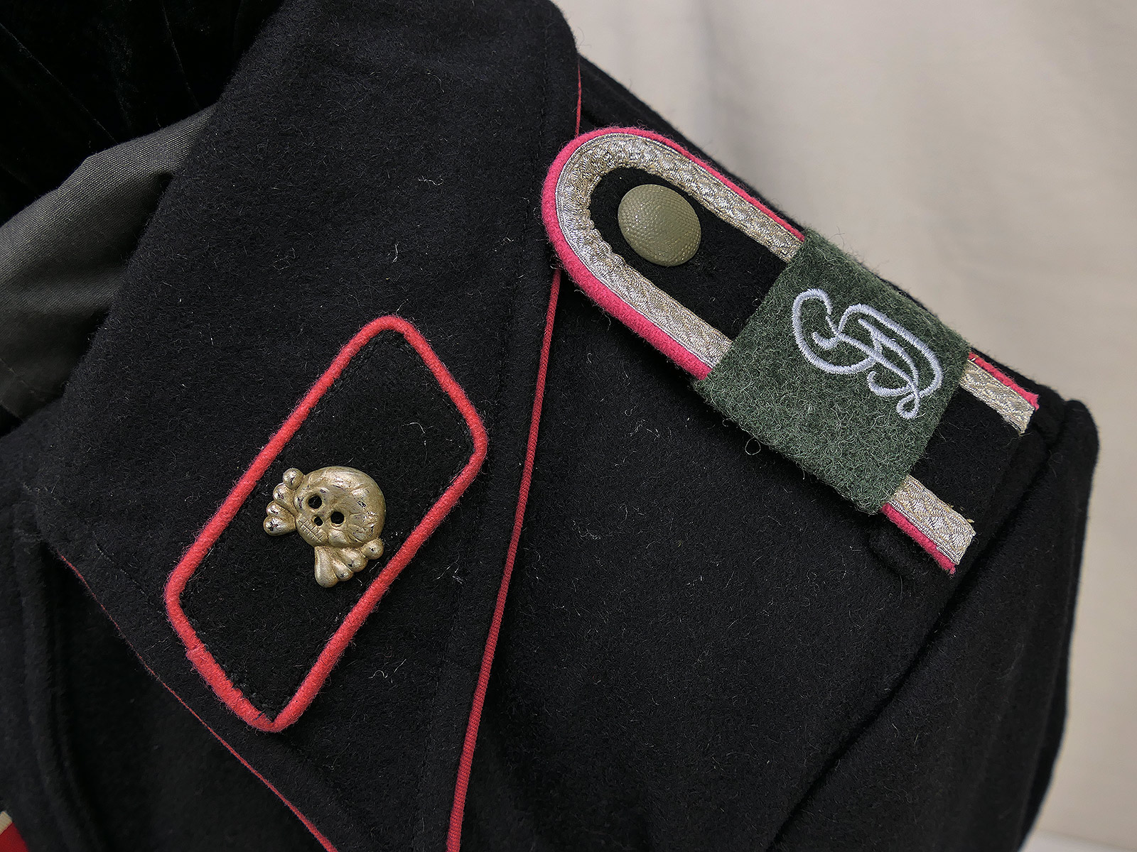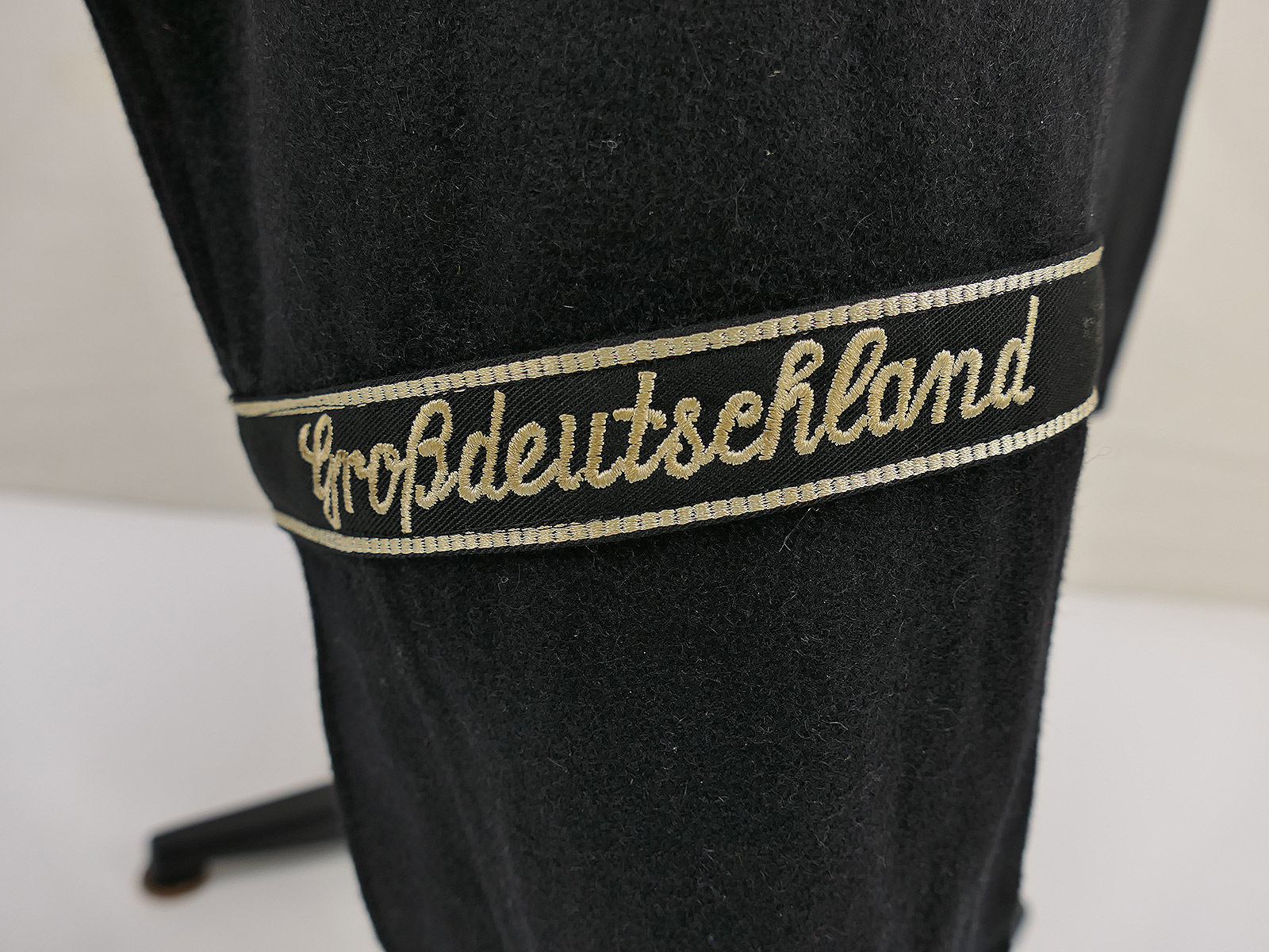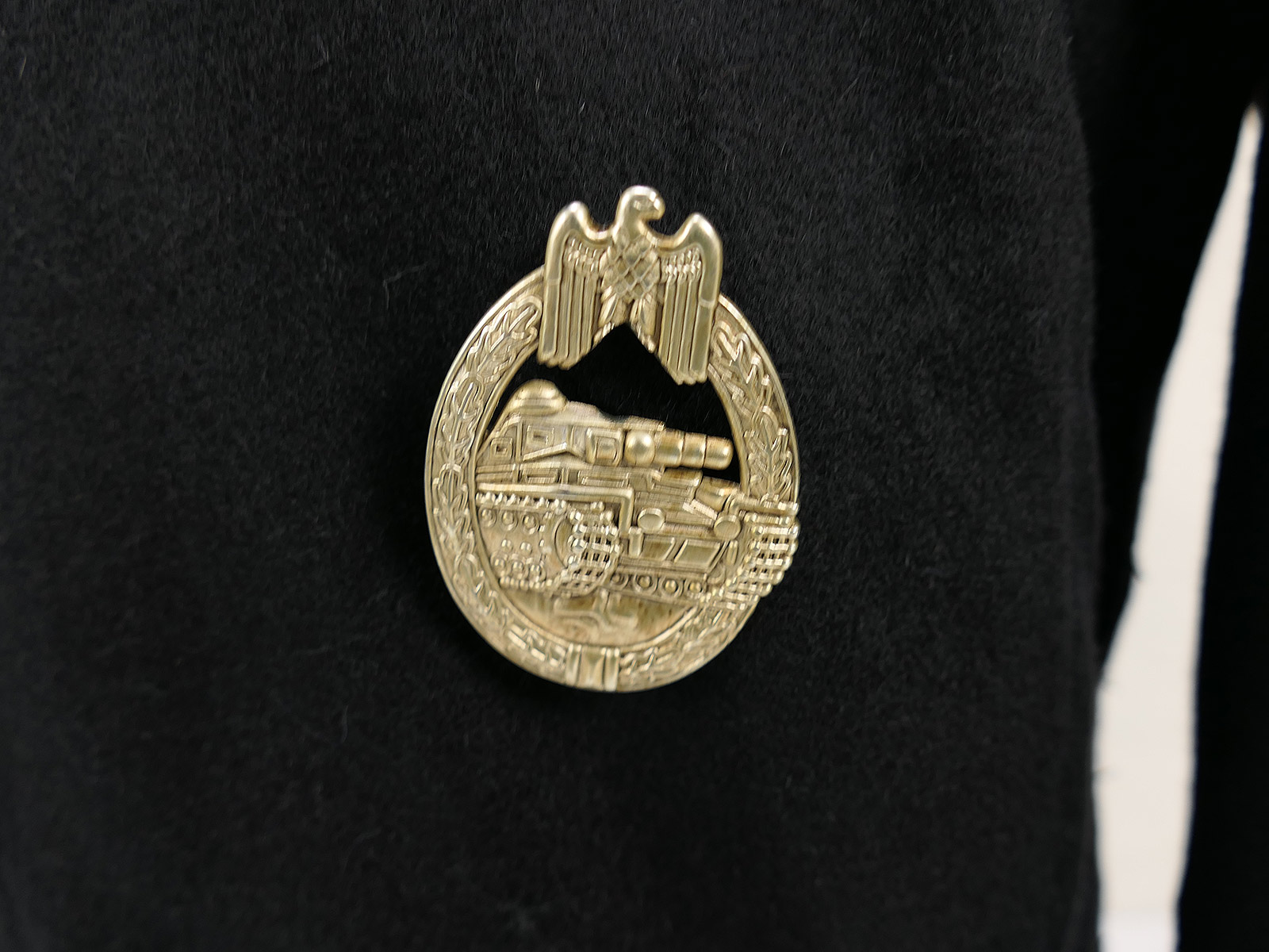 Am rechten Unterarm wurde das Ärmelband "Großdeutschland" vernäht in maschinengestickter Ausführung passend zur schwarzen Panzerbluse auf schwarzem Untergrund. Im Knopfloch befindet sich ein original Bandabschnitt vom Eisernen Kreuz 2. Klasse. Auf dem linken Oberarm befindet sich ein Funkerabzeichen.