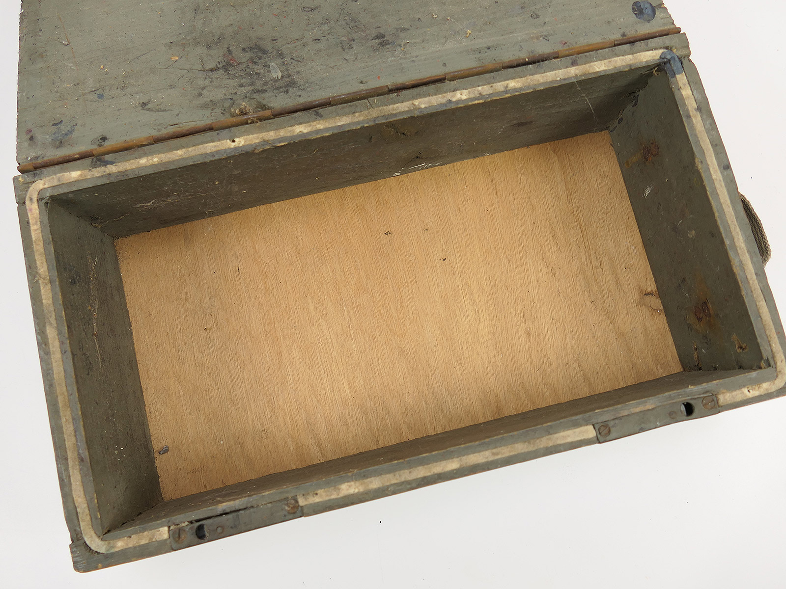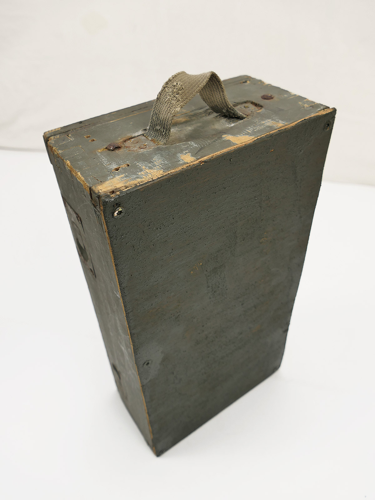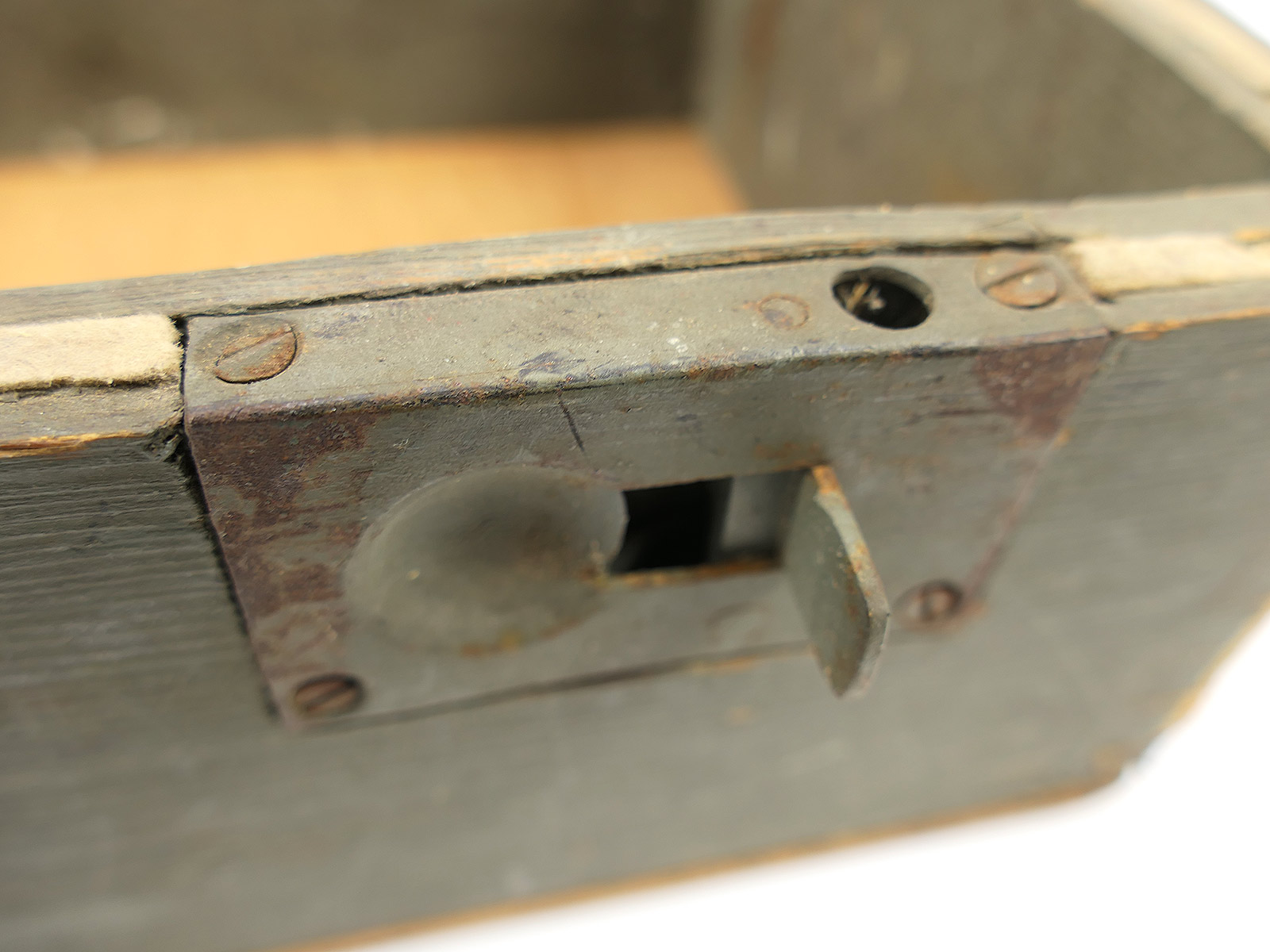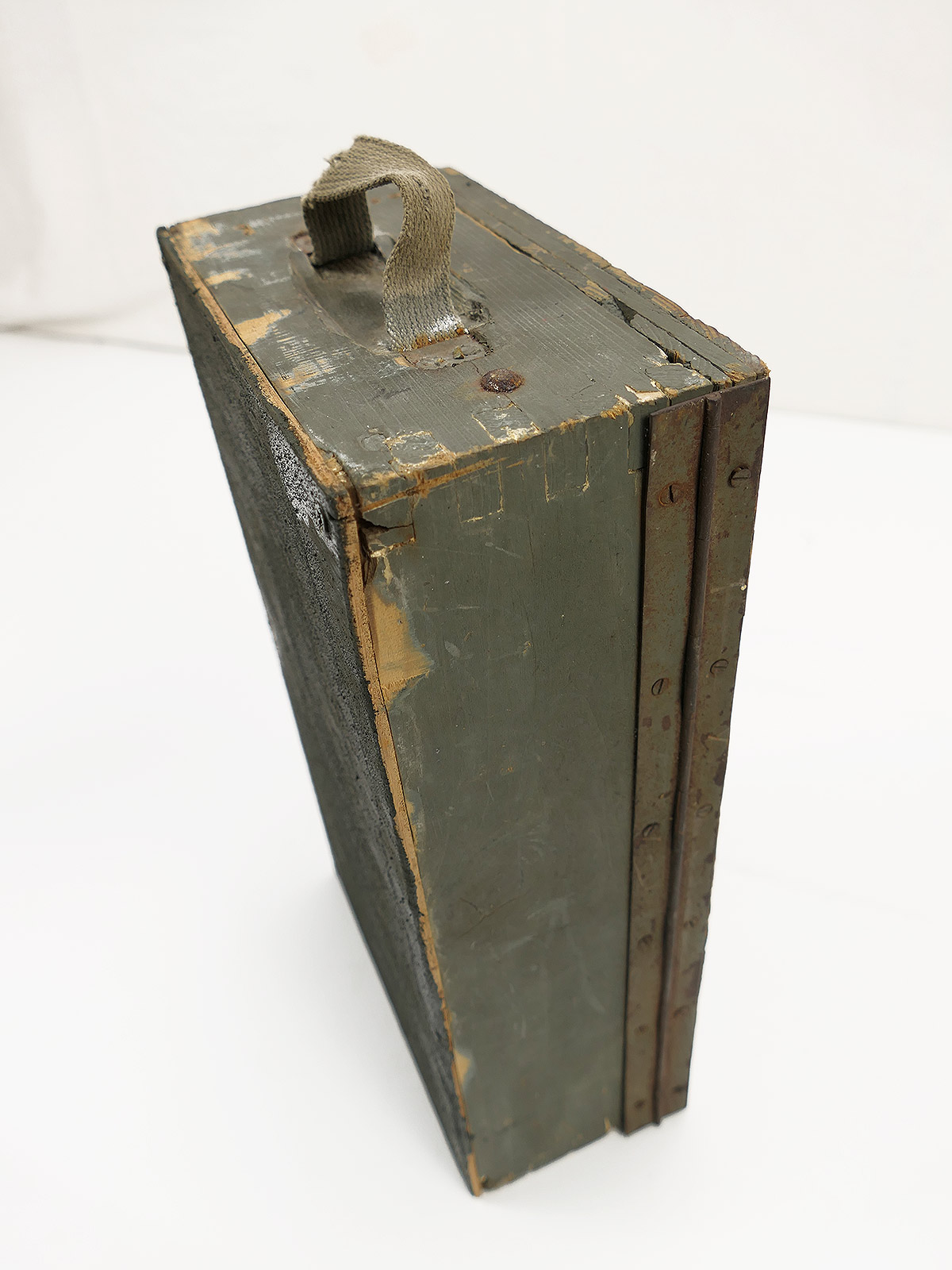 Verbandkasten der Wehrmacht, Boden repariert, Deckel nicht mehr arretierbar, da innen unvollständig.